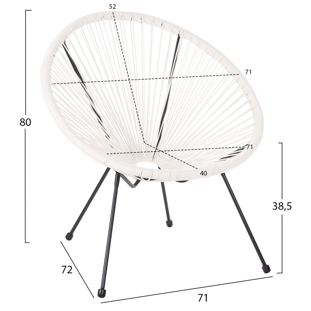 Професионалното кресло ACAPULCO е модерна, удобна и специална конструкция! По отношение на цвета, той е привлекателен с черната метална рамка, завършваща с 4 крака, и БЯЛАТА комп. Ратан, който образува гнездо, което е креслото. ACAPULCO ще се побере в много различни пространства благодарение на специалната си конструкция и със сигурност ще привлече всички погледи! РАЗМЕРИ: 71x72x80H см. Размери на седалката: 71x40 см. Размери на гърба: 51-71х52см. Височина на ръцете: 58 см. Височина на седалката: 38,5 см. Височина на крака: 35 см. Разстояние между краката: 55х56,5 см. Височина на крачола отзад: 37 см. МАТЕРИАЛИ НА КОНСТРУКЦИЯТА: Рамката, която завършва при краката на фотьойла е изработена от здрав метал. Цялата останала част от фотьойла е изработена от синтетичен ратан. Синтетичният ратан е синтетичен материал, изработен от PVC, т.е. висококачествени изкуствени влакна. Това дава отлична здравина и издръжливост при екстремни горещини или студени условия. ПОДДРЪЖКА: Благодарение на издръжливостта на синтетичния РАТАН, поддръжката на фотьойла е лесна. Освен редовното почистване от прах, можете да го избършете с влажна кърпа. НЕ използваме препарати, белина и лакове. Ако все пак се налага използването на перилен препарат, тогава използваме мек сапун с топла вода. НЕ използваме машина под налягане или маркуч с налягане, защото това ще повреди влакната. ПРЕДИМСТВА: •Здрава конструкция •Модерен дизайн •Лесен за поддръжка •Идеален както за открито, така и за закрито •Идеален за професионални помещения и дома •Невероятна стойност за парите *Продуктът се доставя несглобен ** Цветопредаването на продукта може леко да се различава от фотографското представяне на вашия екран.