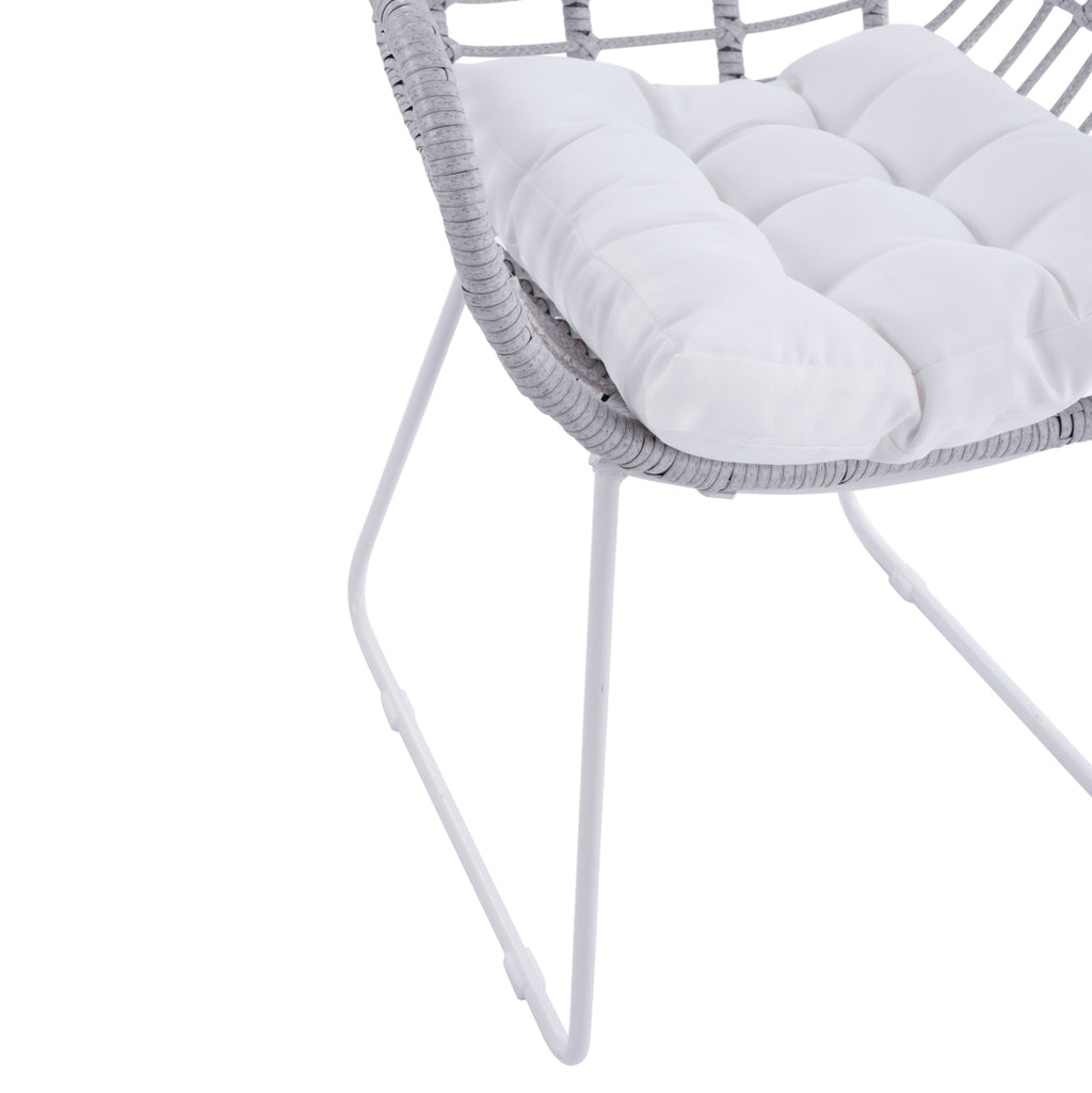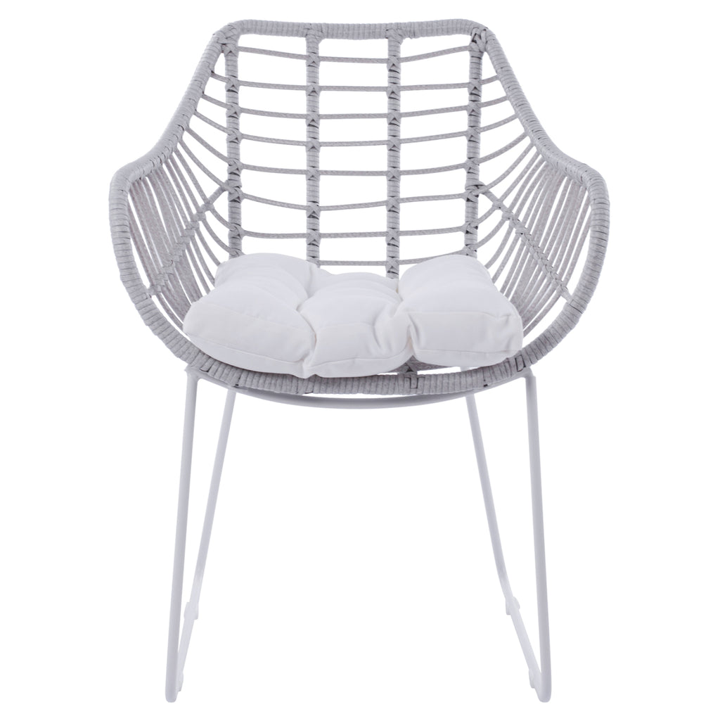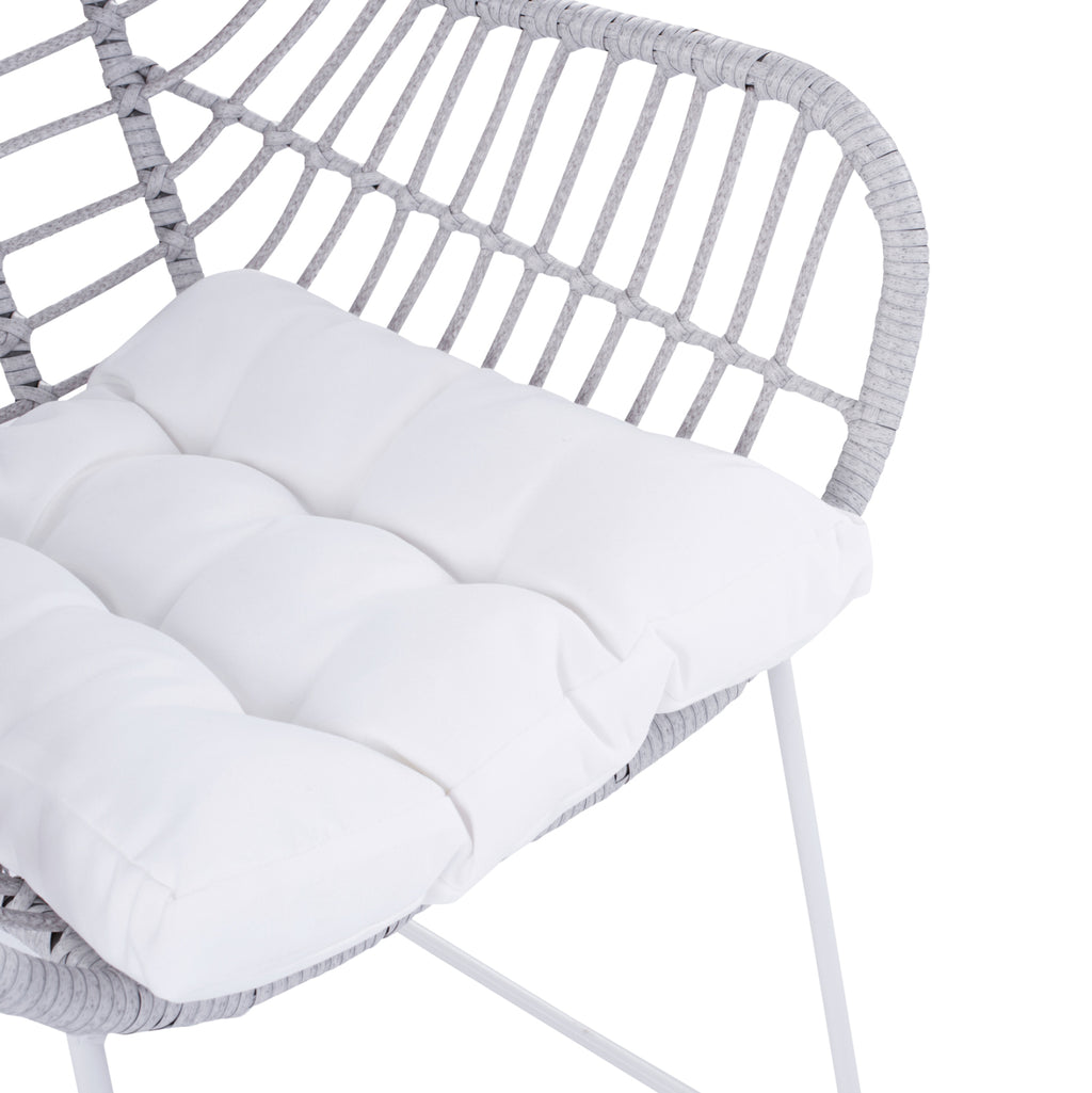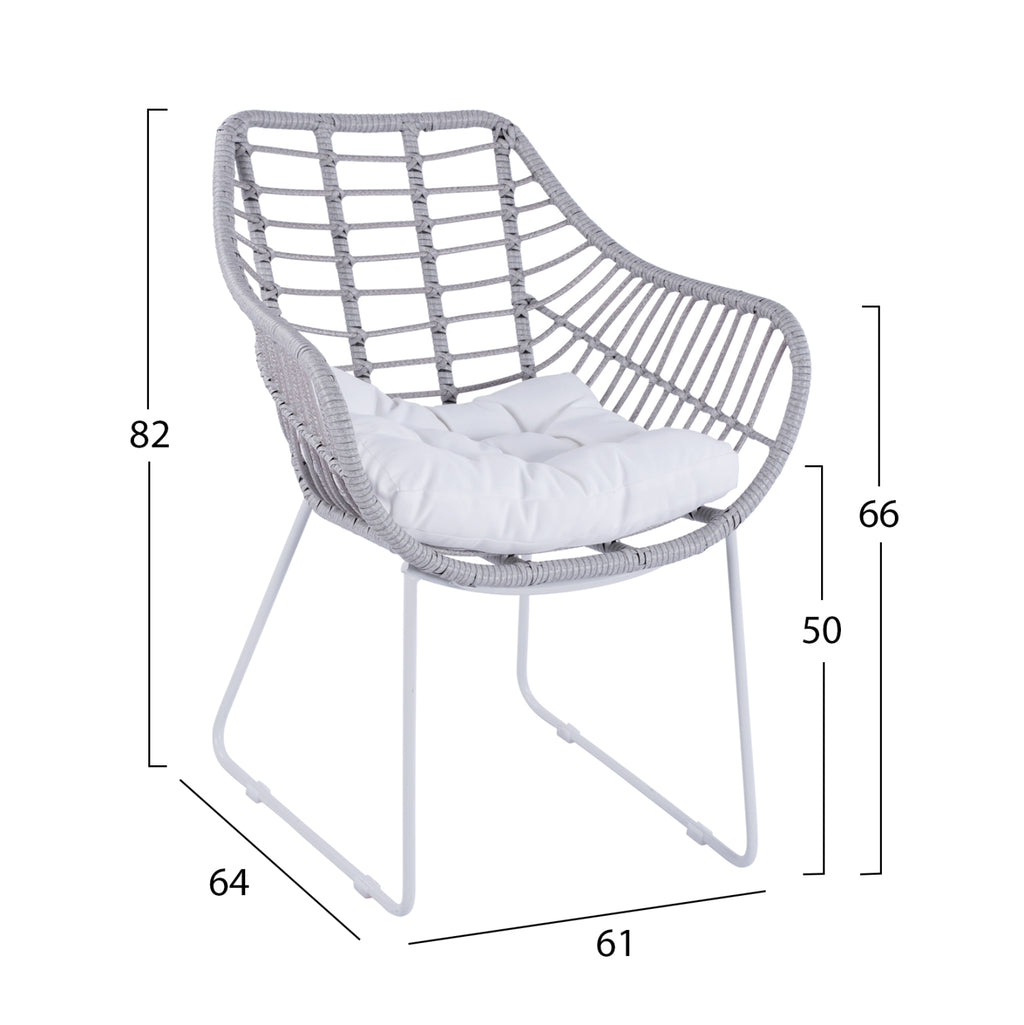 Модерно външно кресло, изработено от метална конструкция в бял матов нюанс и покрито с тъкана ракита в сив нюанс. Има и мръсно бяла текстилна pvc подложка с дебелина 7см. Ракитата има голяма устойчивост на високи и ниски температури от (-85c до +85c.), обогатена е и с UV стабилизатор за слънчевите лъчи. Идеален за трапезария, но и за вашия дом, той ще ви даде комфорт и почивка. Размери: 61х64х82см. Височина на седалката: 50см. Височина на седалката без възглавница: 43 см. Височина на ръцете: 66 см. Размери на седалката: 41х44 см.