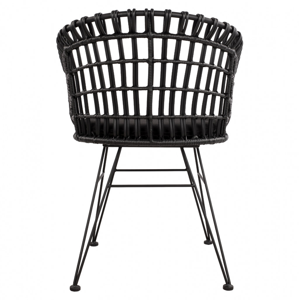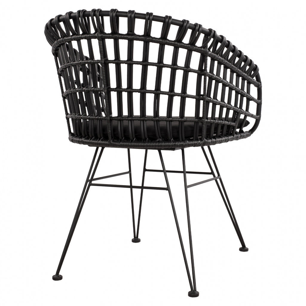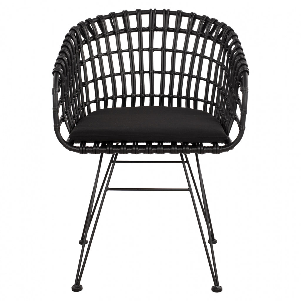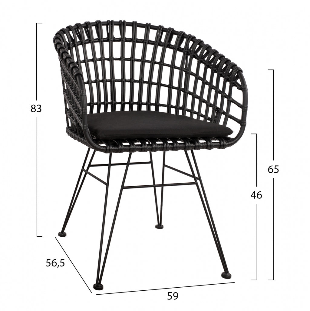 Модерно кресло тип гнездо за външно и вътрешно ползване, изработено от черна метална конструкция и покрито с плетена ракита. Има и платнена подложка в черно. Краката на стола са от масивно желязо. Ракитата има голяма устойчивост на високи и ниски температури от (-85c до +85c.), обогатена е и с UV стабилизатор за слънчевите лъчи. Идеален за трапезария, но и за вашия дом, той ще ви даде комфорт и почивка. Размери: 59х56,5х83см. Височина на седалката: 46 см. Височина на ръцете: 65см. Размери на седалката: 47х49 см.