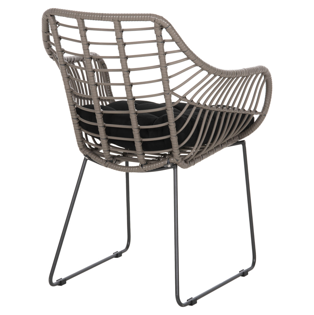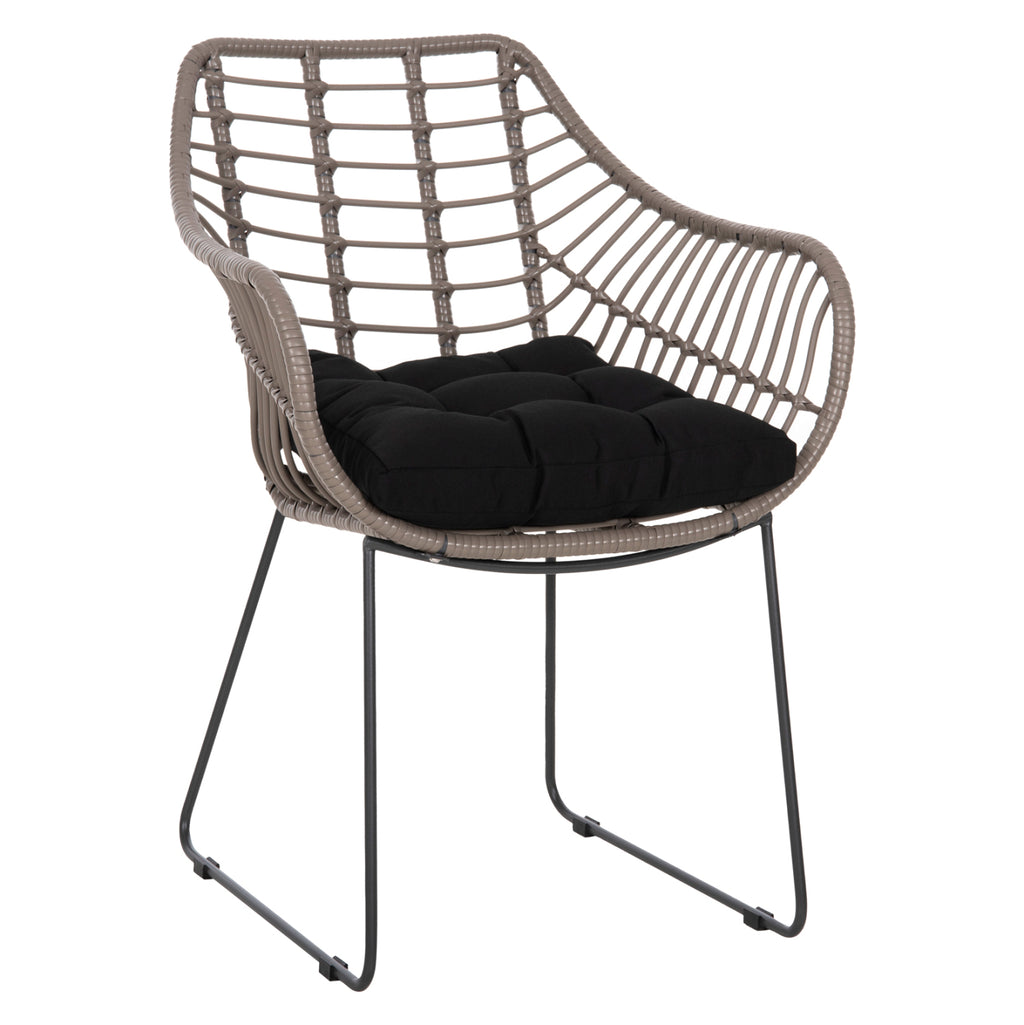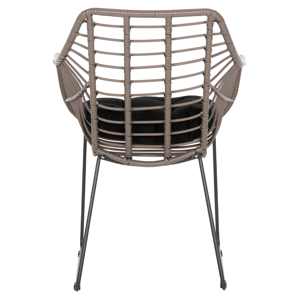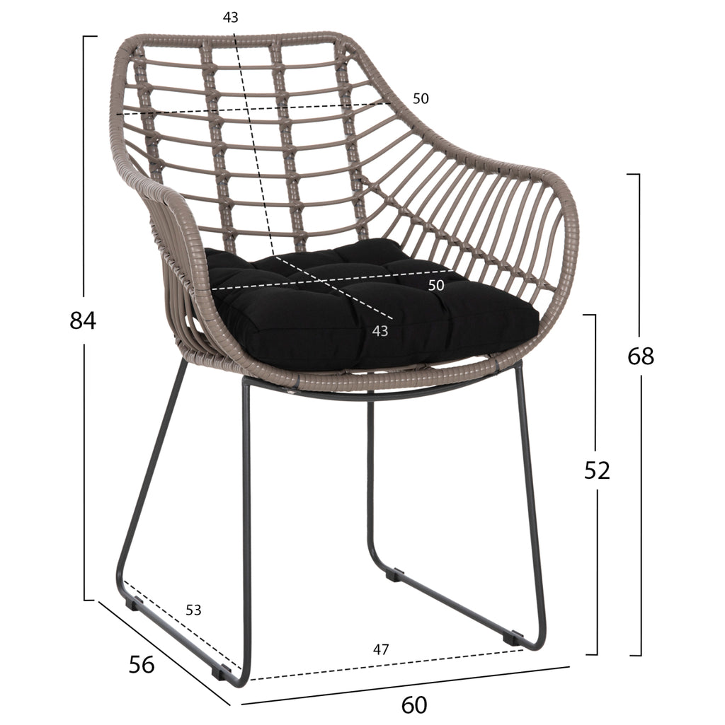 Модерно външно кресло, изработено от масивна метална конструкция в черен нюанс и покрито с ракита в мока сив нюанс. Има и черна полиестерна подложка. Ракитата има голяма устойчивост на високи и ниски температури от (-85c до +85c.), обогатена е и с UV стабилизатор за слънчевите лъчи. Идеален за трапезария, но и за вашия дом, той ще ви даде комфорт и почивка. Размери: 60х56х84см. Височина на седалката: 52см. Височина на ръцете: 68 см. Размери на седалката: 50х43 см. Размери на гърба: 50х43 см. Разстояние между краката: 47х53 см.
