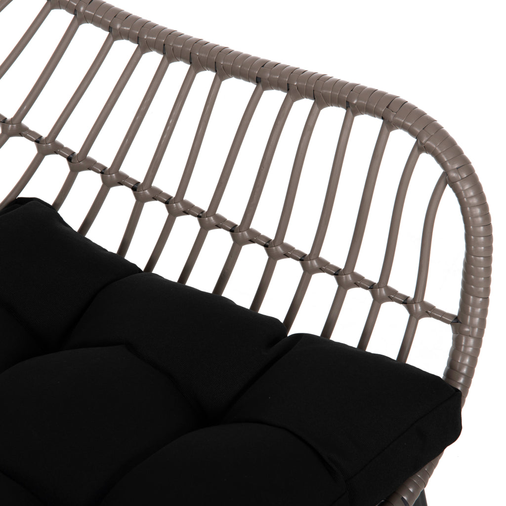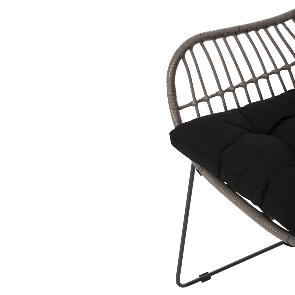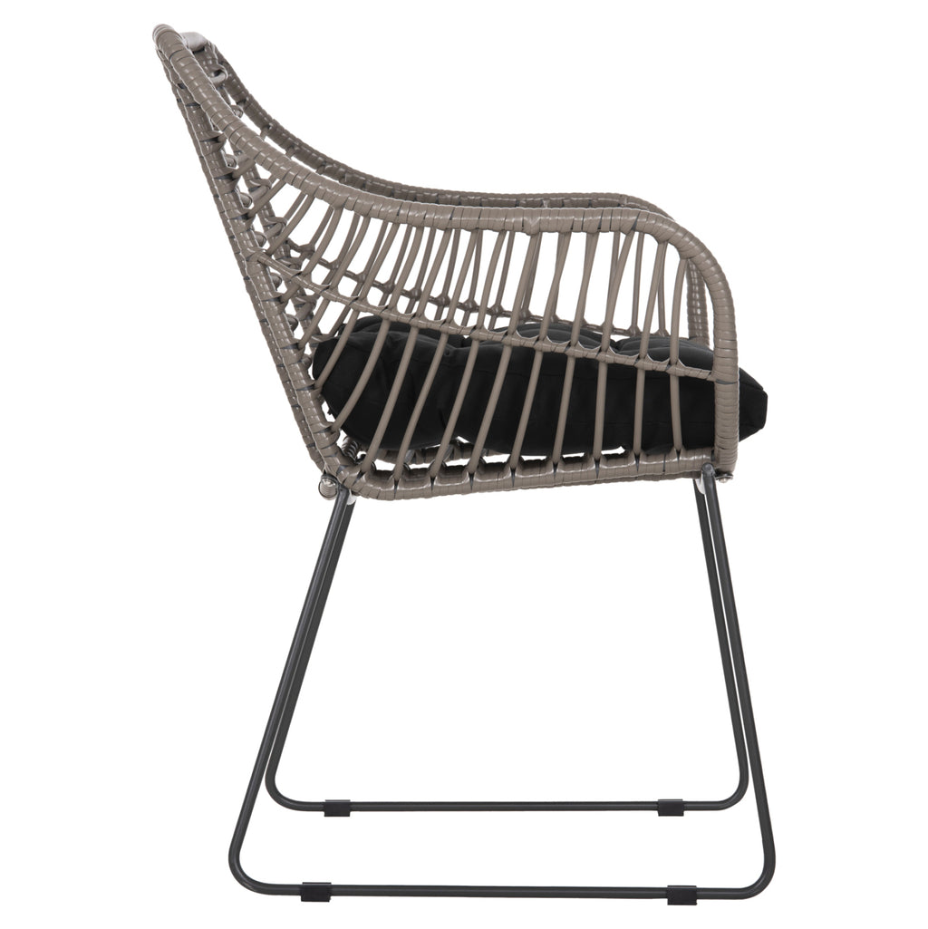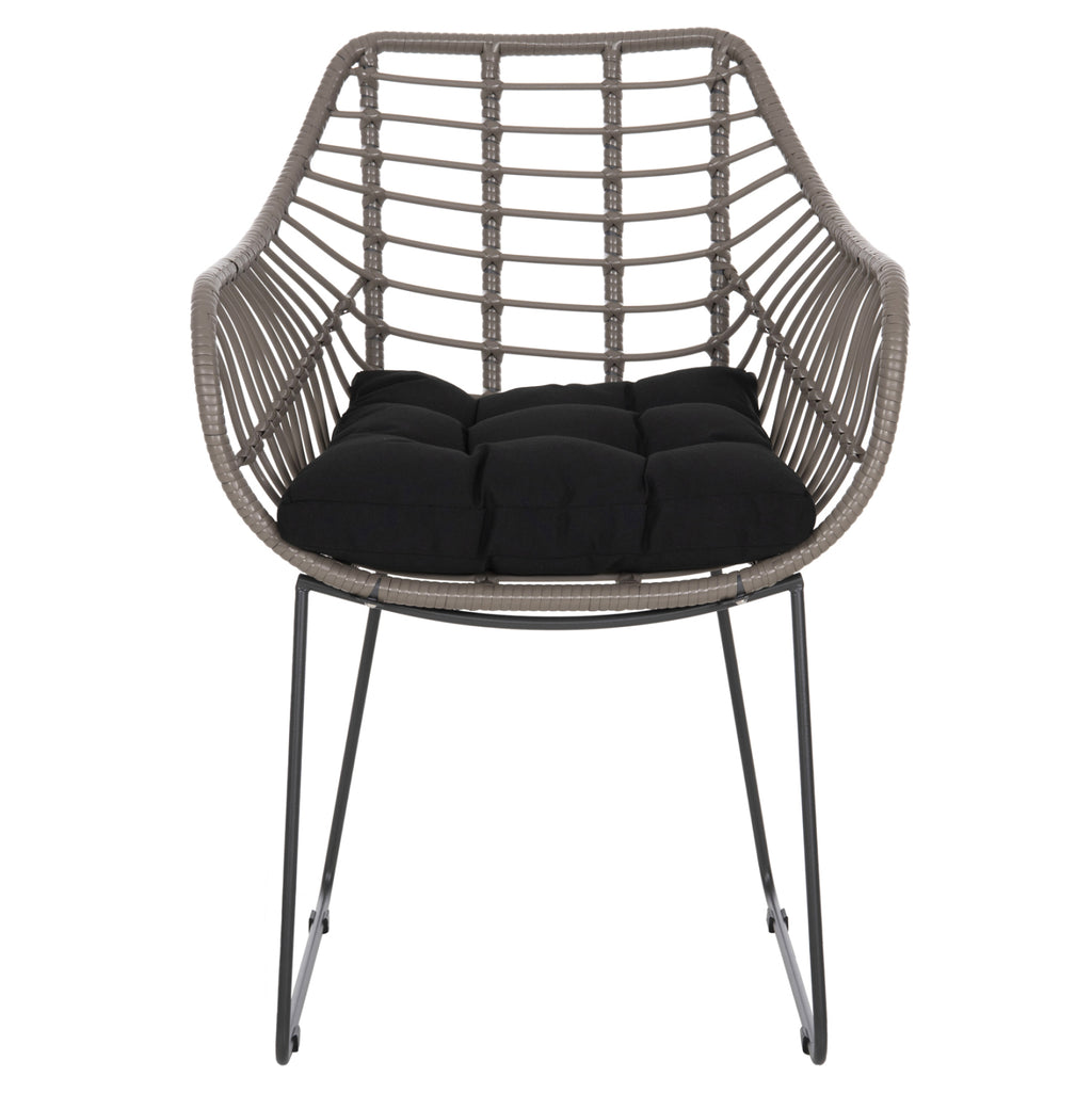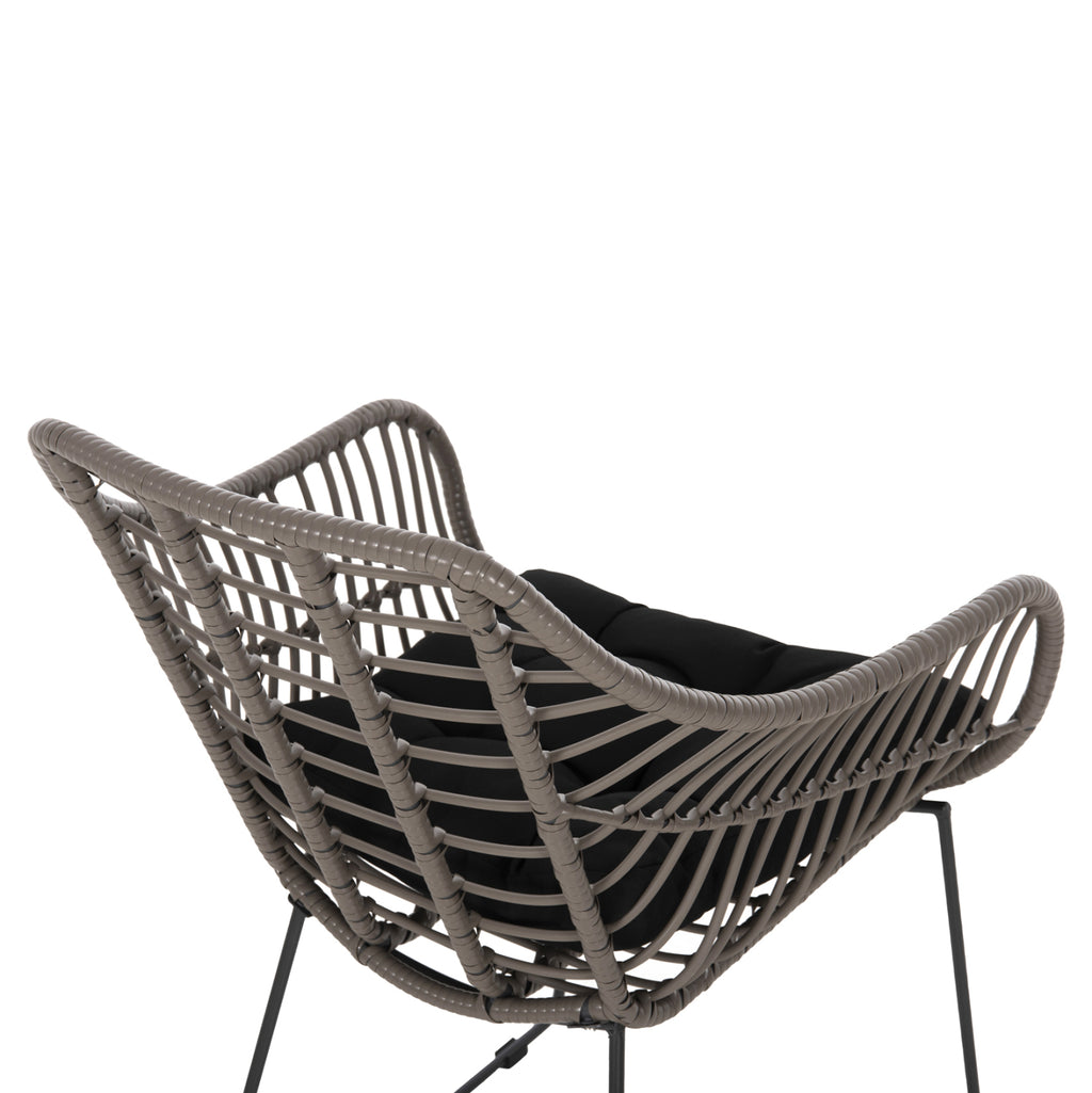 Модерно външно кресло, изработено от масивна метална конструкция в черен нюанс и покрито с ракита в мока сив нюанс. Има и черна полиестерна подложка. Ракитата има голяма устойчивост на високи и ниски температури от (-85c до +85c.), обогатена е и с UV стабилизатор за слънчевите лъчи. Идеален за трапезария, но и за вашия дом, той ще ви даде комфорт и почивка. Размери: 60х56х84см. Височина на седалката: 52см. Височина на ръцете: 68 см. Размери на седалката: 50х43 см. Размери на гърба: 50х43 см. Разстояние между краката: 47х53 см.