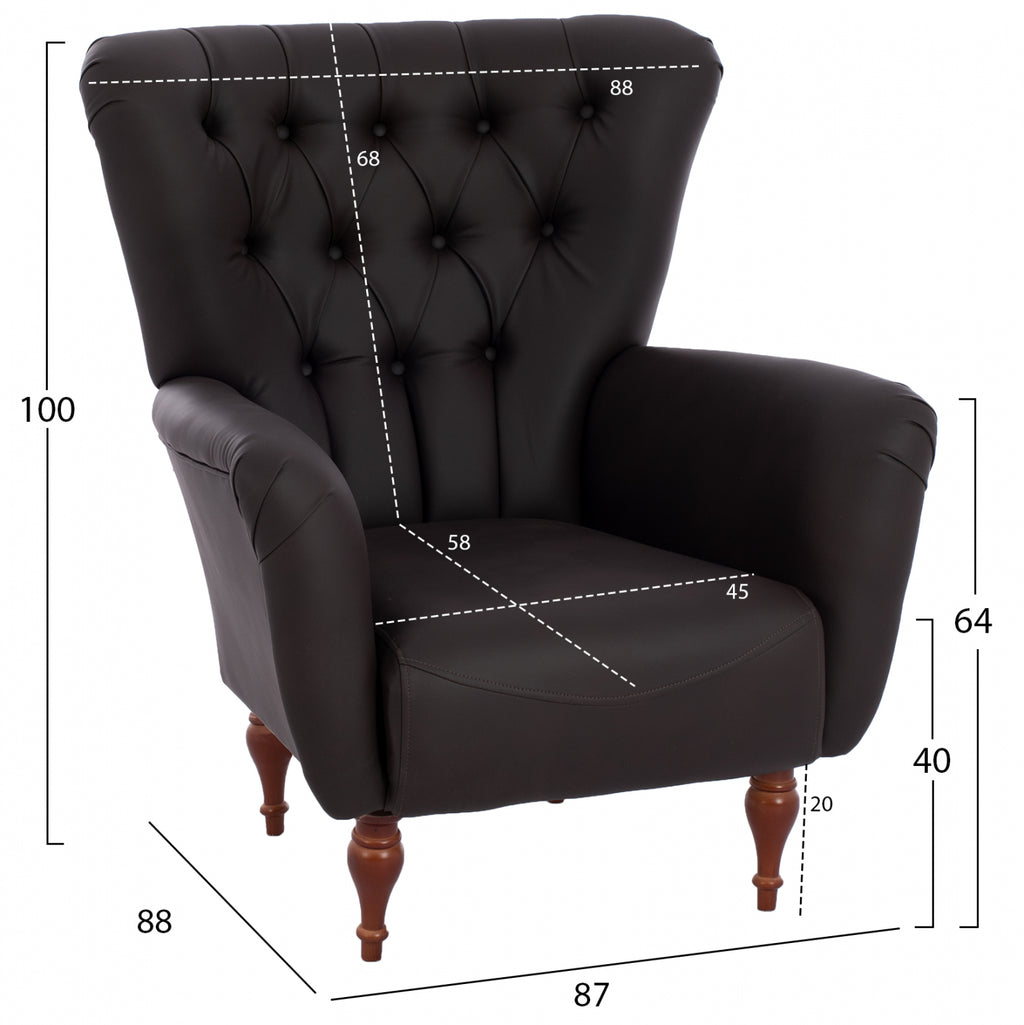 Това е КГ9217.03 BERGER в КАФЯВ цвят и полипропиленови крака в цвят орех. Характеристиката, която отличава това кресло е, че неговият дизайн в стил Chesterfield му придава усещане за престиж и лукс, където и да се използва. Основната характеристика на този стил е подплатата от PU кожа, която на гърба е в дълбок ватиран стил, обслужващ стила на Chesterfield. Мини история: Историята на Bergere (вижте bergere) започва някъде през 1720 г., в салоните на двореца Версай по времето на Луи XV, където се смяташе за седалище на благородството и висшата класа. Конструкцията му от специално дърво, съчетано с луксозните тъкани на времето, му придаваше усещането за трон. От ранните си години той се смяташе за кралицата на местата за сядане, както заради уединението, което предлагаше с отворените си ръце, висока облегалка и обърнати страни, така и заради доминирането си в пространството като декоративен елемент. Фотьойлът Berzera променя външния си вид през годините (в зависимост от сезона и модата). Облечена в материи на цветя, кожа, много различни шарки със специфични текстури, дори Честърфийлд. През годините може би сме виждали вариации на дизайна на bergere, ръцете бяха облечени, гърбът се повдигна, размерът на възглавницата се промени, но основната идея на голямото, удобно кресло никога не се е променила. Едно голямо удобно кресло често е по-добро от цял диван. Накратко...: Капитонирането е вид плат или техника на шиене, при която шевовете и втулките образуват различни шарки и гънки или неравности. При куилтинга материята е като "надуваема лодка", която се държи от шевовете, които на местата си "потъват" в тъканта. Тоест, много малки подпухнали издатини се създават в ватирането, които се открояват една от друга по шевовете. Тези неравности могат да бъдат диаманти, квадрати, ивици, както и много други дизайни. Целта на този стил е да разчупи монотонността чрез създаване на различни шарки върху тъканта. Това подобрява цялостния образ на обекта. Придава усещане за лукс, както и детайлност в дизайна. Характеристиките на стил Chesterfield са масивност, тапицерия от дълбока тъфтинг кожа или изкуствена кожа, ниска седалка и заоблени ъгли. Важно е да знаете, че под Честърфийлд имаме предвид стил мебели, а не конкретна марка мебели. РАЗМЕРИ: 87х88х100 см. Размери на седалката: 45х58 см. Размери на гърба: 88х68см. Височина на крака: 20 см. Височина на седалката: 40см. Височина на ръцете: 64см. МАТЕРИАЛИ НА КОНСТРУКЦИЯТА: Рамката на фотьойла е изработена от висококачествена дървесина, което му придава здравина и голяма издръжливост. Краката са дървени с резбован стил. "Пълнежите" на бергерето, както на облегалката, така и на седалката, са от дунапрени със средна твърдост, които предлагат по-добра опора на тялото. Подплатата е изработена от висококачествена PU кожа. Това е синтетична кожа и има ленена текстура. Синтетичната кожа е еволюцията на изкуствената кожа, но с основната характеристика, че не се различава лесно от окото от истинската кожа. Съставът му е основно полиуретан и полиамидни микровлакна, за разлика от изкуствената кожа, която основно съдържа PVC. ПОДДРЪЖКА: Благодарение на издръжливите строителни материали, фотьойлът е удобен за употреба. По-специално PU кожата не се нуждае от специална поддръжка, защото не се износва лесно, не показва "стрии" и цветът не се влияе от слънчевата радиация. Едно минаване с мека вла