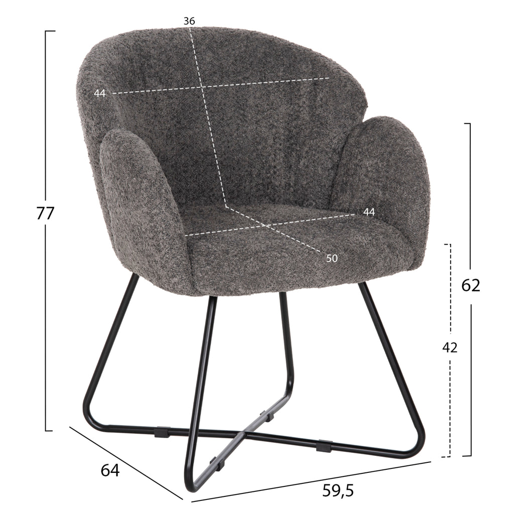 Кресло HARNIS е модерно и удобно. Доминиращият цвят е СИВ, а вместо крака има основа в кръстосано разположение и черен цвят. Тапицерията на фотьойла е изработена от топла дамаска BOUQUEL, която ще придаде различен вид на вашето пространство. Това е красиво предложение, което ще пасне почти навсякъде! РАЗМЕРИ: 59.5х64х77 см. Височина на седалката: 42 см. Височина на ръцете: 62 см. Размери на седалката: 44х50 см. Размери на гърба: 44х36см. Разстояние между краката: 47-51x47-51 см. Височина на крака: 37 см. Височина на крака отзад: 47-51 см. МАТЕРИАЛИ НА ИЗРАБОТКА: Краката на фотьойла са метални с електростатична боя. Електростатичното боядисване е процес на сухо покритие, използван като метално покритие. Електростатичното боядисване е нанасяне на сух прах чрез електростатичен процес, който след това се „свързва“ към метала чрез топлина. Подходящ е както за вътрешни, така и за външни приложения. Подплатата е изработена изцяло от дамаска BOUCLÉ. Всяка тъкан, която има извиване на възел, се нарича букле. Изработено е от почти всички суровини (въпреки че обикновено е синтетично) със специални възли или силно усукани конци, така че да има къдрава повърхност. Не се мачка и може да бъде изчистена, меланжирана, карирана или туид. ПОДДРЪЖКА: Платът от букле можете да избършете с прахосмукачка, а при петна използвайте леко влажна кърпа. ПРЕДИМСТВА: •Здрава конструкция •Модерен дизайн •Отличителна визия с топлата и мека материя от букле •Невероятна стойност за парите •Лесен за сглобяване с инструкции *Продуктът се доставя във фабрична опаковка несглобен ** Цветопредаването на продукта може леко да се различава от фотографското представяне на вашия екран.