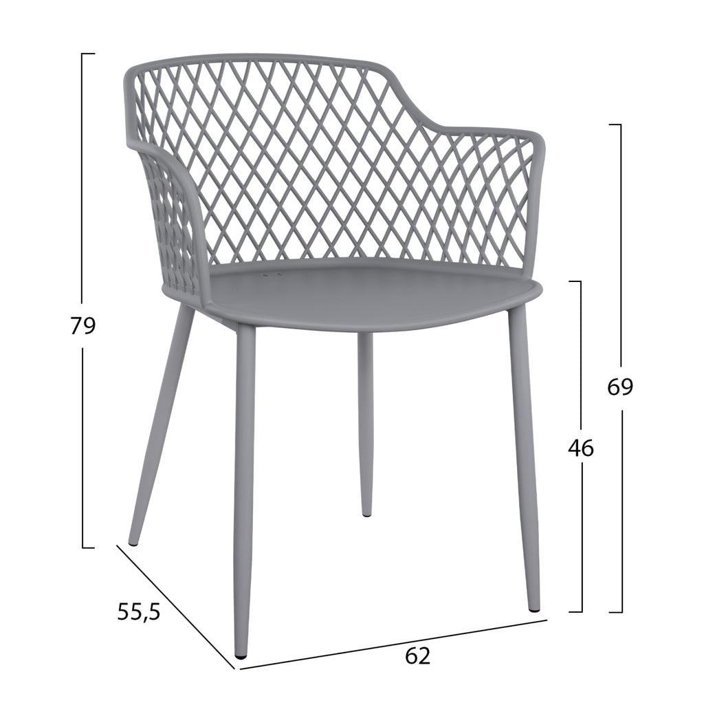 В зависимост от декорацията на вашия дом, можете да намерите правилните мебели, които ще съставят една красива и модерна трапезария. Конструкцията на кресло JOCELYN е изработена от полипропилен и метал в сив нюанс. Краката са метални за по-голяма издръжливост. Размери: 62х55,5х79см. Височина на седалката: 46 см. Височина на ръцете: 69 см. Размери на седалката: 49х44 см.