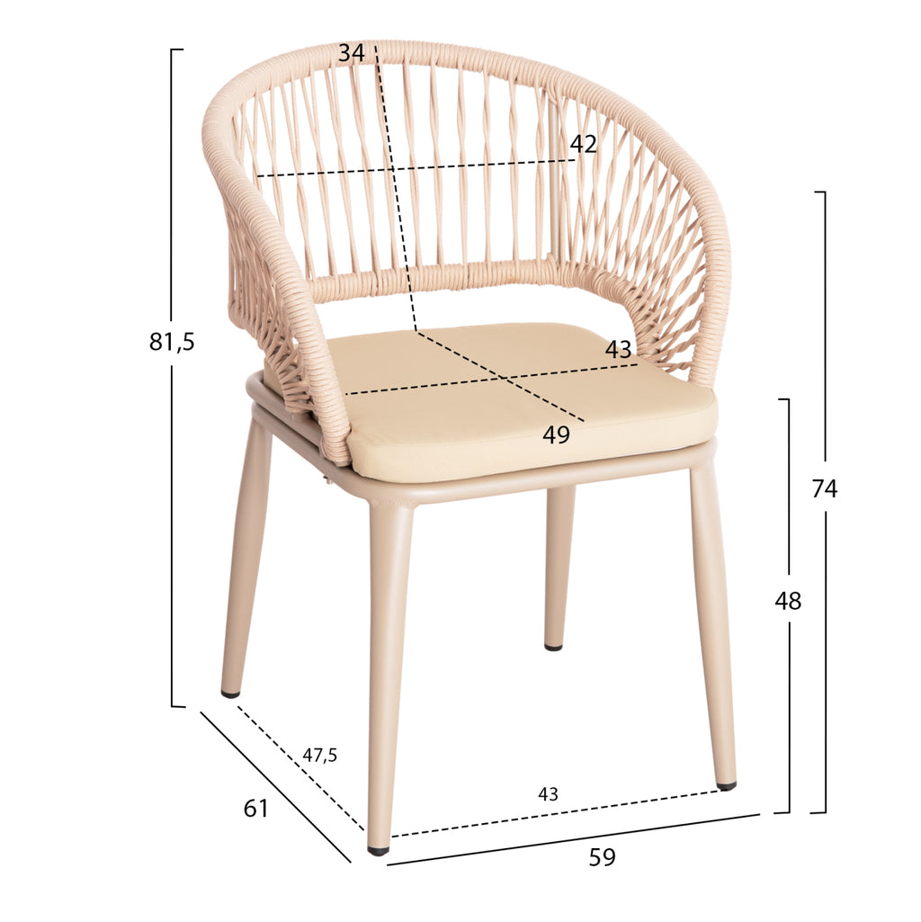 Фотьойлът MAGNET е проектиран да обгръща тялото благодарение на полукръглата облегалка, която е покрита с териленово полиестерно въже в цвят CAPPUCCINO. Възглавницата на седалката я прави комфортна и удобна. Рамката е изработена от алуминий в СВЕТЛО СИВ цвят. Също така, фактът, че може да се подрежда една върху друга, го прави особено практичен, тъй като можете да го съхранявате на възможно най-малко място. РАЗМЕРИ: 59x61x81.5H см. Размери на седалката: 43х49 см. Размери на гърба: 42х34см. Височина на ръцете: 74 см. Височина на седалката: 48см. Височина на крака: 40 см. Разстояние на краката: 47.5-43x52-47.5см. Размери на алуминия: Φ19x1.2mm-----Φ38x1.5mm Размер на териленовото въже: 6mm МАТЕРИАЛИ НА КОНСТРУКЦИЯТА: Рамката на фотьойла е изработена от алуминий, боядисан с електростатична боя. Алуминият е „зелен“ материал, който може да се рециклира неограничено време, като запазва характеристиките си без влошаване на качеството. По своята същност е устойчив на корозия. Информация: Електростатичното боядисване е процес на сухо покритие, използван като метално покритие. Електростатичното боядисване е нанасяне на сух прах чрез електростатичен процес, който след това се „свързва“ към метала чрез топлина. Въжето е полиестерно и е особено леко, но и издръжливо. ПОДДРЪЖКА: Освен редовно почистване от прах, можете да го забърсвате с влажна кърпа. ** Цветопредаването на продукта може леко да се различава от неговото фотографско представяне на вашия екран.