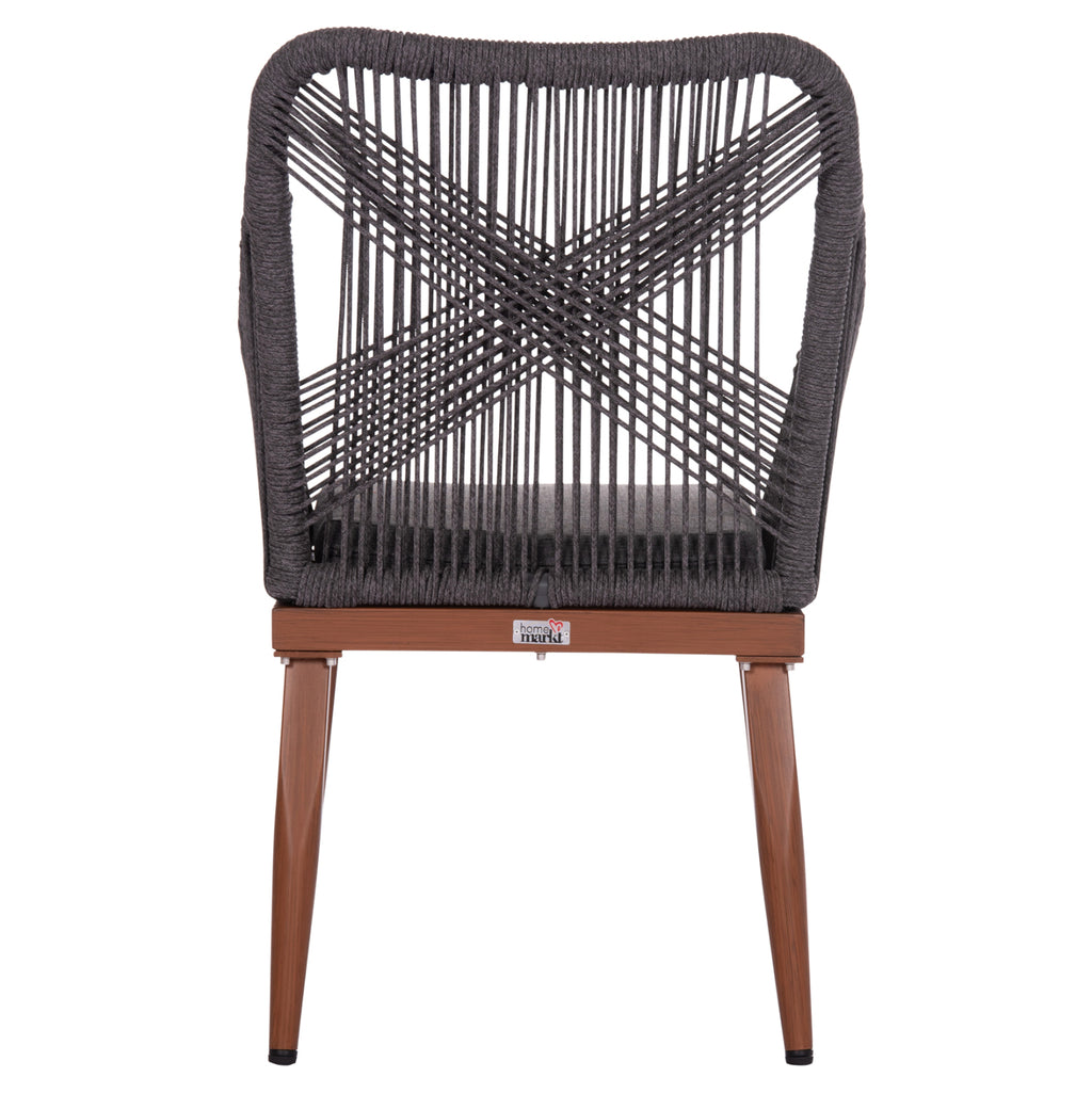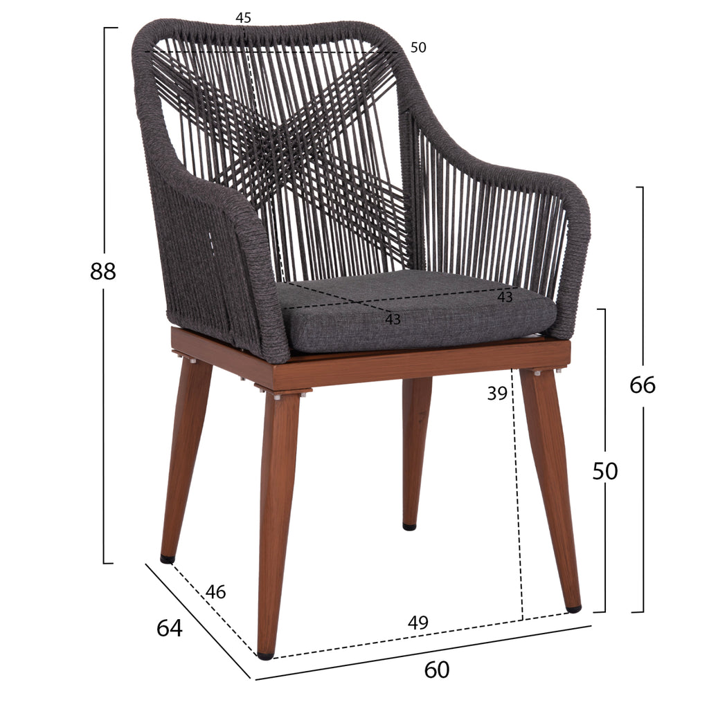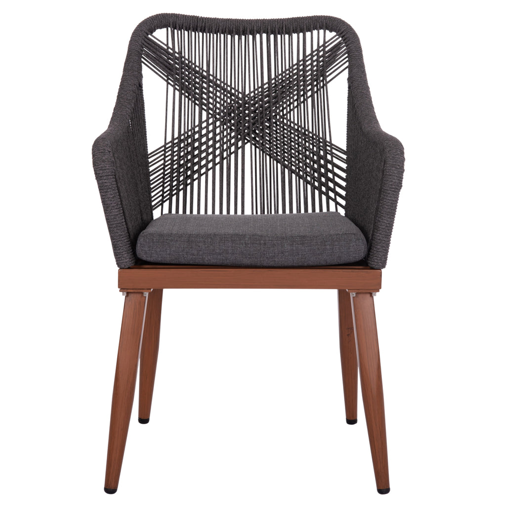 Търсите елегантно и удобно решение за обзавеждане на открито? Това модерно външно кресло с алуминиева конструкция в цвят орех и плетено въже в сив нюанс е създадено с внимание към детайла и удобството. Комбинацията от висококачествени материали и изчистен дизайн го правят подходящо както за трапезария на открито, така и за уютен кът в градината, верандата или балкона.