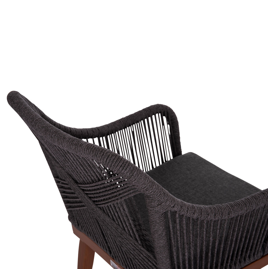 Гърбът и ръкохватките са покрити с плетено въже в сив нюанс, което създава изискан и модерен външен вид. Освен естетика, това решение осигурява и допълнителен комфорт и проветрение в горещите дни. Креслото включва и удобна сива възглавница с дебелина 5 см, изработена от плат, устойчив на външни условия.