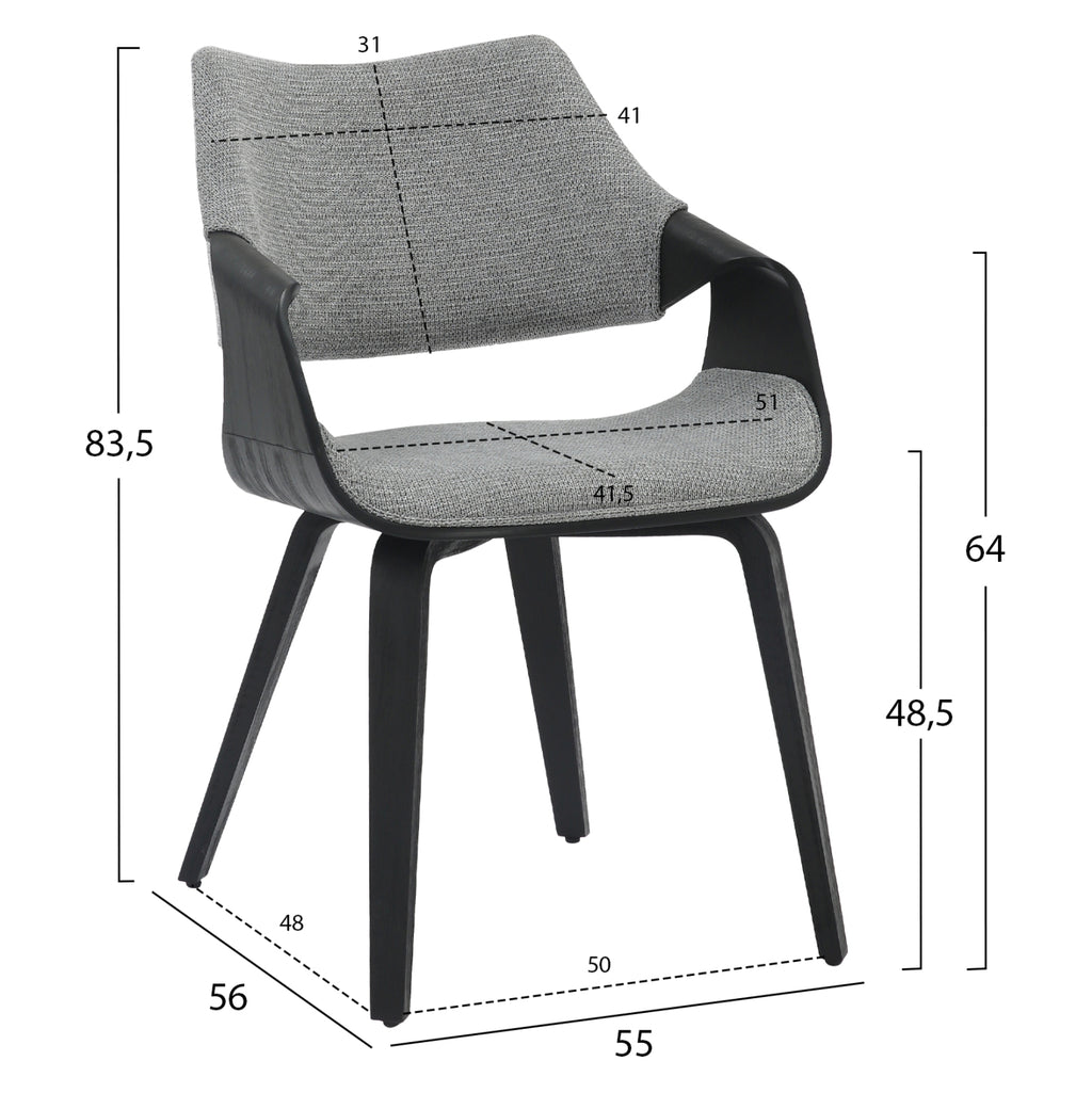 Трапезен стол NETTO със своя модерен дизайн ще впечатли. Изработена е от шперплат в четкан ЧЕРЕН нюанс, а облегалката и седалката са покрити със СИВА материя. Комбинирайте го с хубава маса и създайте красива и качествена трапезария. РАЗМЕРИ: 55x56x83.5H см. Височина на седалката: 48,5 см. Височина на ръцете: 64 см. Размери на седалката: 51х41,5 см. Размери на гърба: 41х31см. Разстояние между краката: 50х48 см. МАТЕРИАЛИ НА КОНСТРУКЦИЯТА: Цялата рамка на стола е изработена от морски шперплат. Състои се от тънки листове дърво, които са челно заварени заедно за допълнителна здравина. ПОДДРЪЖКА: Необходимо е само почистване от прах и при необходимост почистване с влажна кърпа. КАКВО ХАРЕСВАМЕ: •Съотношение качество-дизайн-цена •Качествено покритие и сглобяване •Прекрасен двуцветен *Продуктът се доставя немонтиран във фабрична опаковка **Точното цветопредаване на продукта може леко да се различава от действителния продукт поради различните настройки на всеки монитор. ***Този продукт е произведен по най-високи стандарти и е подходящ за професионална употреба.