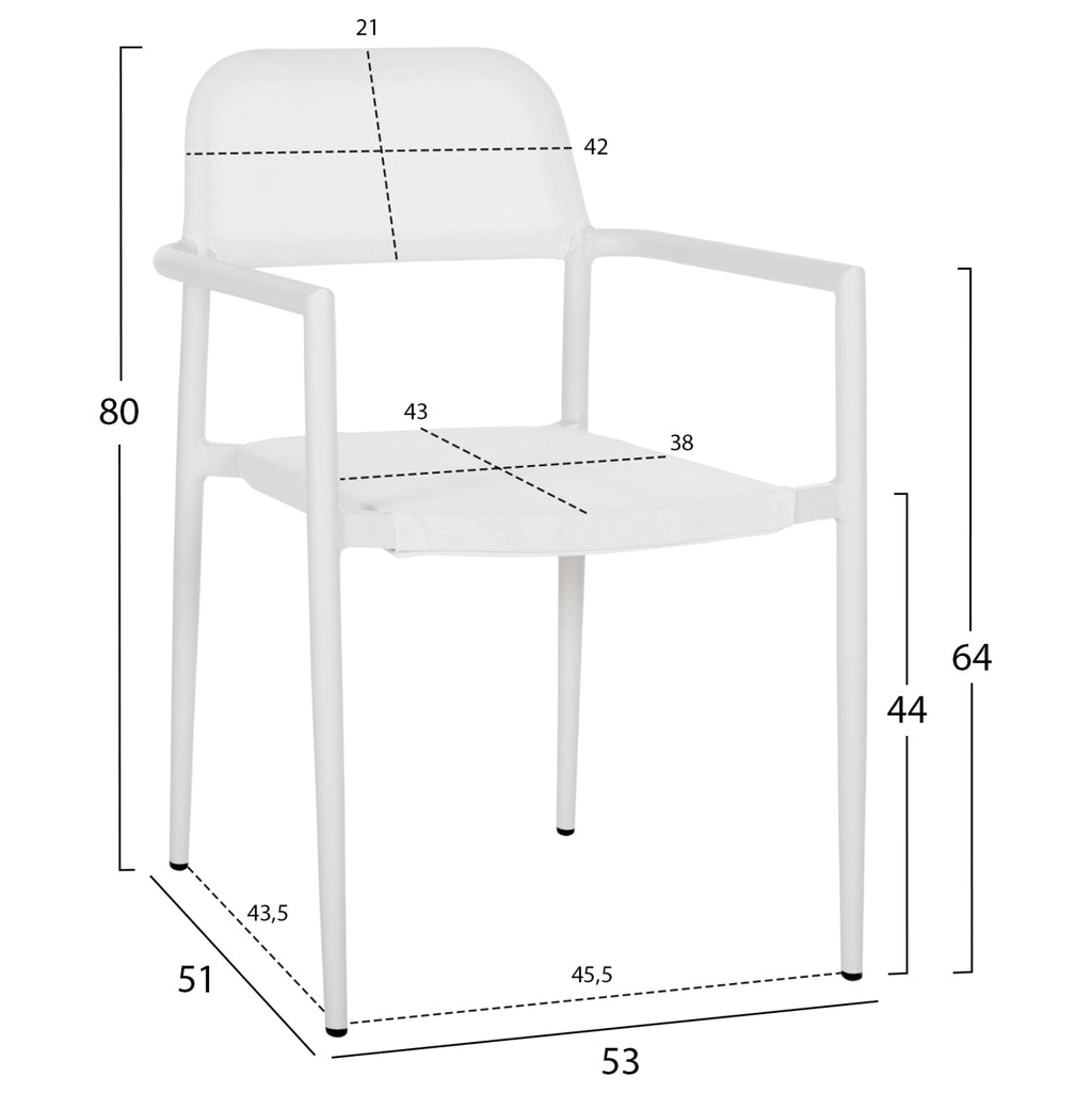 Алуминиевото кресло RONNY в БЯЛО е още едно ново допълнение към нашата гама! Облегалката е леко наклонена назад за по-голям комфорт, а седалката и облегалката са с издръжлив текстил в БЯЛ цвят. Като цяло "линиите" на фотьойла са квадратни и могат да надградят естетически пространството, където ще го поставите. Освен това фактът, че може да се подрежда, го прави особено практичен, тъй като можете да го съхранявате на възможно най-малко място. РАЗМЕРИ: 53x51x80H см. Височина на седалката: 44 см. Височина на ръцете: 64 см. Размери на седалката: 38х43 см. Размери на гърба: 42х21см. Разстояние между краката: 48.5-51.5x43.5-47.5 см. Височина на крака: 42 см. Височина на крака отзад: 40-43,5 см. КОНСТРУКТИВНИ МАТЕРИАЛИ: Рамката на фотьойла е алуминиева, боядисана с електростатична боя. Алуминият е „зелен“ и антикорозионен материал, който може да се рециклира неограничено време, като запазва характеристиките си без влошаване на качеството. Информация: Електростатичното боядисване е процес на сухо покритие, използван като метално покритие. Електростатичното боядисване е нанасяне на сух прах чрез електростатичен процес, който след това се „свързва“ към метала чрез топлина. Седалката и облегалката са изработени от висококачествен textline (или textilene) 2x1. Това е дебел, здрав и издръжлив полиестерен плат. Това означава, че е направен от полиестерна прежда с PVC. ПОДДРЪЖКА: Благодарение на издръжливостта на строителните материали, поддръжката на фотьойла е лесна. Освен редовното почистване от прах, можете да го избършете с влажна кърпа. ПРЕДИМСТВА: •Здрава конструкция •Модерен дизайн •Лесен за поддръжка •МОЖЕ ДА СЕ СРЕЩА •Удивително съотношение цена-качество ** Цветопредаването на продукта може леко да се различава от фотографското представяне на вашия екран.