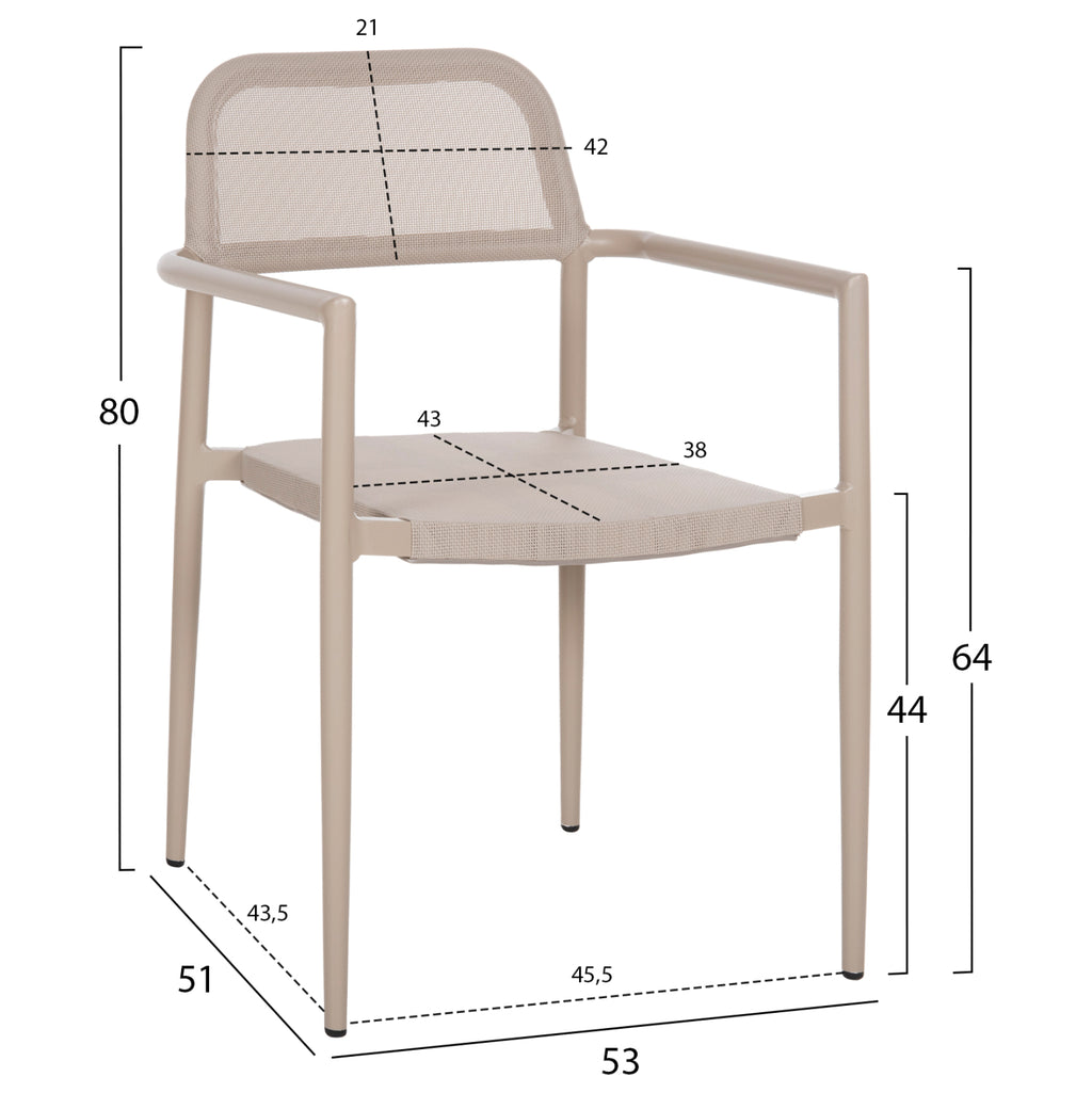 Алуминиевото кресло RONNY в цвят ШАМПАНСКО е поредното ново попълнение в нашата гама! Облегалката е леко наклонена назад за по-голям комфорт, а седалката и облегалката са с издръжлив текстил в цвят ШАМПАНСКО. Като цяло "линиите" на фотьойла са квадратни и могат да надградят естетически пространството, където ще го поставите. Освен това фактът, че може да се подрежда, го прави особено практичен, тъй като можете да го съхранявате на възможно най-малко място. РАЗМЕРИ: 53x51x80H см. Височина на седалката: 44 см. Височина на ръцете: 64 см. Размери на седалката: 38х43 см. Размери на гърба: 42х21см. Разстояние между краката: 48.5-51.5x43.5-47.5 см. Височина на крака: 42 см. Височина на крака отзад: 40-43,5 см. КОНСТРУКТИВНИ МАТЕРИАЛИ: Рамката на фотьойла е алуминиева, боядисана с електростатична боя. Алуминият е „зелен“ и антикорозионен материал, който може да се рециклира неограничено време, като запазва характеристиките си без влошаване на качеството. Информация: Електростатичното боядисване е процес на сухо покритие, използван като метално покритие. Електростатичното боядисване е нанасяне на сух прах чрез електростатичен процес, който след това се „свързва“ към метала чрез топлина. Седалката и облегалката са изработени от висококачествен textline (или textilene) 2x1. Това е дебел, здрав и издръжлив полиестерен плат. Това означава, че е направен от полиестерна прежда с PVC. ПОДДРЪЖКА: Благодарение на издръжливостта на строителните материали, поддръжката на фотьойла е лесна. Освен редовното почистване от прах, можете да го избършете с влажна кърпа. ПРЕДИМСТВА: •Здрава конструкция •Модерен дизайн •Лесен за поддръжка •МОЖЕ ДА СЕ СРЕЩА •Удивително съотношение цена-качество ** Цветопредаването на продукта може леко да се различава от фотографското представяне на вашия екран.