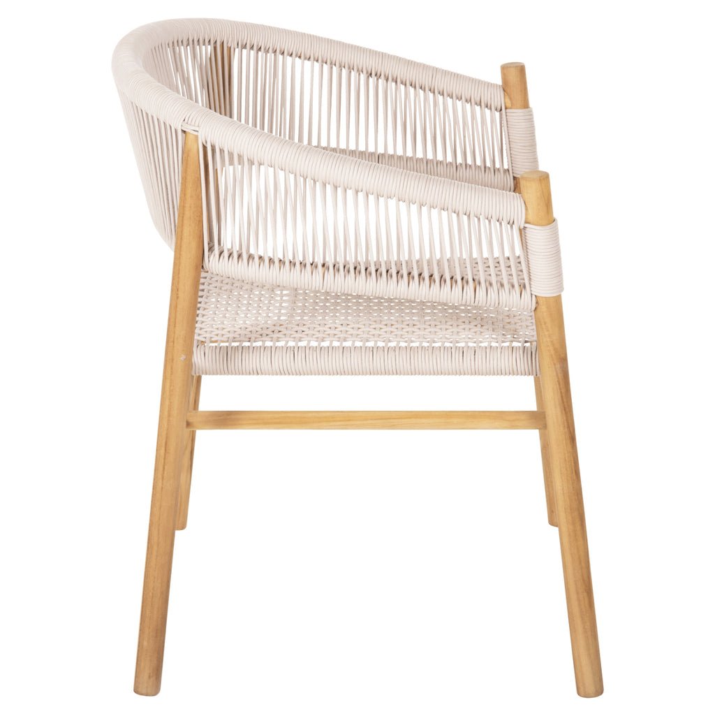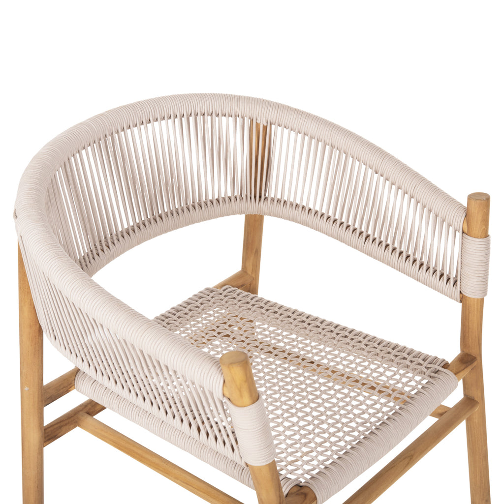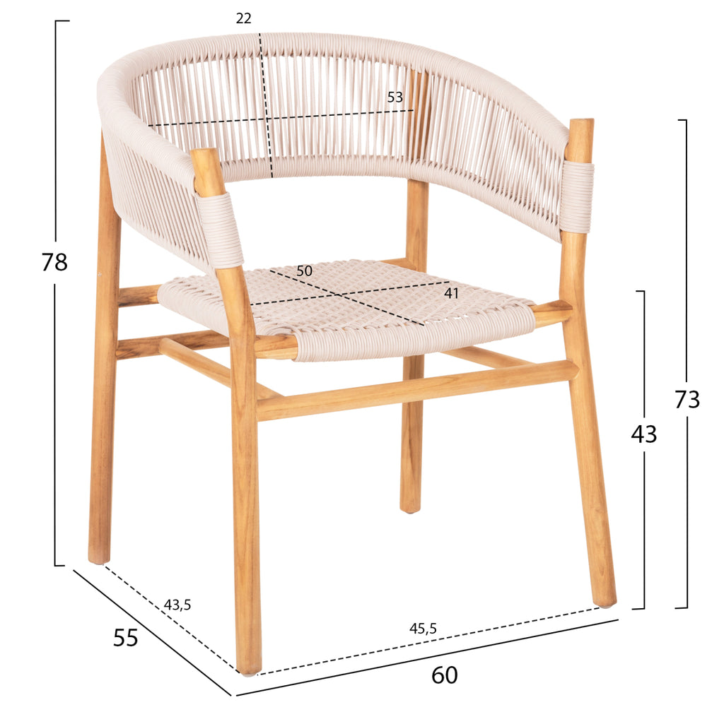Креслото IRVING е кресло с несравнима красота. Красивата му рамка е изработена от качествено дърво, а средновисоката полукръгла облегалка и широката седалка са изработени от майсторски сплетено въже с отлично качество в БЕЖОВ цвят. Линиите на дизайна на фотьойла са елегантни и фокусирани върху комфорта на потребителя, а дървото е в ЕСТЕСТВЕН цвят, който лесно може да се комбинира с различни декоративни мотиви. Фотьойлът ще бъде център на интерес, където и да бъде поставен, но особено ако е съчетан с хубава маса за хранене. РАЗМЕРИ: 60x55x78H см. Размери на седалката: 41х50 см. Размери на гърба: 53х22см. Височина на ръцете: 66-73 см. Височина на седалката: 43 см. Височина на крака: 41 см. Разстояние на краката: 52-58x52.5-59 см. Височина на крака отзад: 50-56 см. МАТЕРИАЛИ НА КОНСТРУКЦИЯТА: Рамката на фотьойла е изработена от отлично тиково дърво масив. Когато говорим за масивно дърво, имаме предвид дървета, направени изцяло от ствола на дърво. Масивната дървесина е най-скъпият избор по отношение на дървесината, но се откроява със своята вечна естетика. Тикът е най-популярният вид твърда дървесина. Той е жълт до тъмно кафяв на цвят, изключително тежък, с висока якост, устойчив на атмосферни влияния, устойчив на стружки и не се разлага. Често водите на дървото му са силни и прави. Използва се за много интериорни конструкции. Седалката и облегалката са изработени от плетено въже. ПОДДРЪЖКА: Фактът, че ТИК е част от твърдата дървесина, го прави много лесен за поддръжка. Всичко, от което се нуждае, е почистване от прах и при необходимост почистване с влажна кърпа. ПРЕДИМСТВА: •Здрава конструкция •Естетично красиво кресло с класически дизайн, което ще пасне навсякъде. • Съотношение цена/качество • Доставя се готов за употреба ** Цветопредаването на продукта може леко да се различава от фотографското представяне на вашия екран.