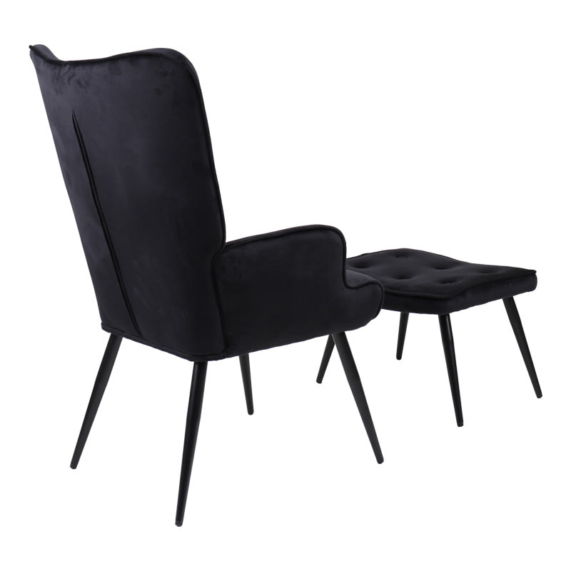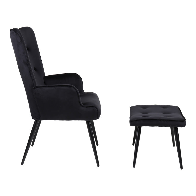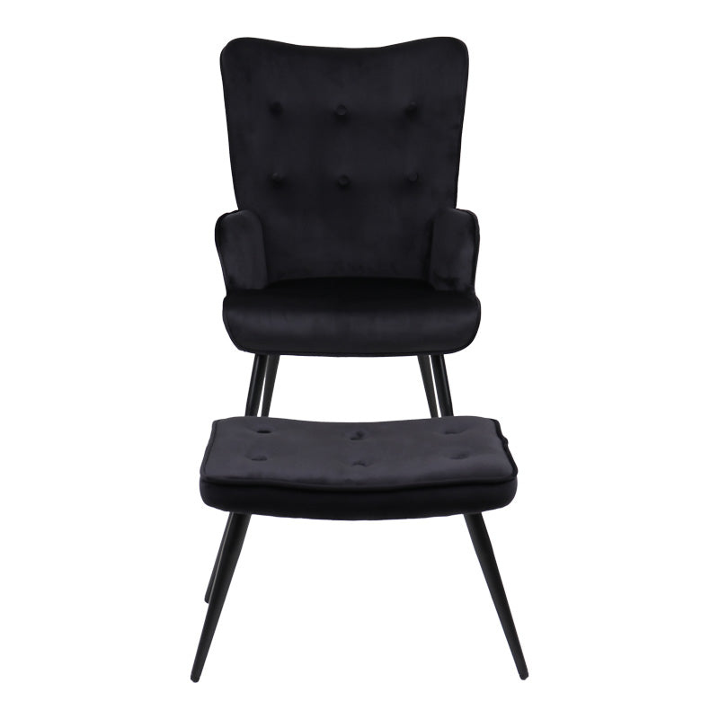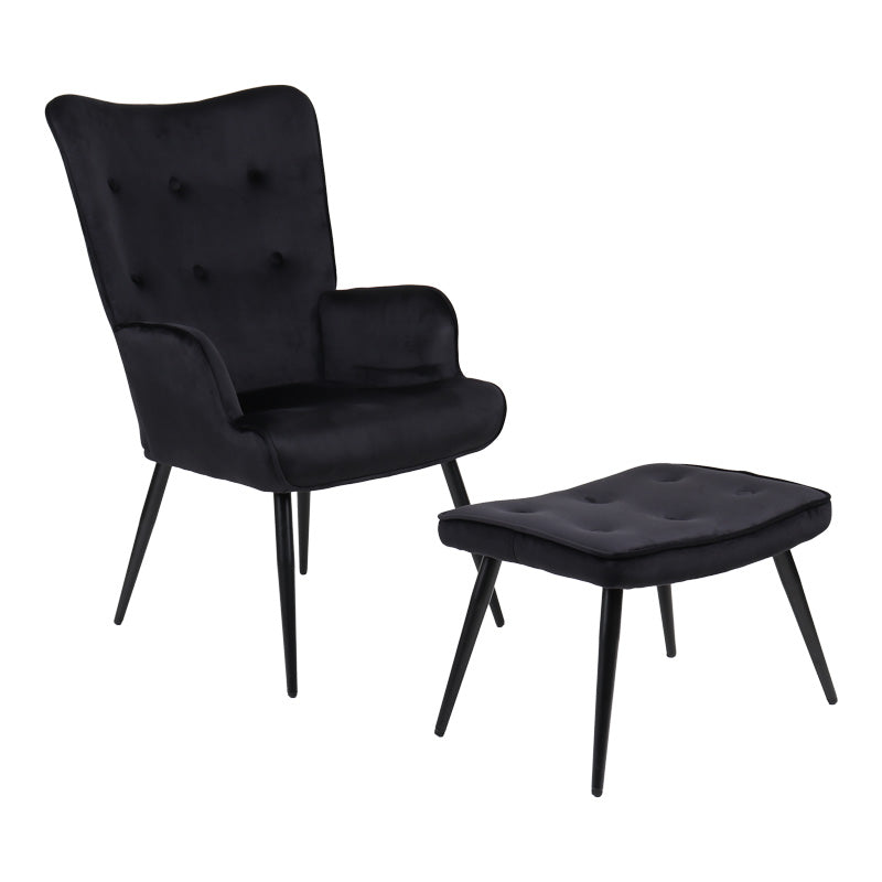 Този фотьойл с тахта представлява върхът на авангарден интериорен дизайн, хармонично съчетаващ издръжливи съвременни материали с лукс и ергономичност. Шедьовър на несравнима естетика, който ще издигне декора на вашето пространство. Перфектно подходящ за всеки модерен дом или професионална среда. Технически характеристики: Облегалката и седалката са изработени от подсилена дървена рамка с висока издръжливост и устойчивост на износване. Високата облегалка обхваща и следва гръбнака, осигурявайки лумбална опора. Отличава се с модерен извит дизайн с декоративни кабриолови акценти. Включва интегрирани подлакътници за отпускане на ръцете на потребителя. Поддържан от четири висококачествени черни метални крака, осигуряващи отлична устойчивост на тегло и дълготрайна издръжливост. Тапициран с дамаска с несравнимо качество, устойчива на износване и абразия. Предлага се в черен цвят. Включва табуретка/табуретка за крака. Размери на фотьойла: Дължина: 59 см Ширина: 67 см Височина: 94 см Височина на седалката: 43 см Дълбочина на седалката: 42 см Височина на подлакътника: 57 см Османски размери: Дължина: 51 см Ширина: 38 см Височина: 39 см Информация за материала: Кадифе: Кадифето е плат с къси, плътни влакна, обикновено направени от коприна, памук или синтетични материали. Има мека, гладка текстура и богат, лъскав външен вид. Характеризира се със своята плътност и мекота. Инструкции за поддръжка: Кадифе: Използвайте мека четка или вашата прахосмукачка и приставката с мекия косъм и с нежни движения почистете кадифето. В случай на петно, избършете с мека кърпа и топла вода, но търкайте петното много внимателно, без да натискате, защото ще попие още по-дълбоко. Изплакнете мястото обилно с чиста вода и оставете тъканта да изсъхне далеч от слънцето. Забележки: Продуктът се доставя разглобен, във фабрична опаковка, с подробно ръководство за монтаж. Цветът на продукта може леко да се различава от фотографското му представяне на вашия екран.