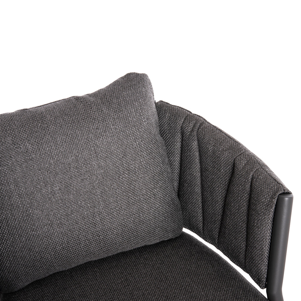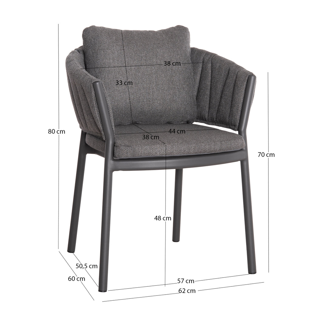 Алуминиево кресло SHANKS в цвят ТЪМНО СИВ е с полукръгла облегалка и има възглавници за гръб и седалка. Естетично е тапицирана с дамаска ОЛЕФИН, а калъфките за възглавници също са с дамаска ОЛЕФИН, всички в ТЪМНО СИВ цвят. Всичко, което трябва да направите, е да намерите правилната маса, която да подхожда на този прекрасен фотьойл. РАЗМЕРИ: 62x60x75-80H см. Размери на седалката: 44х38 см. Размери на гърба: 38х33см. Височина на ръцете: 70см. Височина на седалката: 48см. Височина на крака: 38см. Разстояние на краката: 57-51х50,5-45 см. МАТЕРИАЛИ НА КОНСТРУКЦИЯТА: Рамката е изработена от алуминий, боядисан с електростатична боя. Алуминият е „зелен“ материал, който може да се рециклира неограничено време, като запазва характеристиките си без влошаване на качеството. По своята същност алуминият е устойчив на корозия. Информация: Електростатичното боядисване е процес на сухо покритие, използван като метално покритие. Олефиновото влакно е синтетично влакно, изработено от различни пластмасови материали. Тъканта, изработена от това влакно, е здрава, устойчива на избледняване и устойчива на плесен, абразия и слънчева светлина, тъй като има UV защита, добавена в процеса на производство. Най-важните характеристики обаче са, че е водоустойчив и устойчив на петна (устойчив на петна). ПОДДРЪЖКА: Освен редовно почистване от прах, можете да го забърсвате с влажна кърпа. Не използвайте химически почистващи препарати. ** Цветопредаването на продукта може леко да се различава от неговото фотографско представяне на вашия екран.