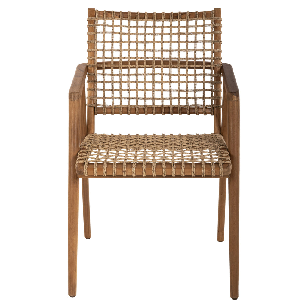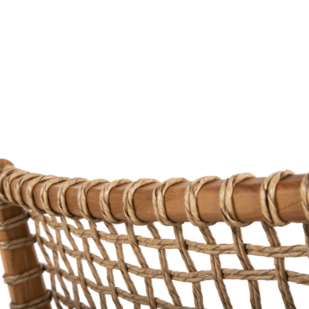 Кресло VAYA е красиво и практично. Красивата му рамка е изработена от качествено дърво, а облегалката със средна височина и широката седалка са изработени от майсторски изтъкано синтетично въже с най-високо качество. Дизайнерските линии на креслото са елегантни и фокусирани върху комфорта на потребителя. Дървото е с естествен цвят, който лесно се съчетава с различни декоративни мотиви. Фотьойлът ще бъде център на интерес, където и да бъде поставен. РАЗМЕРИ: 53.5х60.5х85 см. Височина на седалката: 44,5 см. Височина на ръцете: 65.5 см. Размери на седалката: 46x49x40.5 см. Размери на гърба: 46х35-41см. Разстояние между краката: 48х50 см. МАТЕРИАЛИ НА ИЗРАБОТКА: Рамката на фотьойла е изработена от висококачествена ТИКОВА дървесина. Тикът е най-популярният вид твърда дървесина. Той е жълт до тъмно кафяв на цвят, изключително тежък, с висока якост, устойчив на атмосферни влияния, устойчив на стружки и не се разлага. Често водите на дървото му са силни и прави. Използва се за много вътрешни и външни конструкции. ПОДДРЪЖКА: Фактът, че ТИК е част от твърдата дървесина, го прави много лесен за поддръжка. Всичко, от което се нуждае, е почистване от прах и при необходимост почистване с влажна кърпа. ПРЕДИМСТВА: •Здрава конструкция •Естетично красиво кресло с класически дизайн, което ще пасне навсякъде. • Съотношение цена/качество • Доставя се готов за употреба