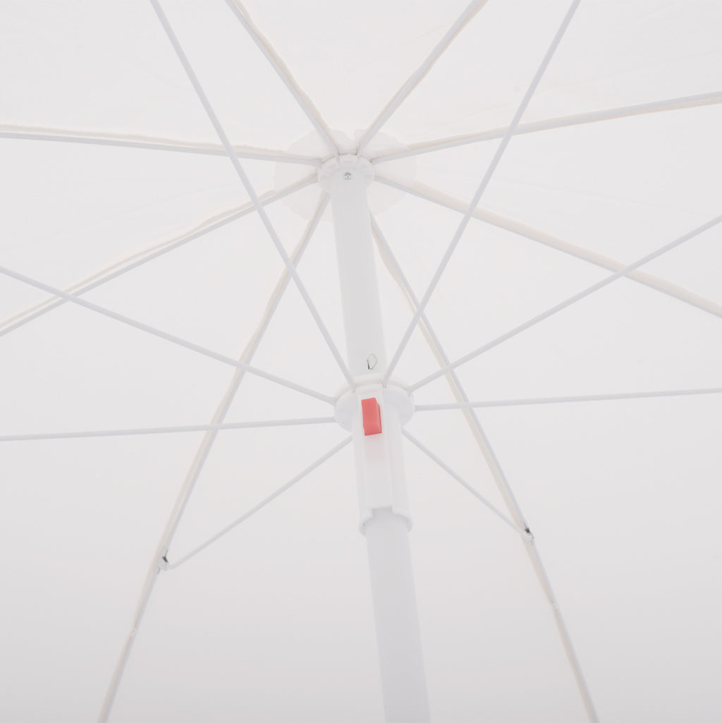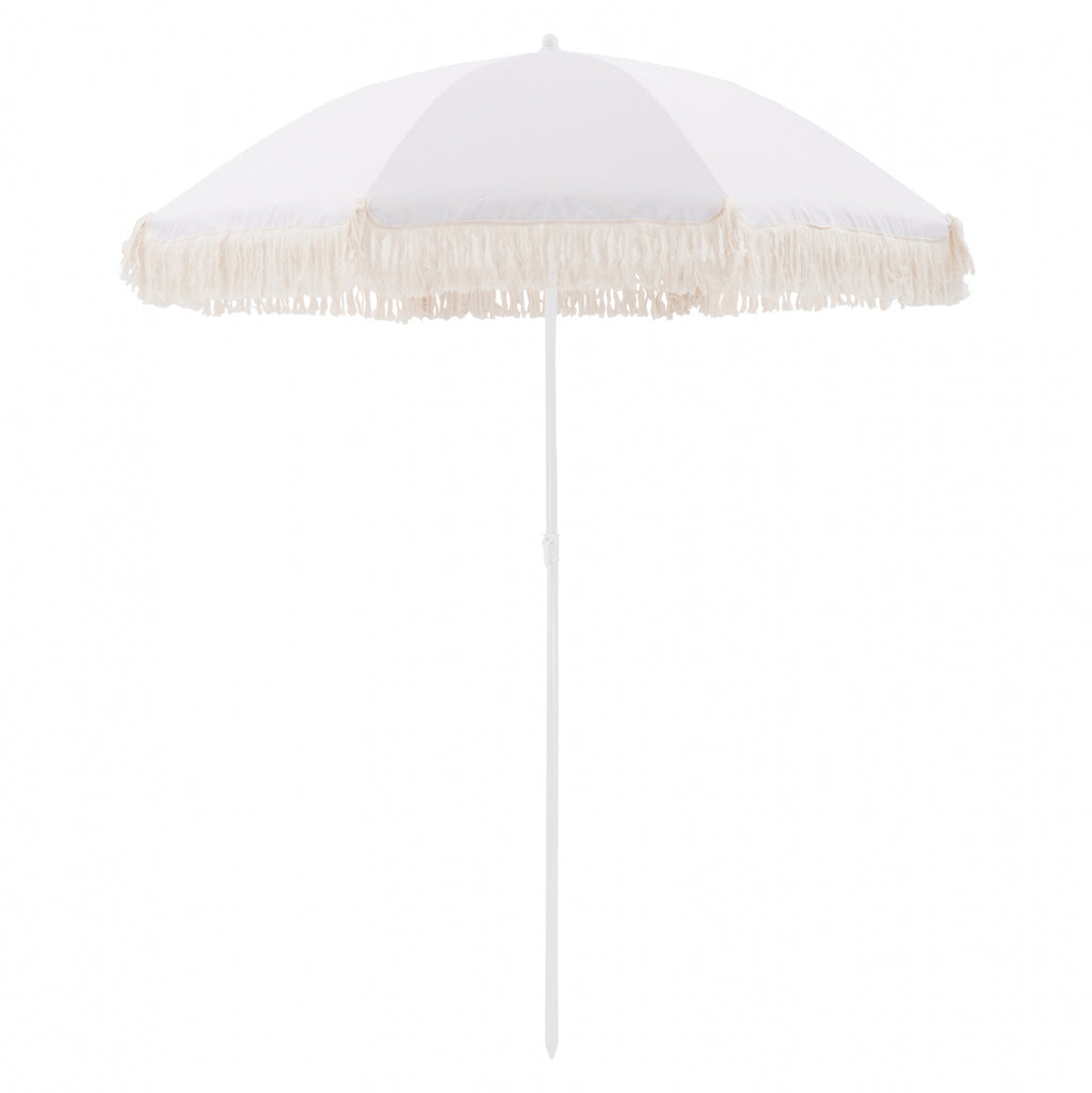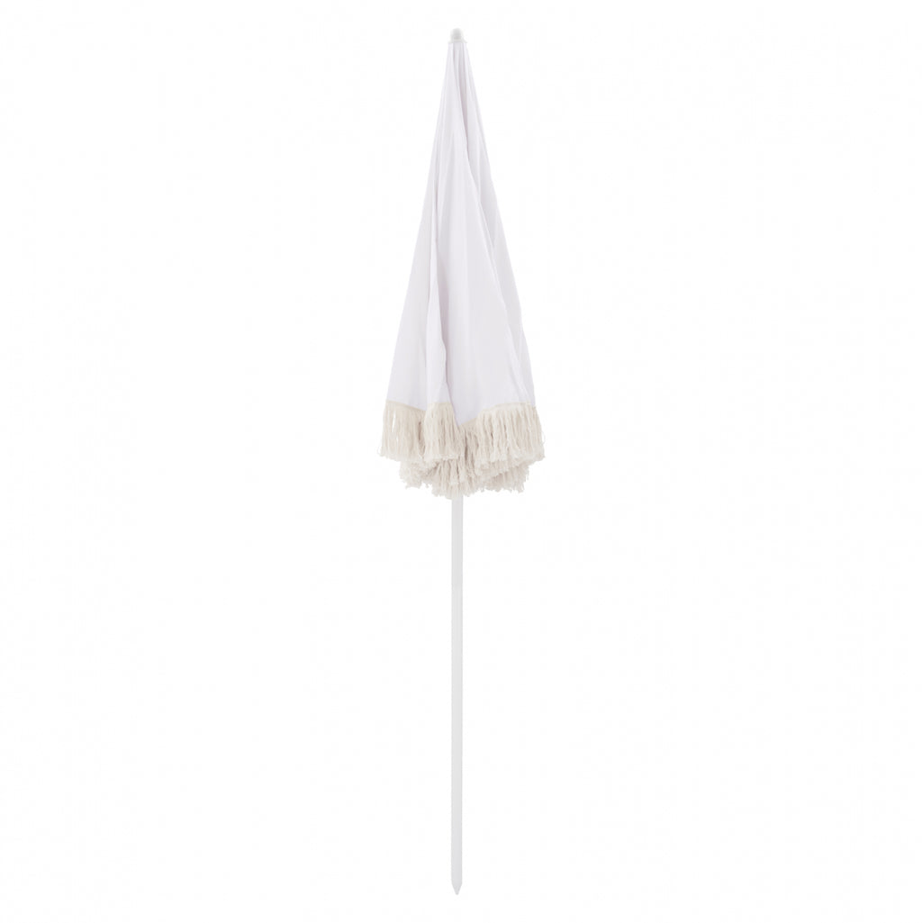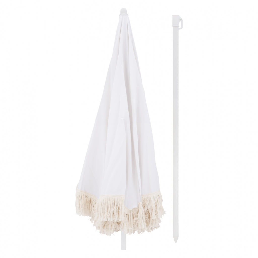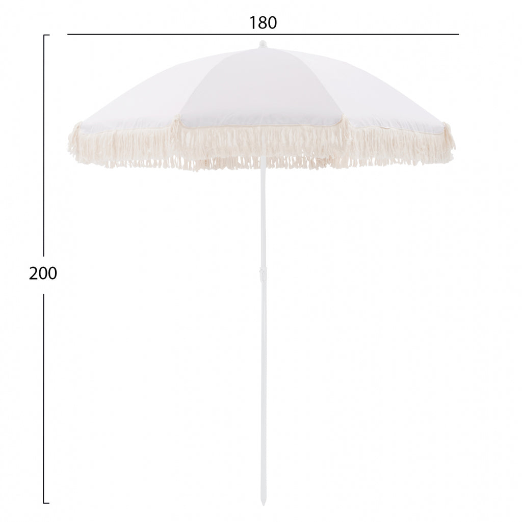 Кръгъл плажен чадър и капаци от ресни макраме, в бежов нюанс. Разделена тръба Φ25/22мм, с 8 спици с дебелина 3,5мм. Плат 140 грама. Размери: Φ180x200 см. Размери на горната част на чадъра: 105 см. Размери на дъното на чадъра: 101 см. Чадърът е подходящ за използване при ясно време. При нестабилно време чадърът трябва да бъде затворен. Чадърът не подлежи на ремонт.
