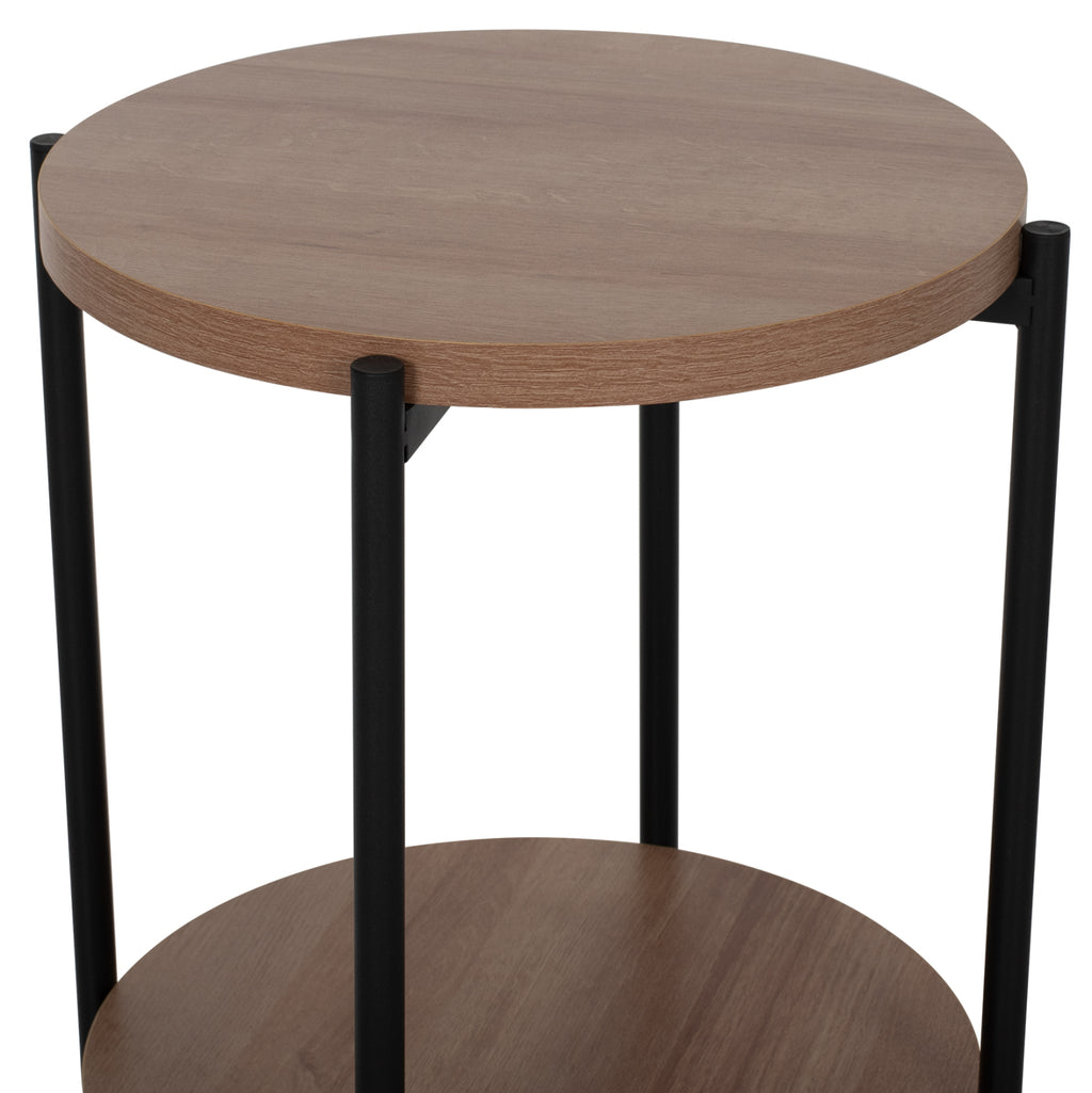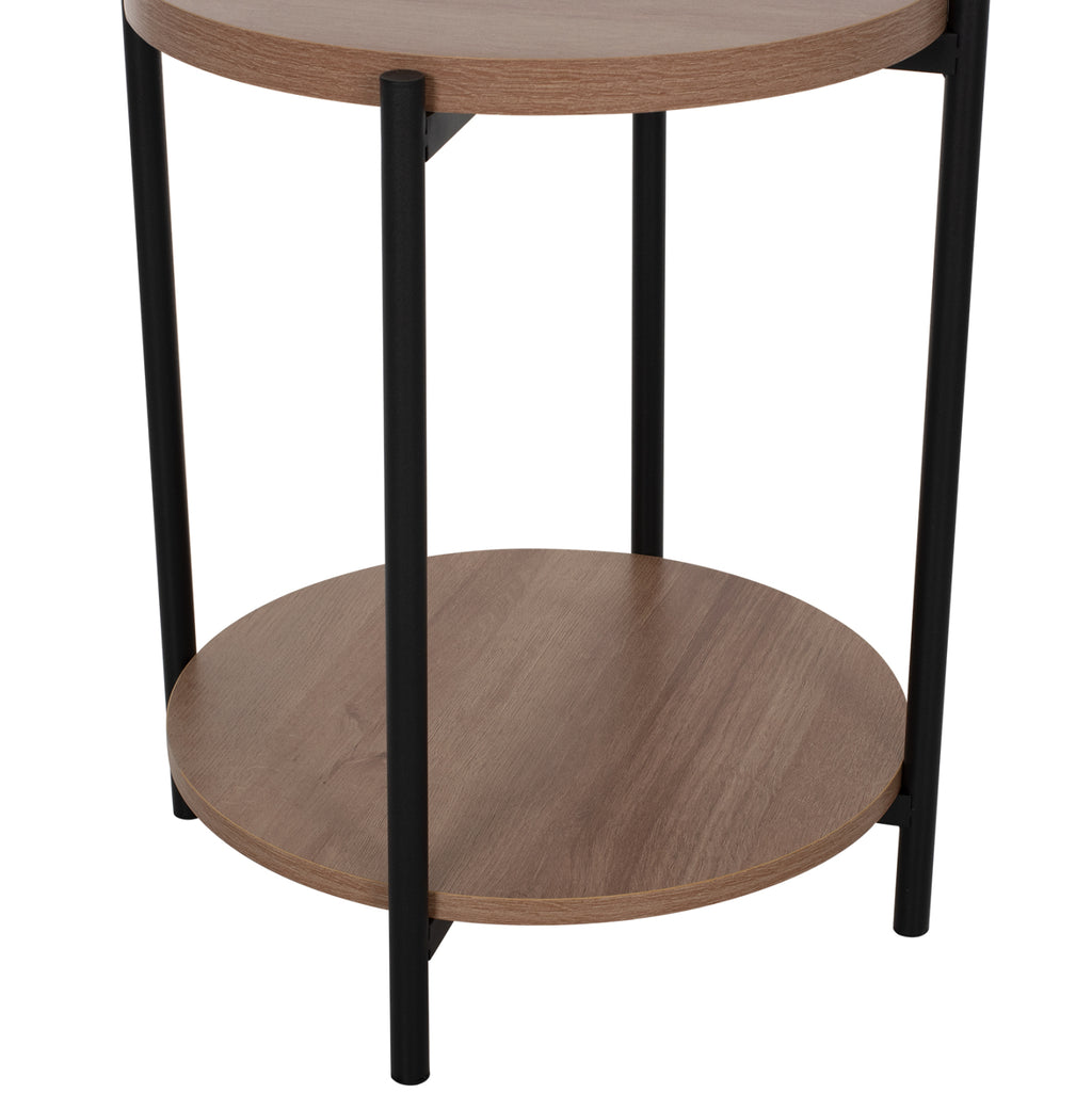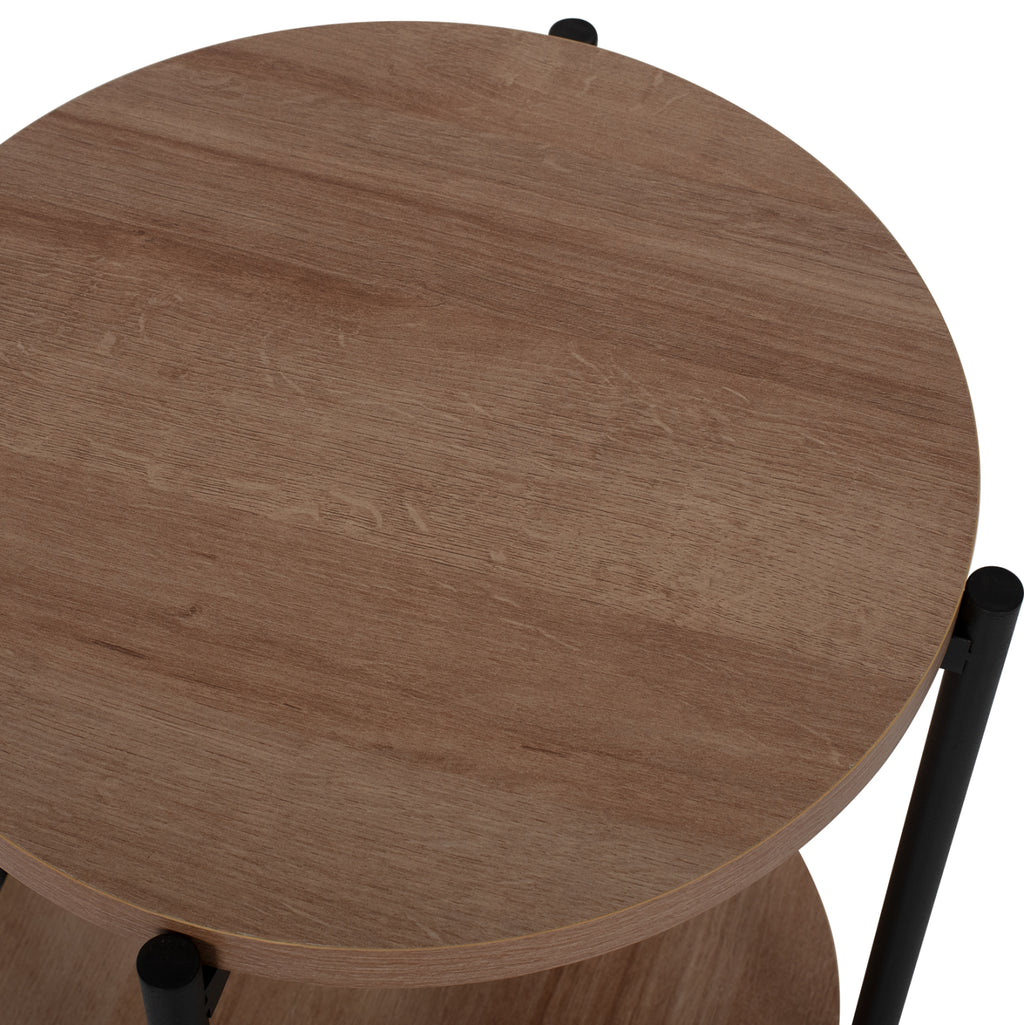 Красива средно висока кръгла меламинова помощна масичка за всекидневна, в дървесен цвят дъб. Характерното за нея е, че има 2 повърхности, които лежат върху черни метални кръстосани основи, които са свързани към краката. Тази масичка за кафе ще обнови естетически вашата всекидневна, докато съчетава много различни стилове и цветове в околното пространство.