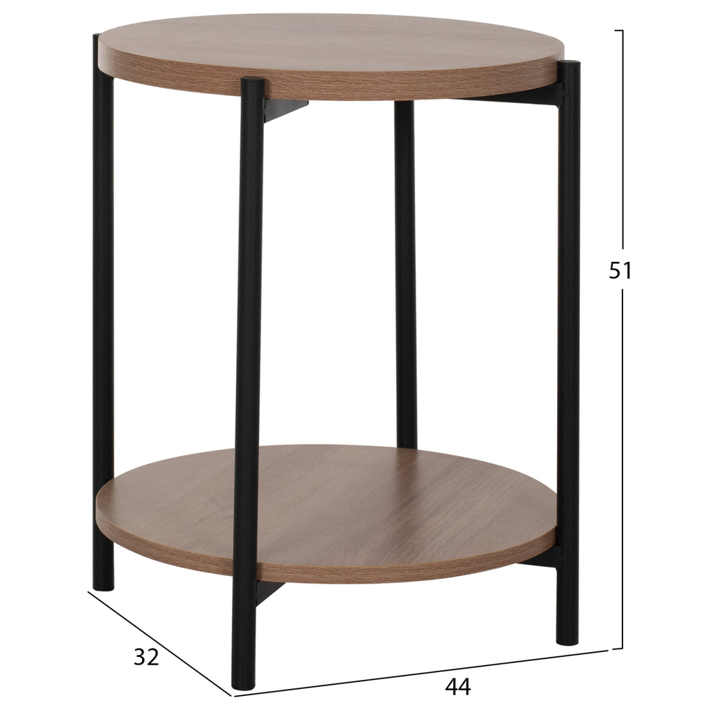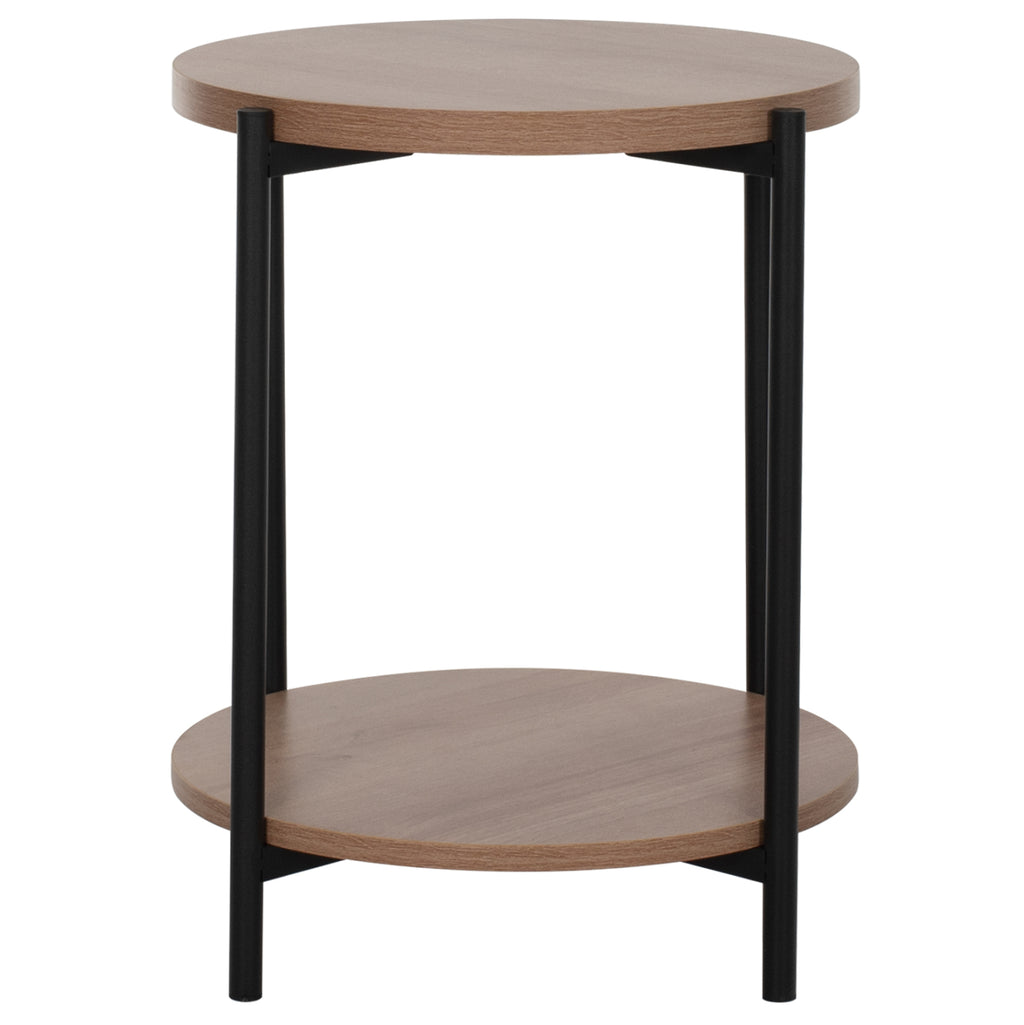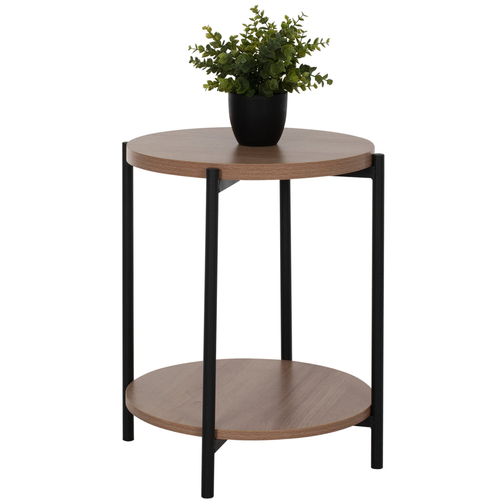 Красива средно висока кръгла меламинова помощна масичка за всекидневна, в дървесен цвят дъб. Характерното за нея е, че има 2 повърхности, които лежат върху черни метални кръстосани основи, които са свързани към краката. Тази масичка за кафе ще обнови естетически вашата всекидневна, докато съчетава много различни стилове и цветове в околното пространство.
