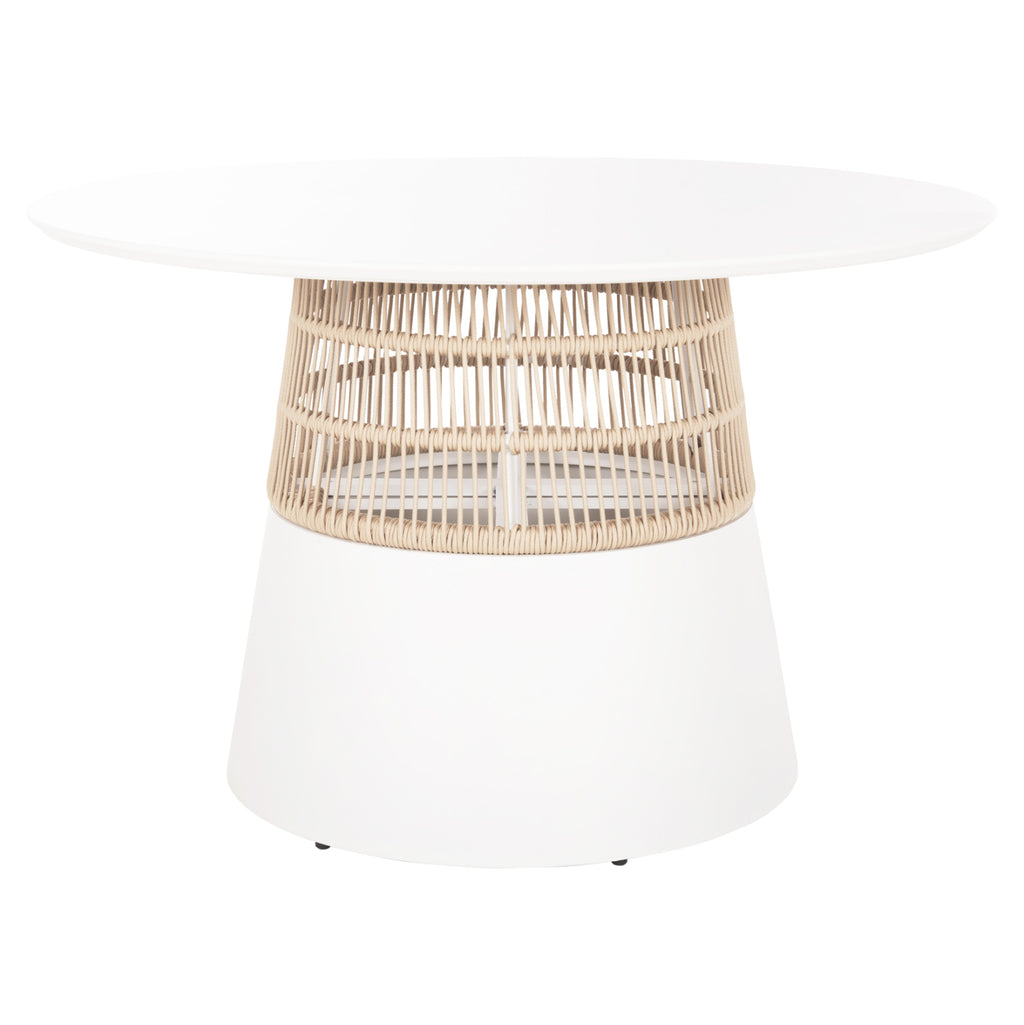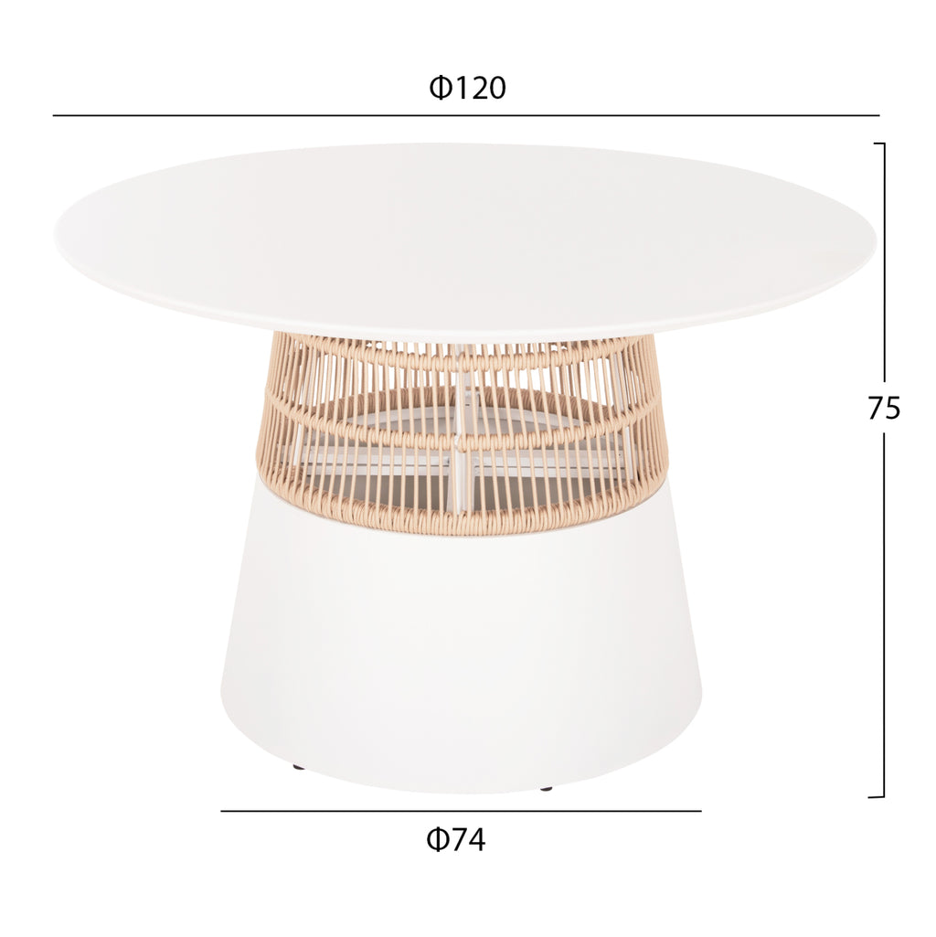 SAEID е кръгла (стил ротонда) алуминиева маса в задоволителни размери в БЯЛ цвят. Масата се поддържа от конична и цилиндрична конструкция от БЯЛ алуминий и БЕЖОВО въже. Тази маса ще надгради естетически всяко професионално пространство на открито или дори у дома и може да съвпадне с много различни стилове и цветове, както и с различни стилове на столове.