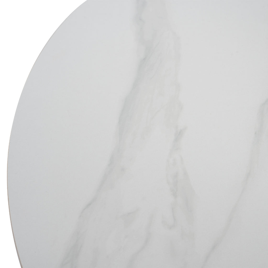 Μ9309.02 КРЪГЛА МАСА ОТ СИНТЕРОВАН КАМЪК-----Открийте новото допълнение към нашата продуктова гама. Кръглата маса с повърхност от синтерован камък с вид на БЯЛ мрамор и черни метални двойно кръстосани крака. Масите Ротонда са особено практични и красиви, защото нямат плотове и "водачи", нито ъгли или крака в ъглите, които често създават неудобни ситуации. С КГ9309.02 модерният дизайн отговаря на най-новите технологии и придава футуристично усещане на вашето пространство.