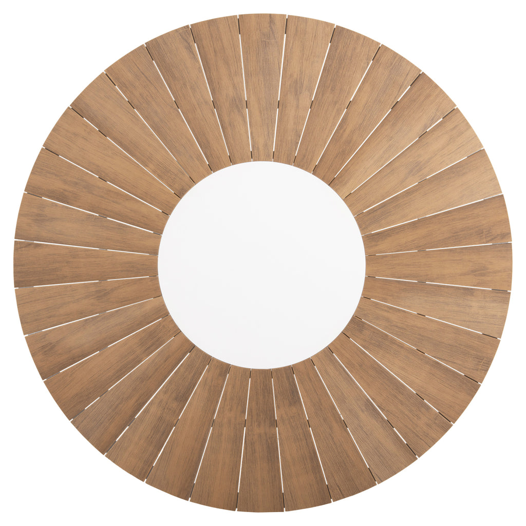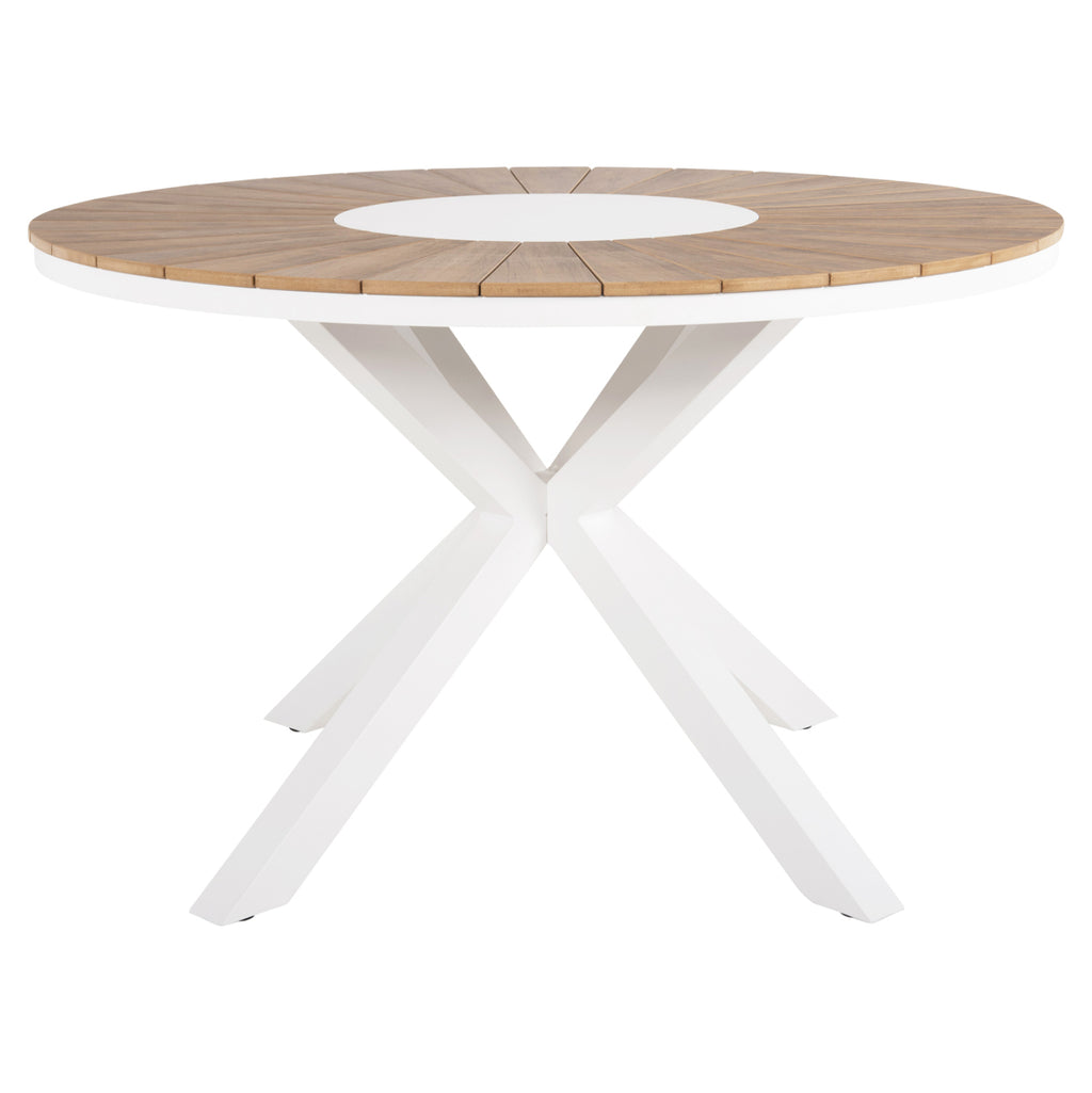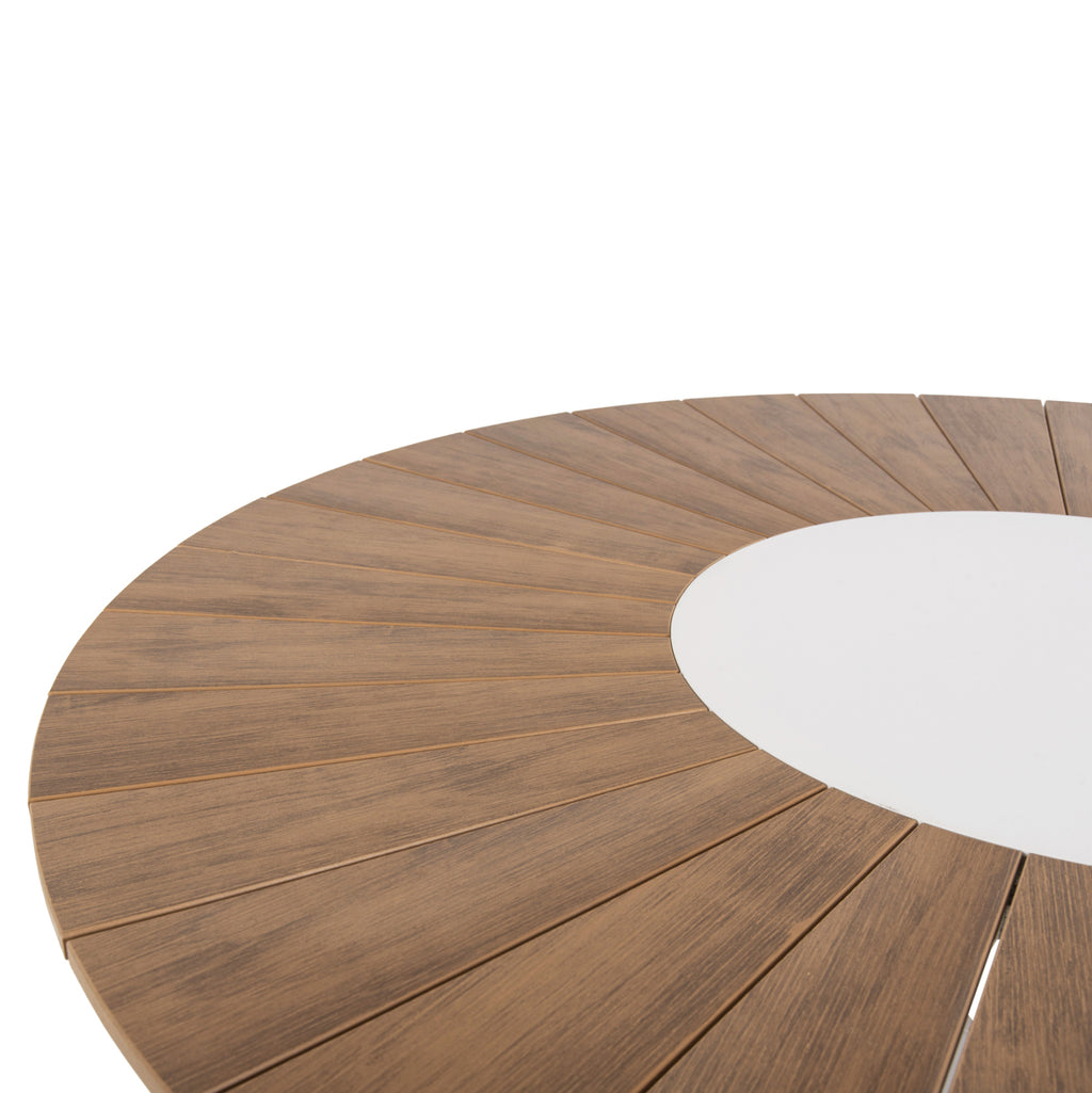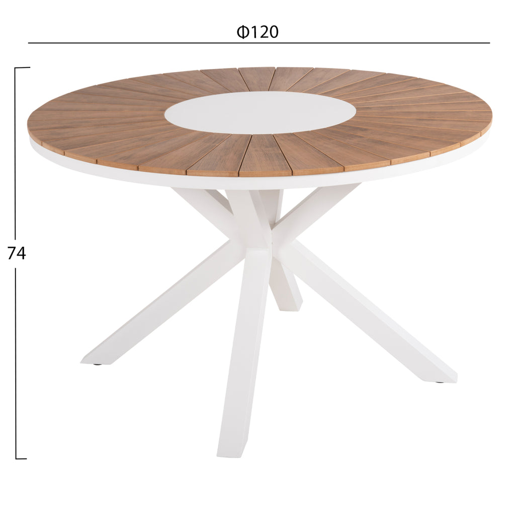 MORIL е кръгла външна маса с алуминиева конструкция в кръстосано подреждане на основата и цвят БЯЛ. Повърхността е изработена от полидървесни плочи в НАТУРАЛЕН дървесен цвят. Представлява красива маса в нормален размер, на която могат да се настанят поне 6 души. РАЗМЕРИ: Φ120x74H см. МАТЕРИАЛИ НА КОНСТРУКЦИЯТА: Рамката е изработена от алуминий с електростатично боядисване. Алуминият е метал с отлични механични свойства и много устойчив на различни форми на корозия по природа и изисква минимални разходи за поддръжка. Може да се рециклира неограничено време, запазвайки характеристиките си без влошаване на качеството. Електростатичното боядисване е процес на сухо покритие, използван като метално покритие чрез електростатичен процес, който след това се „свързва“ към метала чрез топлина. Подходящ е както за вътрешни, така и за външни приложения. Плотът е изработен от полидървесина. Това е форма на пластмасов дървен материал, който е екологичен и изисква малко поддръжка. Пластмасовият дървен материал е 100% рециклируем и в същото време е водоустойчив и издържа на всякакви видове гниене и мухъл. ПОДДРЪЖКА: Можете да забършете всички повърхности с влажна кърпа и това е достатъчно, за да изглеждат вашите мебели отново като нови. За упорити петна можете да използвате мек почистващ препарат. Избягвайте продължителното излагане на повърхността на масата на слънце, както и контакта й с токсични химически продукти. ПРЕДИМСТВА: •Стабилна и безопасна конструкция •Красив дизайн •Съотношение цена-качество *Масата се доставя разглобена с подробни инструкции за сглобяване **Точното цветопредаване на продукта може леко да се различава от действителния продукт поради различните настройки на всеки монитор.