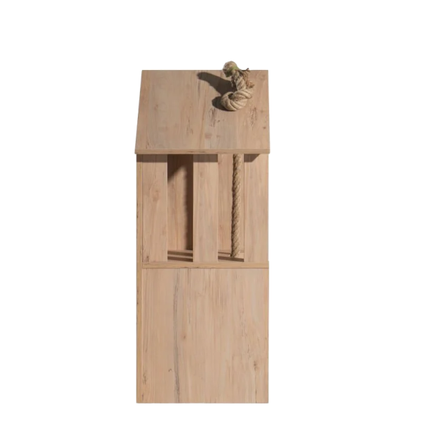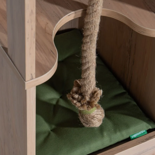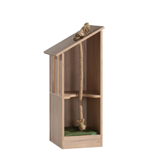 Къщичката MY HOUSE е иновативно двуетажно решение, което осигурява комфорт и забавление за домашни любимци. Вътрешната част разполага с меко кокетно легло за спокоен сън, докато горният плот е удобно място за поставяне на купички за храна или лични аксесоари. Дизайнът включва и специално въже за острене на нокти, което отговаря на естествените инстинкти на животните и предпазва мебелите. Със своята модерна визия, къщичката се вписва перфектно в интериора, предлагайки сигурност и уют.