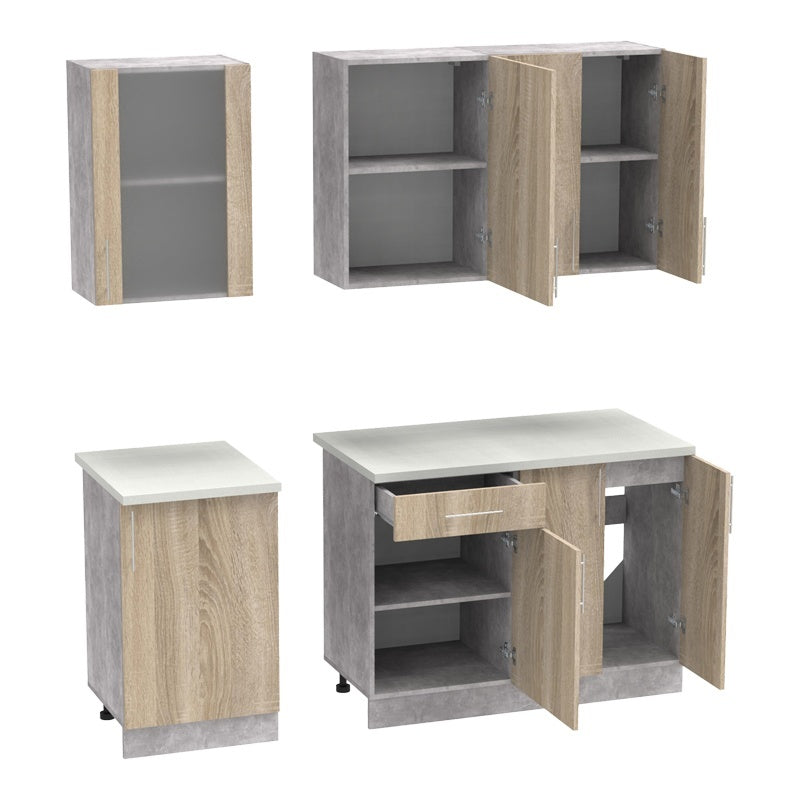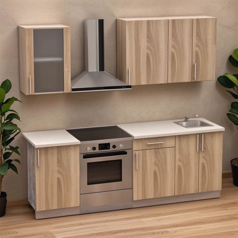 - Това оформление позволява организирането на кухненските прибори и храната, осигурявайки спретнато и функционално пространство.