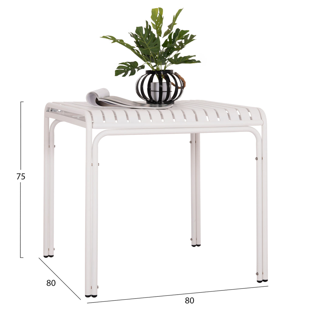 Το τετράγωνο τραπέζι RACHEL είναι εξολοκλήρου κατασκευασμένο από αλουμίνιο σε ΛΕΥΚΟ χρώμα. Σχεδιαστικά, είναι λιτό με όμορφες καμπυλωμένες άκρες και ενισχυμένο διπλό σκελετό. Συνδυάστε το με ανάλογης αισθητικής καρέκλες, πολυθρόνες ή ακόμα και παγκάκια και δημιουργήστε μια όμορφη εικόνα στον εξωτερικό σας χώρο! ΔΙΑΣΤΑΣΕΙΣ: 80x80x75Υ εκ. Απόσταση ποδιών: 76x72 εκ. ΥΛΙΚΑ ΚΑΤΑΣΚΕΥΗΣ: Ολόκληρο το τραπέζι είναι αλουμινένιο βαμμένο με ηλεκτροστατική βαφή. Το αλουμίνιο είναι ένα «πράσινο» και αντιδιαβρωτικό υλικό το οποίο μπορεί να ανακυκλωθεί απεριόριστα, διατηρώντας τα χαρακτηριστικά του χωρίς καμία ποιοτική υποβάθμιση. Info: Η ηλεκτροστατική βαφή είναι μια διαδικασία ξηρής επίστρωσης που χρησιμοποιείται ως μεταλλικό φινίρισμα. Η ηλεκτροστατική βαφή είναι η επίστρωση ξηρής σκόνης μέσω ηλεκτροστατικής διαδικασίας, η οποία στη συνέχεια «κολλάει» στο μέταλλο μέσω της θερμότητας. ΣΥΝΤΗΡΗΣΗ: Πέρα από τακτικό ξεσκόνισμα, μπορείτε να το σκουπίζετε με ένα υγρό πανί. *To προϊόν παραδίδεται αμοντάριστο ** Η χρωματική απόδοση του προϊόντος ενδέχεται να διαφέρει ελαφρώς σε σχέση με την φωτογραφική απεικόνισή του στην οθόνη σας.