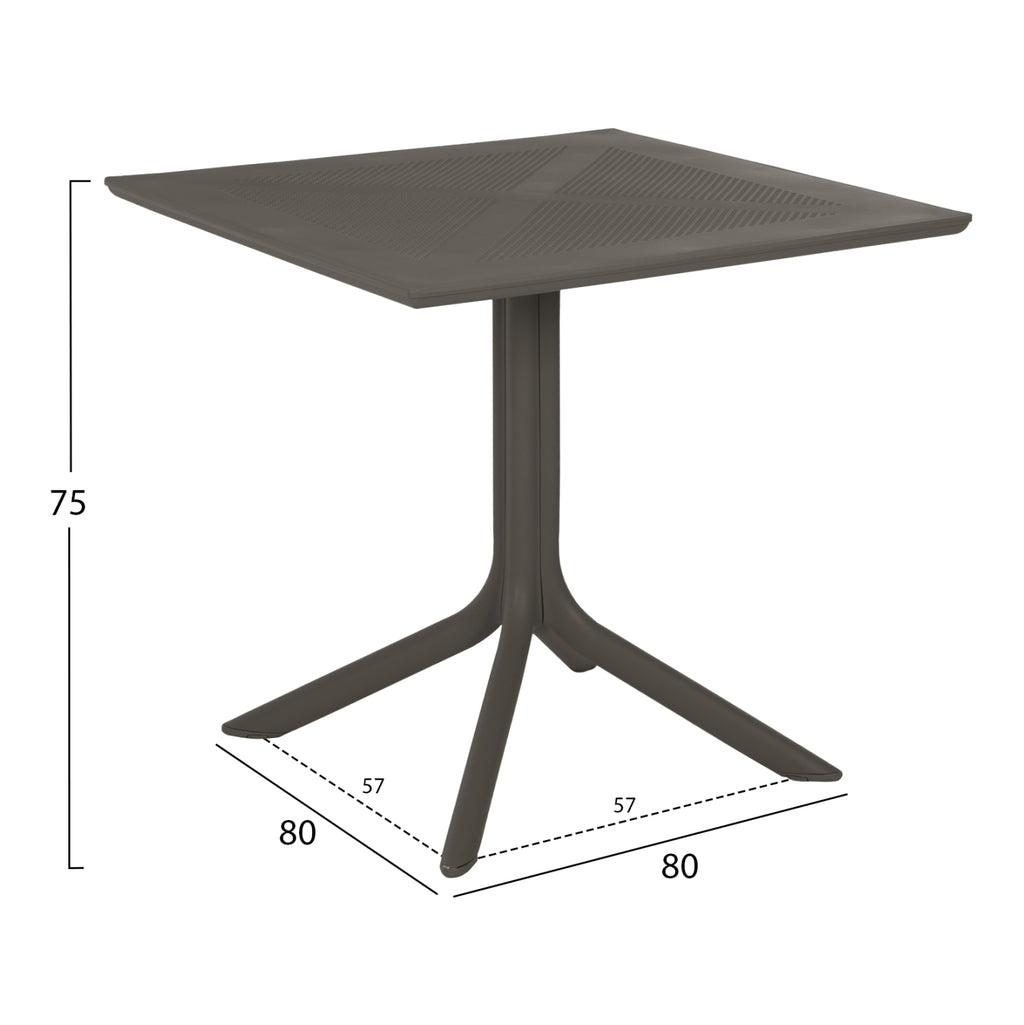 Τραπέζι πολυπροπυλενίου σε DARK OLIVE χρώμα. Ιδανική πρόταση για χρήση σε εξωτερικούς χώρους, είτε επαγγελματικούς (χώροι δεξιώσεων, εταιρείες catering, κλπ.) είτε για το σπίτι. Το τραπέζι αποτελείται από μια «τρυπητή» τετράγωνη επιφάνεια, ενώ η στήριξη γίνεται με μια κολώνα στο κέντρο που καταλήγει σε 4 πόδια («νύχια»). ΤΕΧΝΙΚΑ ΧΑΡΑΚΤΗΡΙΣΤΙΚΑ: Γενικές διαστάσεις: 80x80x75Υ εκ. Πάχος επιφάνειας: 3 εκ. Απόσταση ποδιών: 57x57 εκ. ΥΛΙΚΟ ΚΑΤΑΣΚΕΥΗΣ: Το τραπέζι είναι κατασκευασμένο από 100% πολυπροπυλένιο υψηλής ποιότητας. Το πολυπροπυλένιο είναι ιδιαίτερα ανθεκτικό στο βάρος και στο νερό, ενώ έχει μεγάλη αντοχή στην θερμότητα. ΣΥΝΤΗΡΗΣΗ: Το τραπέζι πολυπροπυλενίου καθαρίζεται πανεύκολα με ένα βρεγμένο πανί. Εάν μάλιστα βρίσκεται σε εξωτερικό χώρο, μπορεί να καθαριστεί απευθείας με τρεχούμενο νερό. ΠΛΕΟΝΕΚΤКГΑΤΑ: •Χαμηλό βάρος •Αντοχή •Αποσπώμενη επιφάνεια •Φιλικό προς το περιβάλλον καθώς το πολυπροπυλένιο είναι ανακυκλώσιμο *Το προϊόν παραδίδεται ασυναρμολόγητο σε εργοστασιακές συσκευασίες. ** Η χρωματική απόδοση του προϊόντος ενδέχεται να διαφέρει ελαφρώς από τη φωτογραφική του αναπαράσταση στην οθόνη σας.