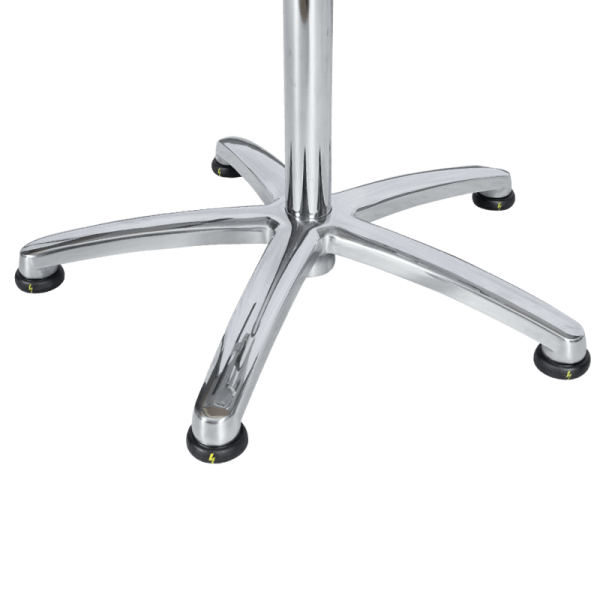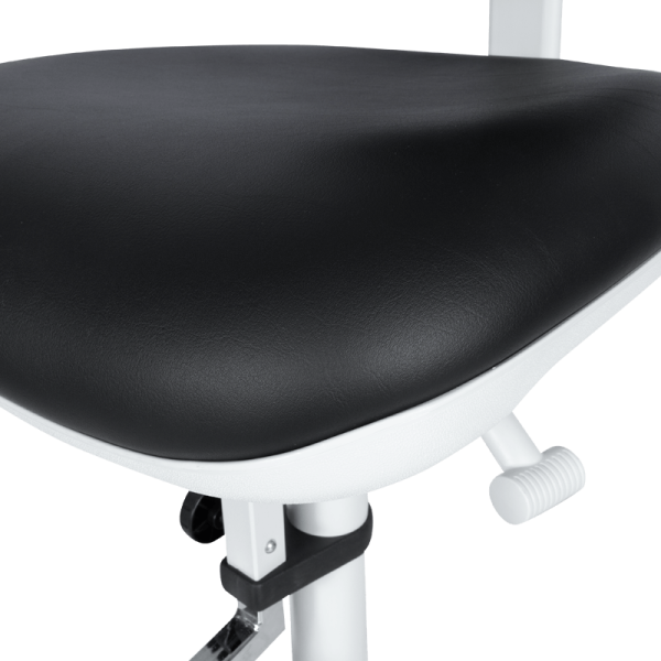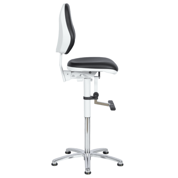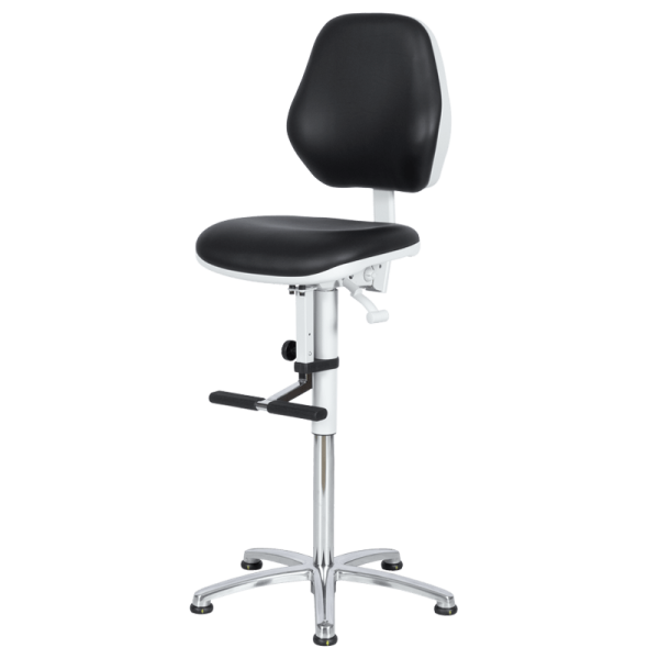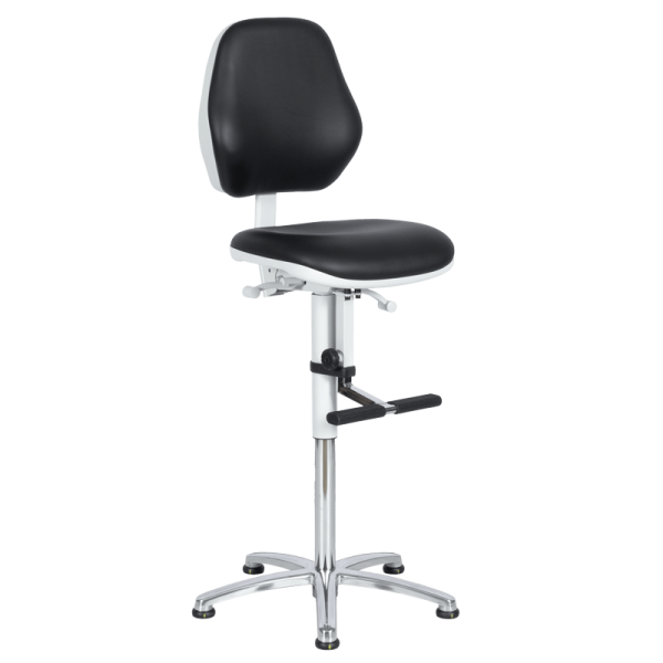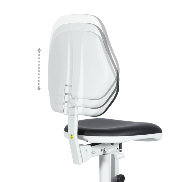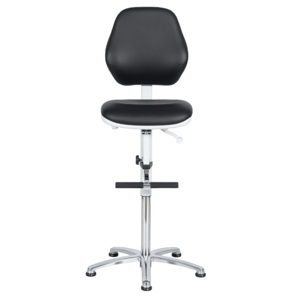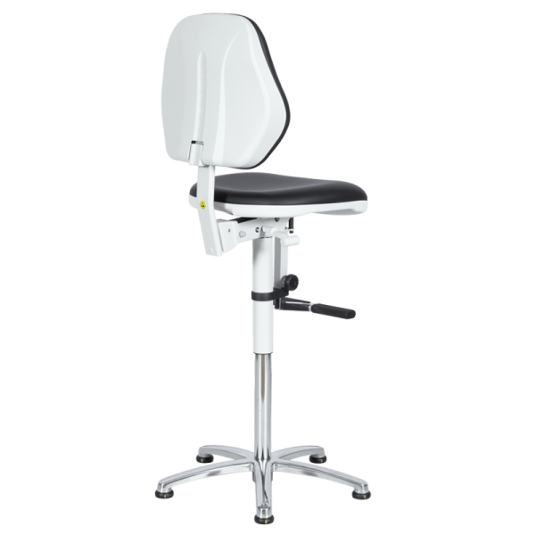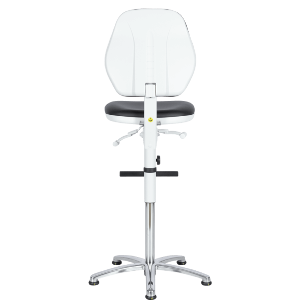 Лабораторен ергономичен стол BIMOS BASIC 3 съчетава ергономичност, антистатична защита и конструктивна устойчивост, специално създадени за чувствителни работни зони като чисти помещения и ESD среди. Ергономичната облегалка с вградена лумбална опора облекчава напрежението в гърба и мускулите и позволява лесна настройка по височина дори в седнало положение. Седалката е оформена с интегрирана тазова опора и заоблен преден ръб, което допринася за здравословна стойка и добро кръвообращение. Всички повърхности на седалката и облегалката са гладки и запечатани, за да предотвратяват задържането на прахови частици дори при постоянен въздушен поток. Специална технология на свързване между синтетичната кожа, пълнежа и основата на тапицерията елиминира риска от отделяне на микрочастици. Всички елементи от конструкцията – включително проводимите колелца, подлакътници и стоманени компоненти – осигуряват типично съпротивление от 10⁶ ома и отговарят на изискванията на EN 61340-5-1 за електростатична защита. Моделът разполага с устойчива 5-лъчева основа от полиран алуминий, устойчива на надраскване, както и капаци от издръжлива пластмаса на седалката и облегалката.