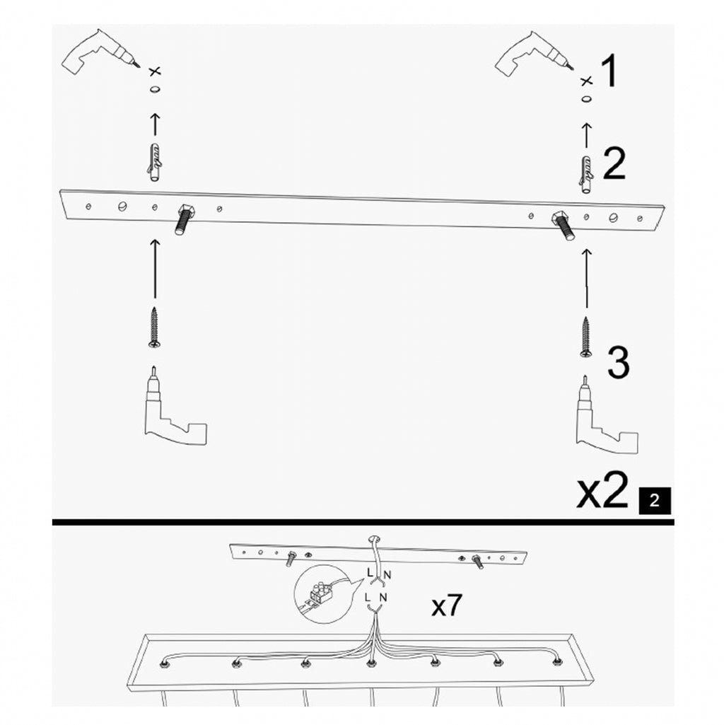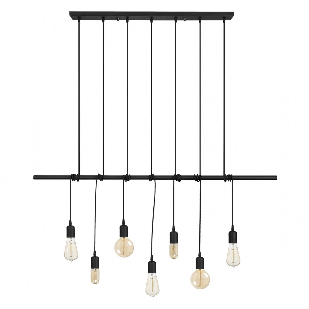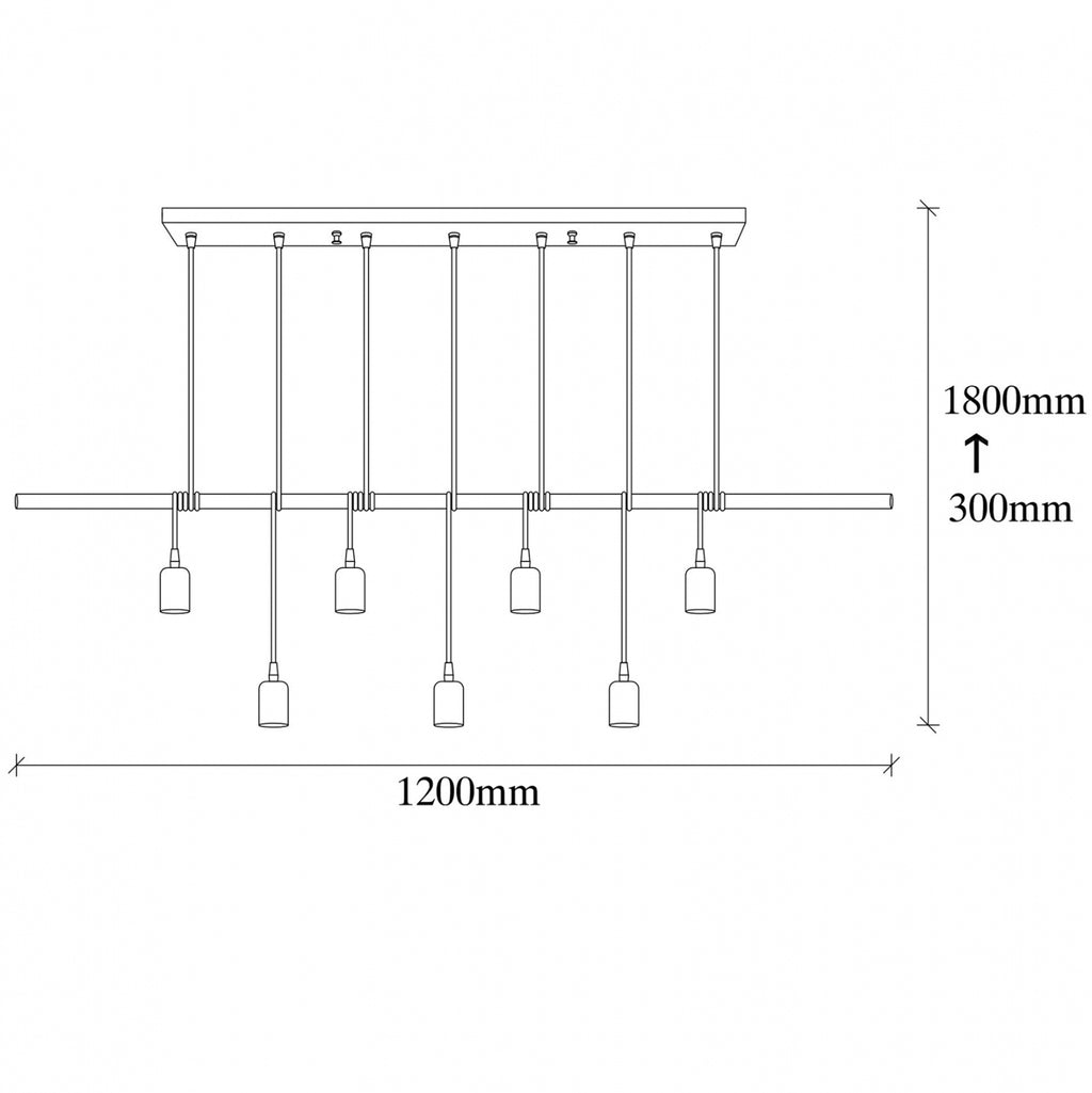 Модерен плафон, изработен от метал, идеален за декорация на модерни професионални и домашни помещения. Уникалният му дизайн го отличава. Лампата се състои от основа, прът, който ви позволява да регулирате височината по ваше желание, в черен абажур и 7 окачвания, които завършват в лампите, също в черно. Приема 7 крушки E27 до 100W, които не са включени в пакета. Размери: 120х10х180см. Цвят на основата: Черен Цвят на окачването: Черен Цвят на лампата: Черен Тип на лампата: Многофункционална лампа Стил: Модерна лампа Техника: Метална електростатична боя Европейско производство и произход. Продуктът се предлага във фабрична опаковка.