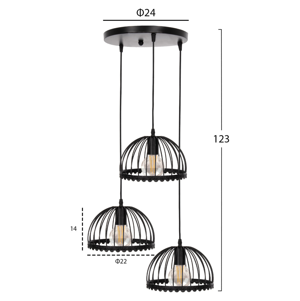 Оставете светлината да се разпространи в пространството с оригинален и елегантен висящ таван с 3 лампи, завършвайки вашата декорация. 3-те красиви лампи във формата на чадър на различни височини са олицетворение на модерния дизайн. ТЕХНИЧЕСКИ ХАРАКТЕРИСТИКИ: Цокъл на крушка: E27 Цокъл с обикновена крушка Тип на крушката: Препоръчва се LED 20w Размери на цокъла: Φ22x14H cm. Размери на основата: Φ24 см. Обща височина: 123 см. (заедно с кабела за окачване) МАТЕРИАЛ НА ИЗРАБОТКА: Цялата лампа е изработена от метал. ПОДДРЪЖКА: Най-важното за тази конкретна лампа е редовното й почистване от прах. Ако имате време, разбира се, използвайте влажна кърпа и я направете да изглежда като нова. *Лампи не са включени в цената