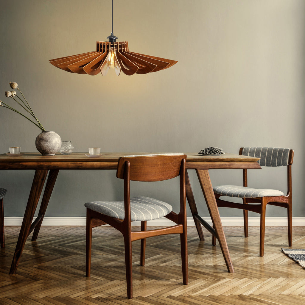 Ако искате да украсите вашето пространство с лампа, която да покрие всички ваши нужди, това е правилният избор. Изработен е изцяло от мдф в нюанс орех. Височината на лампата се регулира в зависимост от начина на поставяне, така че да можете да я конфигурирате на височината, която ви удовлетворява. Осветително бижу, което ще внесе елегантен дизайн и осветление във вашето пространство и ще промени настроението ви към по-добро. Дизайнът и формата му създават ефект, който ще харесате. Перфектен за вашия дом или бизнес. Приема крушка Е27 до 60W, която не е включена в комплекта. Абажур: Орех Размери: Φ52x45H см. Размери на шапката: Φ52x11Y см. Подходяща за лампа E27 max 45-60W европейско производство и произход. Продуктът се предлага във фабрична опаковка.