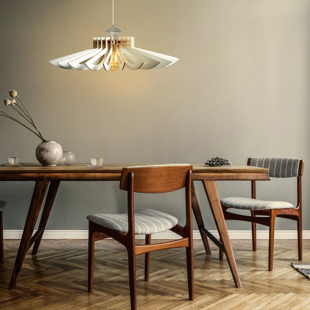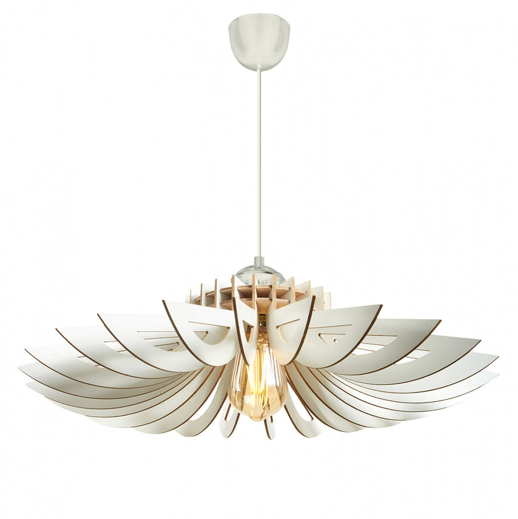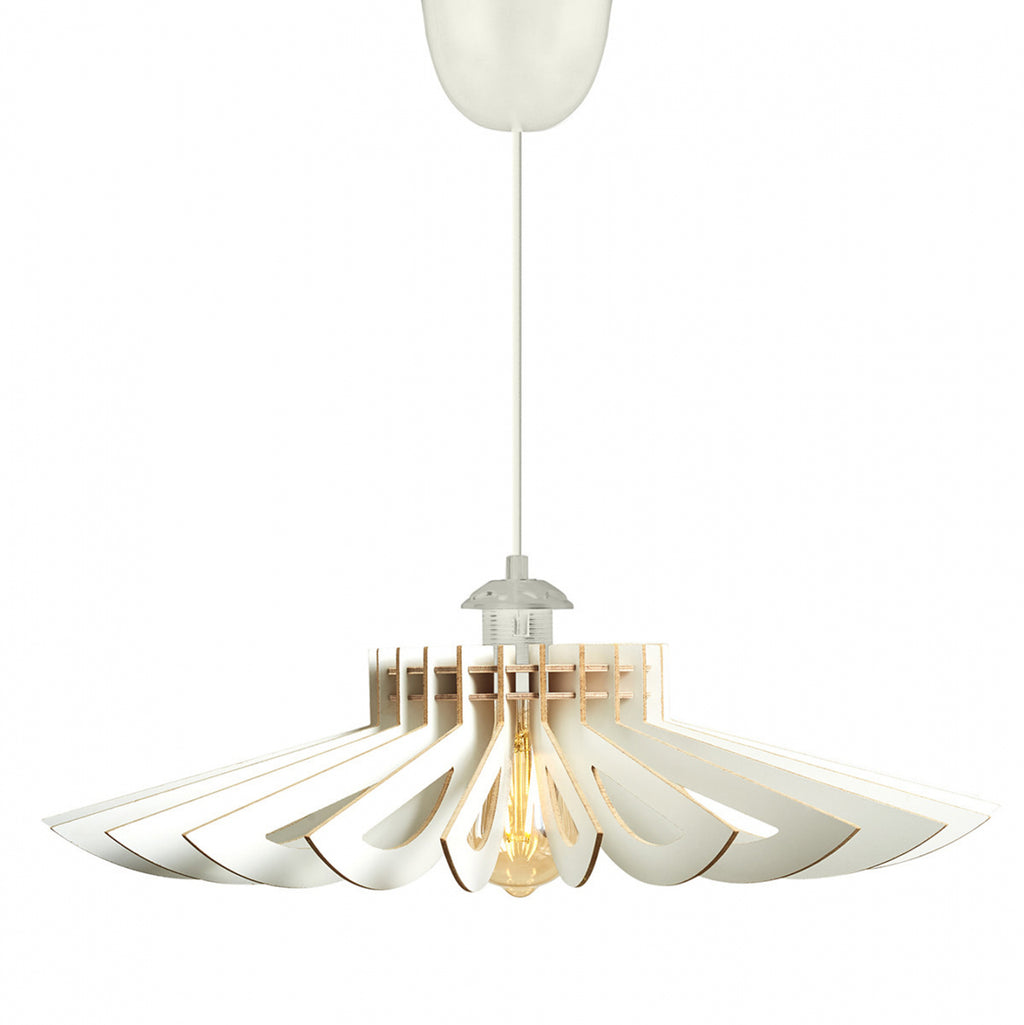 Ако искате да украсите вашето пространство с лампа, която да покрие всички ваши нужди, това е правилният избор. Изработен е изцяло от мдф в бял нюанс. Височината на лампата се регулира в зависимост от начина на поставяне, така че да можете да я конфигурирате на височината, която ви удовлетворява. Осветително бижу, което ще внесе елегантен дизайн и осветление във вашето пространство и ще промени настроението ви към по-добро. Дизайнът и формата му създават ефект, който ще харесате. Перфектен за вашия дом или бизнес. Приема крушка Е27 до 60W, която не е включена в комплекта. Цвят: Бял Размери: Φ52x45H см. Размери на шапката: Φ52x11Y см. Подходяща за лампа E27 max 45-60W европейско производство и произход. Продуктът се предлага във фабрична опаковка в несглобен вид