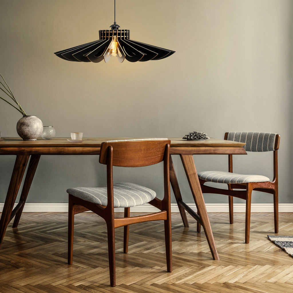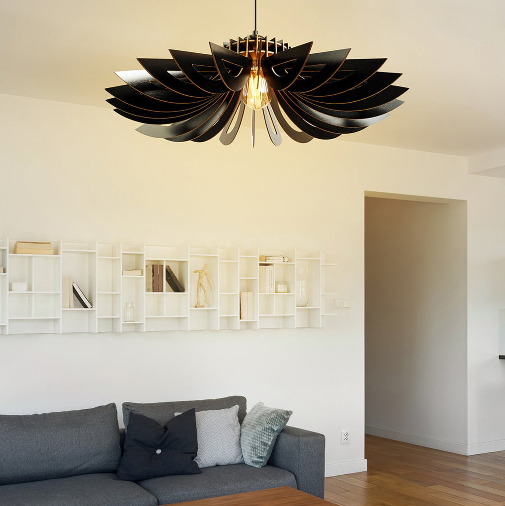 Ако искате да украсите вашето пространство с лампа, която да покрие всички ваши нужди, това е правилният избор. Изработен е изцяло от мдф в черен нюанс. Височината на лампата се регулира в зависимост от начина на поставяне, така че да можете да я конфигурирате на височината, която ви удовлетворява. Осветително бижу, което ще внесе елегантен дизайн и осветление във вашето пространство и ще промени настроението ви към по-добро. Дизайнът и формата му създават ефект, който ще харесате. Перфектен за вашия дом или бизнес. Приема крушка Е27 до 60W, която не е включена в комплекта. Цвят: Черен Размери: Φ52x45H см. Размери на шапката: Φ52x11Y см. Подходяща за лампа E27 max 45-60W европейско производство и произход. Продуктът се предлага във фабрична опаковка.