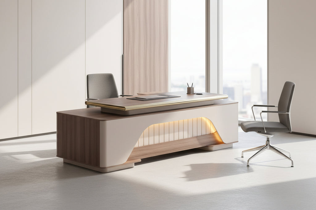 Ъглово бюро SUPERON, ляво, с LED осветление и вградени контакти. Ъгловото бюро SUPERON с ляв ъгъл е модерно и функционално решение за професионални, предимно офис пространства. Дизайнът му съчетава бежов меламин с елегантни детайли в естествен дървесен цвят, създавайки изискан и професионален резултат. Разполага със скрито декоративно LED осветление отпред, което естетически облагородява пространството и му придава модерен характер. Ергономичността е подобрена от овалния отвор в повърхността за лесен достъп и правилна организация на кабелите, както и от 3-те вградени контакта в централната колона на бюрото. Организацията му за съхранение е цялостна и практична, с шкаф от дясната страна без рафтове, шкаф в ъгловата точка без рафтове и 2 чекмеджета в ъгъла, едното от които има 3-цифрена кодова ключалка за повишена сигурност на документи и лични вещи. Характеристики на продукта • Ляво ъглово бюро • Серия SUPERON • Бежов меламин с детайли от естествено дърво • Скрито декоративно LED осветление отпред • 3 вградени контакта в централната колона • Овален отвор за организиране на кабели • Десен шкаф без рафтове • Ъглов шкаф без рафтове • 2 чекмеджета в ъгъла, от които 1 чекмедже с 3-цифрена кодова ключалкаРазмери • Общи размери: 240x180x76H см. Строителни материали • Рамка и повърхности, изработени от висококачествен, издръжлив меламин • Декоративни детайли в естествен дървесен нюанс • Вградено LED осветление с ниска консумация на енергия. Поддръжка • Почиствайте с мека, леко влажна кърпа • Избягвайте използването на силни почистващи или абразивни материали • Подсушавайте повърхността след почистване Предимства • Голяма работна повърхност за комфортна ежедневна употреба • Отлична организация с места за съхранение и чекмеджета • Сигурност на предметите с кодова ключалка • Модерна естетика с вградено LED осветление • Професионален дизайн, идеален за офиси ---***ПРОДУКТЪТ ТРЯБВА ДА СЕ СГЛОБЯВА САМО ОТ КВАЛИФИЦИРАНИ ТЕХНИЦИ***--- ** Цветопредаването на продукта може леко да се различава от фотографското му представяне на вашия екран.