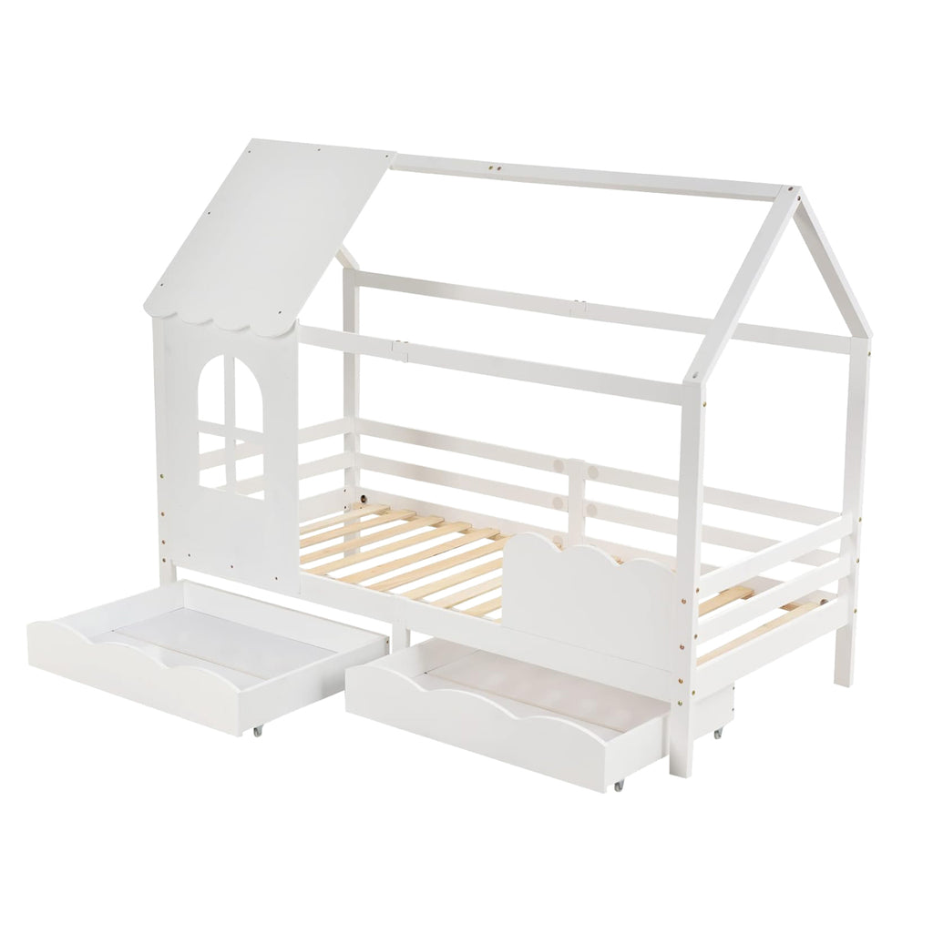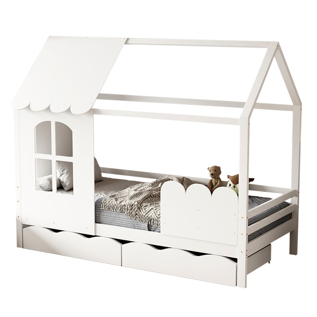 DOMER е и ново детско легло в стил Монтесори, което означава, че е проектирано според образователната система Монтесори, в която децата учат най-добре, когато сами избират какво да правят. Ниската височина на леглото без крака им помага да изследват своята автономност и да влизат и стават свободно от леглото по всяко време. Той е с размери 90х190 см за еднолицев матрак и е отлично качество, модерен и безопасен избор за детската стая. Дървена е в БЯЛ цвят, боядисана с безвреден нетоксичен лак на водна основа, идеална за деца. Матракът е поставен върху дъски от шперплат. Цялото легло е оформено като къщичка с прозорец, което ще придаде приятна, "топла" и закачлива визия на всяка детска стая. Но освен, че е приятно на вид, това легло е и практично, тъй като има 2 големи чекмеджета от долната страна, за да съхранявате всичко необходимо. РАЗМЕРИ: 198x95.5x160H см. РАЗМЕРИ НА МАТРАК: 90х190см. МАТЕРИАЛ ЗА ИЗРАБОТКА: Леглото е изцяло изработено от масивна борова дървесина. Борът е мека, бяла или бледожълта дървесина, която е лека на тегло с прави влакна и е устойчива на свиване, подуване и огъване. ПОДДРЪЖКА: За лесно почистване използвайте влажна кърпа и избършете всички повърхности. Не използвайте силни избелващи средства. *Продуктът се доставя несглобен във фабрична опаковка **Точното цветопредаване на продукта може леко да се различава от действителния продукт поради различните настройки на всеки монитор. ***Матрака не е включен в цената