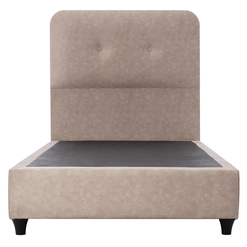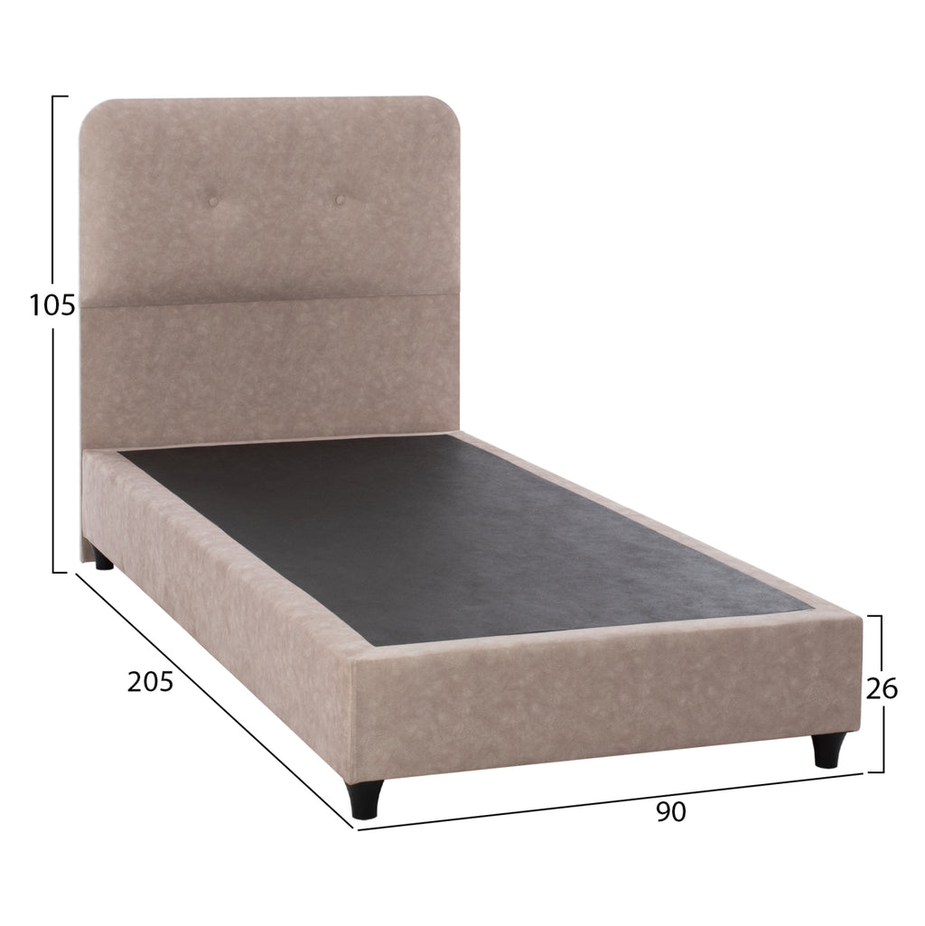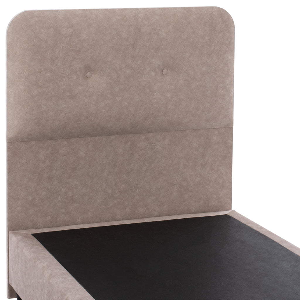 Таблата е висока и декорирана само с 2 копчета, а цялата покривка на леглото е изработена от релефен плат тип NUBUCK. БЕЖОВИЯТ цвят в цялото легло е неутрален и може да се комбинира с различни декоративни мотиви. Основната характеристика на това легло обаче е, че то не следва класическата конструкция с ламелни рамки за опора на матрака, а се състои от непрекъсната повърхност, върху която се поставя матракът! При еднолицев матрак с размери 90х200 см.