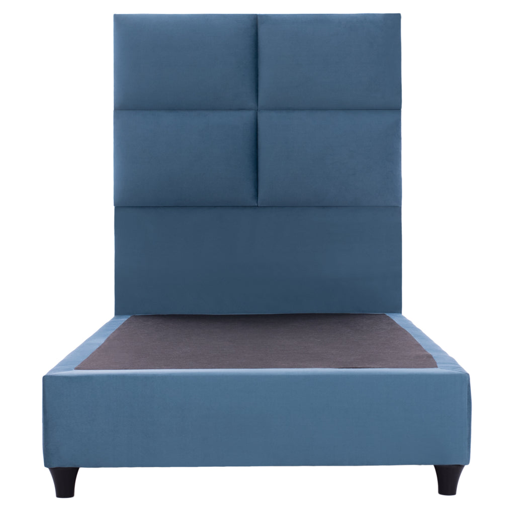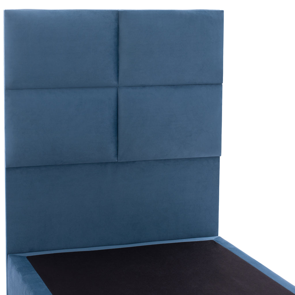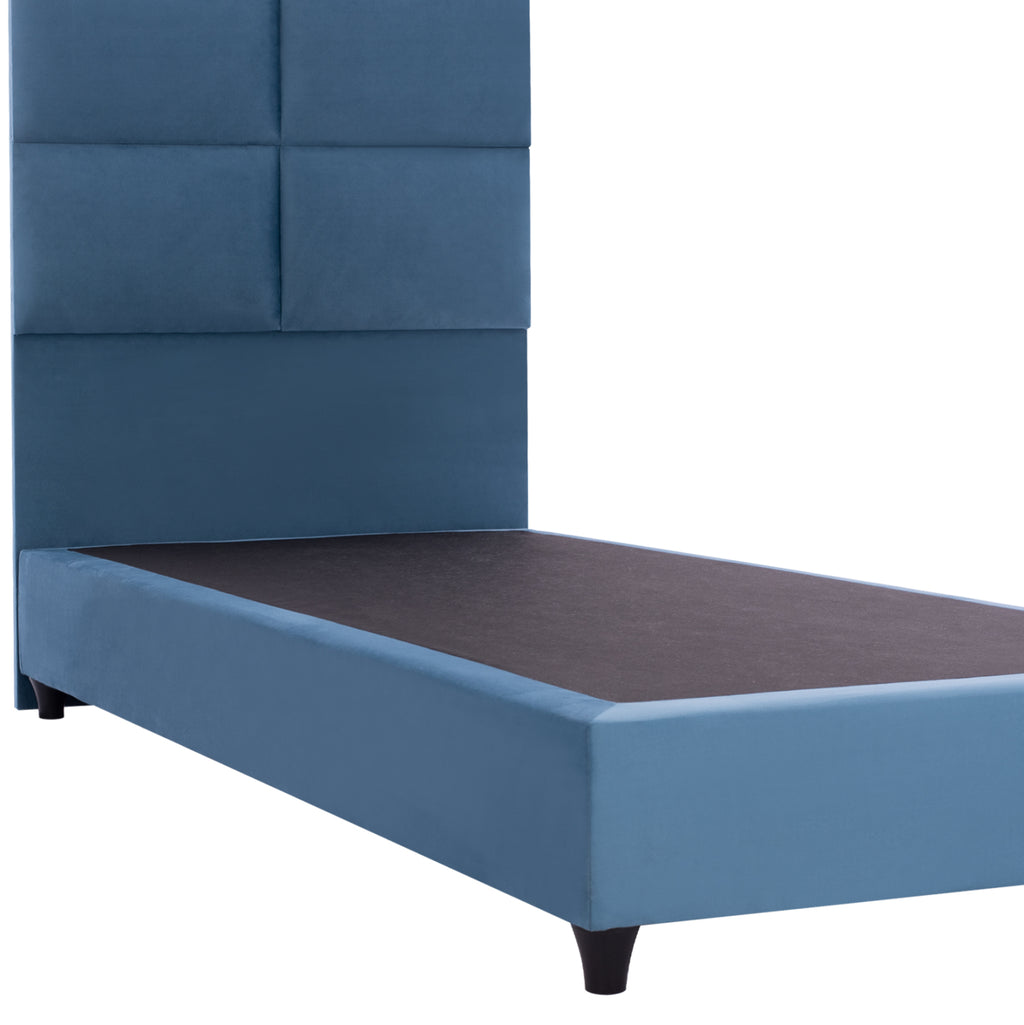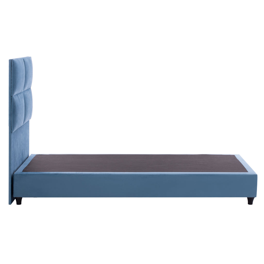 КГ652.09-Легло --- Великият древен поет Омир каза в Илиада, че сънят е цар на всичко. И на хората, и на боговете. Определено можем да ви осигурим "кралски" сън! С легло MILO с неговата 3-ГОДИШНА ГАРАНЦИЯ НА РАМКАТА никога няма да поискате нищо друго. Таблата е висока и тапицирана в ватиран стил в големи правоъгълници, докато цялата покривка на леглото е изработена от кадифена материя. СИНИЯТ цвят в цялото легло е впечатляващ и може да се съчетае с множество декоративни десени. Основната характеристика на това легло обаче е, че не следва класическата конструкция с ламелни рамки за поддържане на матрака, а вместо това се състои от непрекъсната повърхност (ПДЧ), върху която се поставя матракът! При еднолицев матрак с размери 90х200 см.