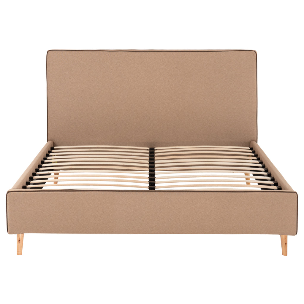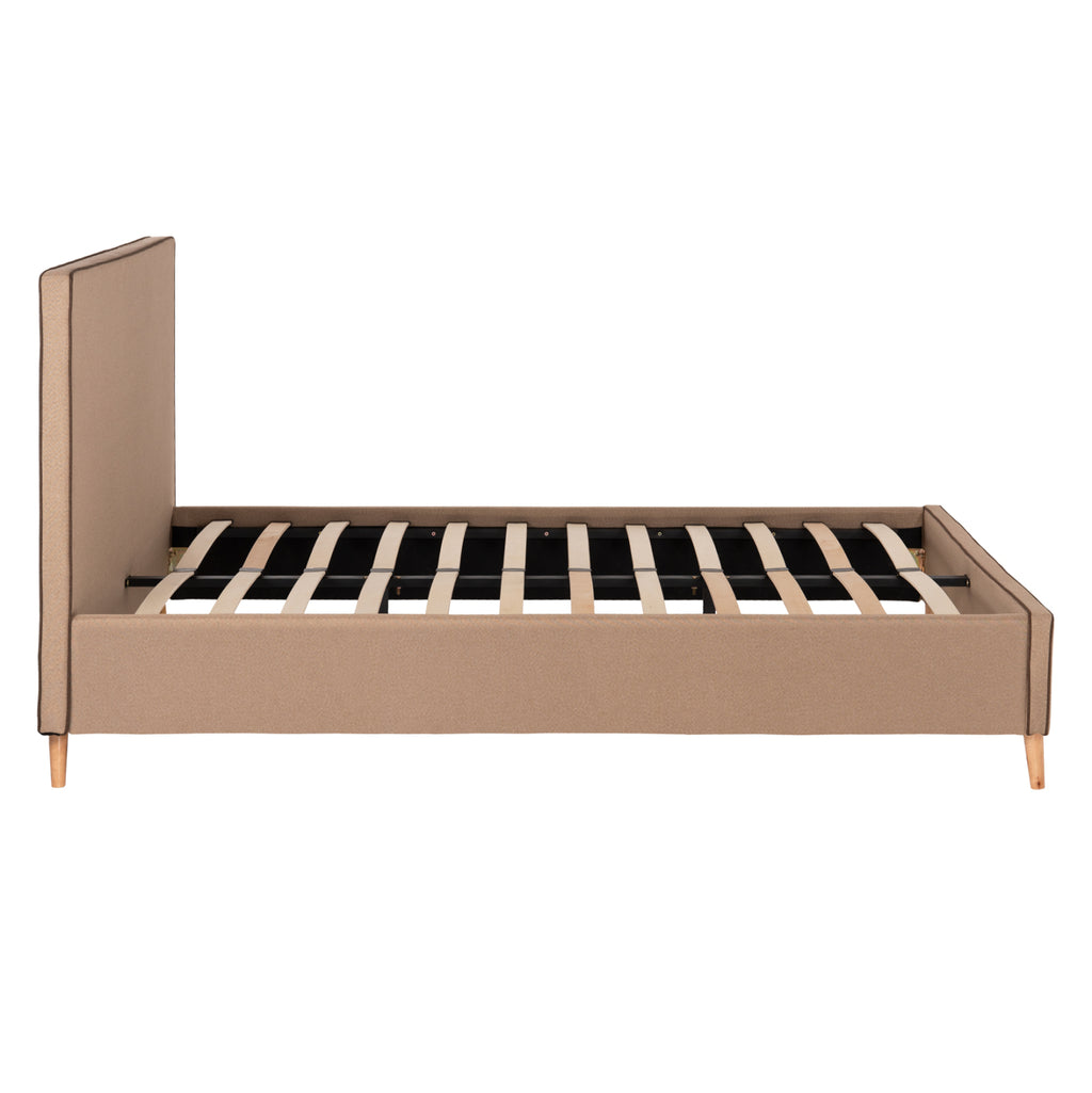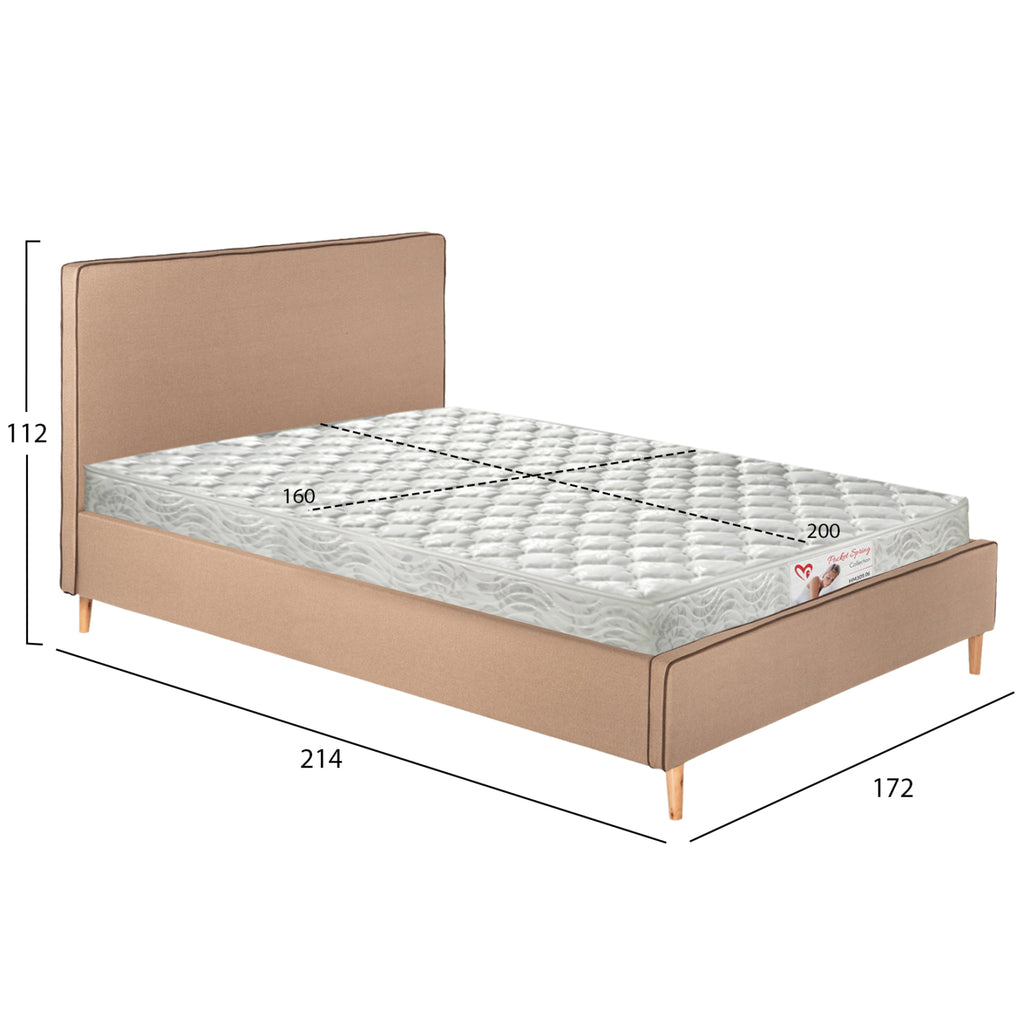 Леглото INDRA king-size е тапицирано с БЕЖОВА дамаска с КАФЯВ кант по шевовете. Матракът, който придружава леглото, е поставен върху два реда анатомични летви, двулицев е и е с технология на джобни пружини (независими пружини). Краката са дървени в естествен цвят. РАЗМЕРИ: 172x214x112H см. Височина на долната част: 31 см. Размери на матрака: 160x200 см.----- Височина на матрака: 19 см. ПОДДРЪЖКА: Достатъчно е да се почисти прахът и да се забърше с влажна кърпа. *Продуктът се доставя несглобен във фабрична опаковка, с инструкции за монтаж. ** Цветопредаването на продукта може леко да се различава от фотографското му изображение на вашия екран.
