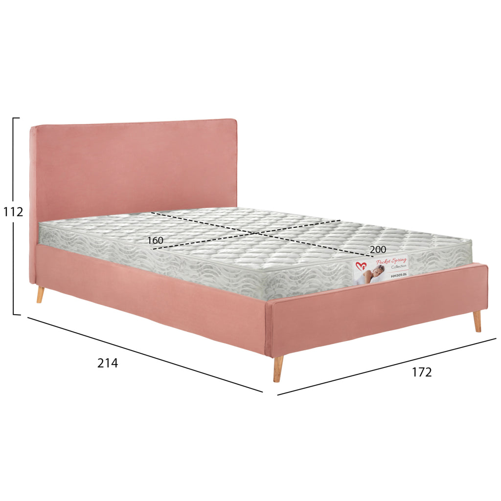 Леглото INDRA king-size е тапицирано с кадифе ROTTED APPLE със същия кант по шевовете. Матракът, който придружава леглото, е поставен върху два реда анатомични летви, двулицев е и е с технология на pocket springs (независими пружини). Краката са дървени в естествен цвят. РАЗМЕРИ: 172x214x112H см. Височина на таблата: 31 см. Размери на матрака: 160x200 см.----- Височина на матрака: 19 см. ПОДДРЪЖКА: За да поддържате кадифето чисто и пухкаво, е добре да го почиствате веднъж седмично с прахосмукачка. Поставете мека четка, настройте деликатната програма на прахосмукачката си и изметете цялата повърхност по посока на влакната. Ще видите, че прахът веднага ще бъде отстранен и косъмът на плата ще стане като нов. При никакви обстоятелства не трябва да търкате кадифена материя. Дори ако трябва да премахнете петно, не го търкайте. Намокрете мека кърпа с вода и потупайте локално върху петното. *Продуктът се доставя несглобен във фабрична опаковка, с инструкции за сглобяване. ** Цветопредаването на продукта може леко да се различава от фотографското му представяне на вашия екран.