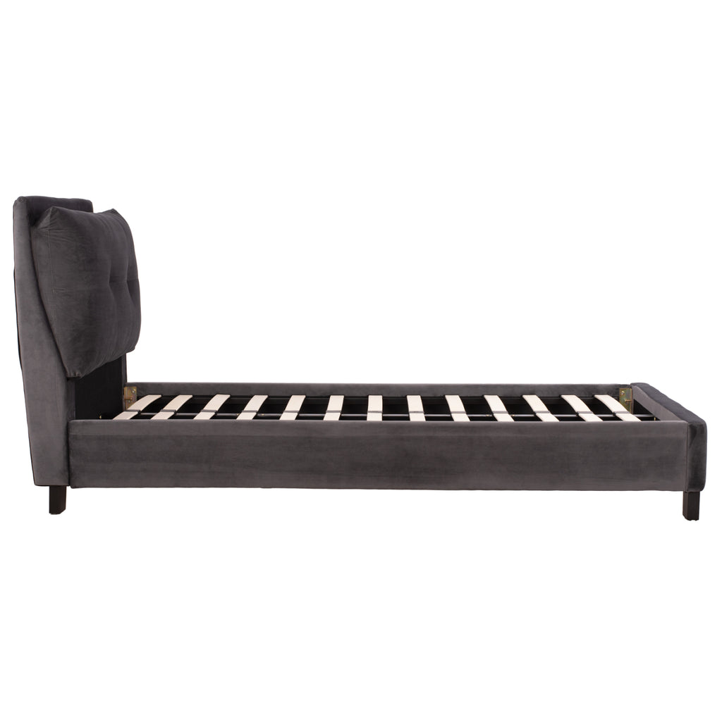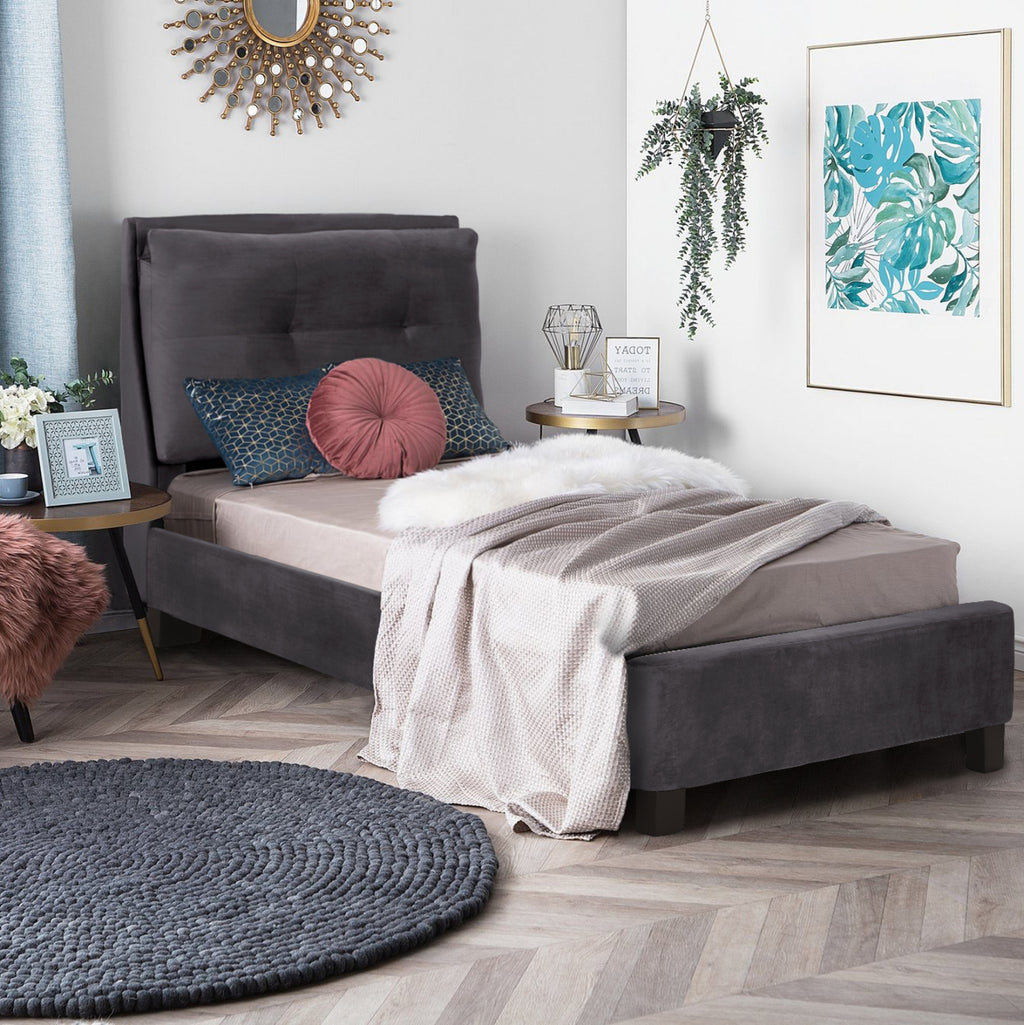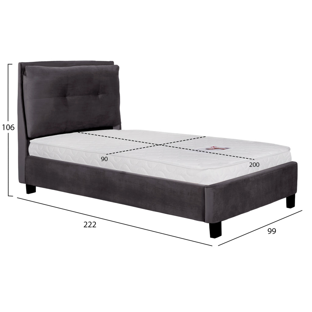 Единичното легло RILEY е тапицирано със СИВ кадифе. Матракът (предлага се с РОЛНО ПАКОВАНЕ*), който придружава леглото, е поставен върху два реда анатомични летви, двулицев е и е от ПЯНА без пружини. Краката са сравнително високи, изработени от полипропилен в черно. *Ролното опаковане означава, че го разгъвате върху леглото си и го оставяте за около 48 часа, докато достигне правилната си форма чрез абсорбиране на въздух и е готово за употреба. РАЗМЕРИ: 99x222x106H см. Височина на страните и таблата: 34 см. Височина на таблата: 10 см. Размери на матрака: 90x200 см.----- Височина на матрака: 15 см. ПОДДРЪЖКА: За да поддържате кадифето чисто и пухкаво, е добре да го почиствате веднъж седмично с прахосмукачка. Прикрепете мека четка, настройте деликатната програма на прахосмукачката си и изметете цялата повърхност по посока на влакната. Ще видите, че прахът веднага ще бъде отстранен, а косъмът на плата ще стане като нов. При никакви обстоятелства не търкайте кадифена материя. Дори ако е необходимо да премахнете петно, не го търкайте. Намокрете мека кърпа с вода и потупайте локално върху петното. *Продуктът се доставя несглобен във фабрична опаковка, с инструкции за сглобяване. ** Цветопредаването на продукта може леко да се различава от фотографското му представяне на вашия екран.