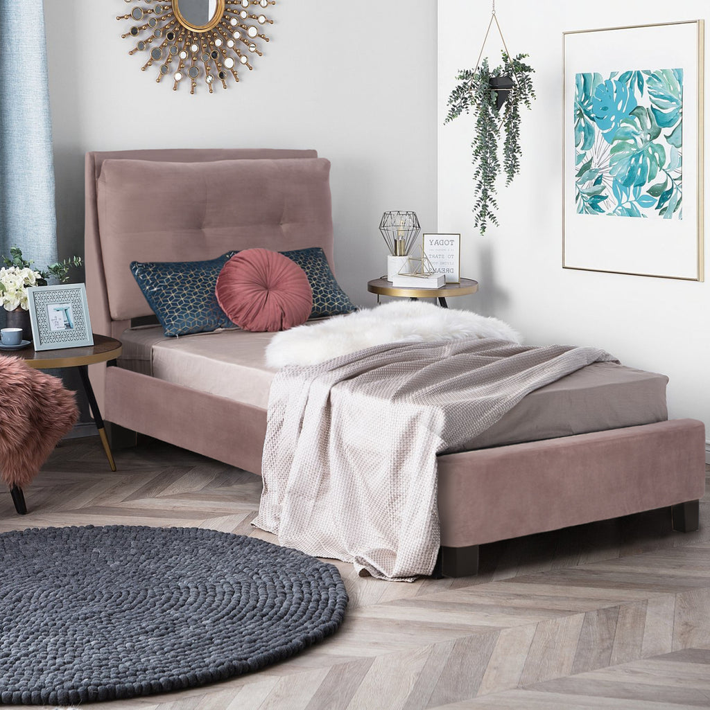 Единичното легло RILEY е тапицирано с кадифе в цвят ROTTED APPLE. Матракът (предлага се с ROLL-PACKING*), който придружава леглото, е поставен върху два реда анатомични летви, двулицев е и е от ПЯНА без пружини. Краката са сравнително високи, изработени от полипропилен в черен цвят. *Опаковането на руло означава, че го разгъвате върху леглото си и го оставяте за около 48 часа, докато достигне правилната си форма чрез абсорбиране на въздух и е готово за употреба. РАЗМЕРИ: 99x222x106H см. Височина на страните и таблата: 34 см. Височина на таблата: 10 см. Размери на матрака: 90x200 см.----- Височина на матрака: 15 см. ПОДДРЪЖКА: За да поддържате кадифето чисто и пухкаво, е добре да го почиствате веднъж седмично с прахосмукачка. Прикрепете мека четка, настройте деликатната програма на прахосмукачката си и изметете цялата повърхност по посока на влакната. Ще видите, че прахът веднага ще бъде премахнат и ворсатът на плата ще стане като нов. При никакви обстоятелства не търкайте кадифена материя. Дори ако трябва да премахнете петно, не го търкайте. Намокрете мека кърпа с вода и потупайте локално върху петното. *Продуктът се доставя несглобен във фабрична опаковка, с инструкции за сглобяване. ** Цветопредаването на продукта може леко да се различава от фотографското му представяне на вашия екран.