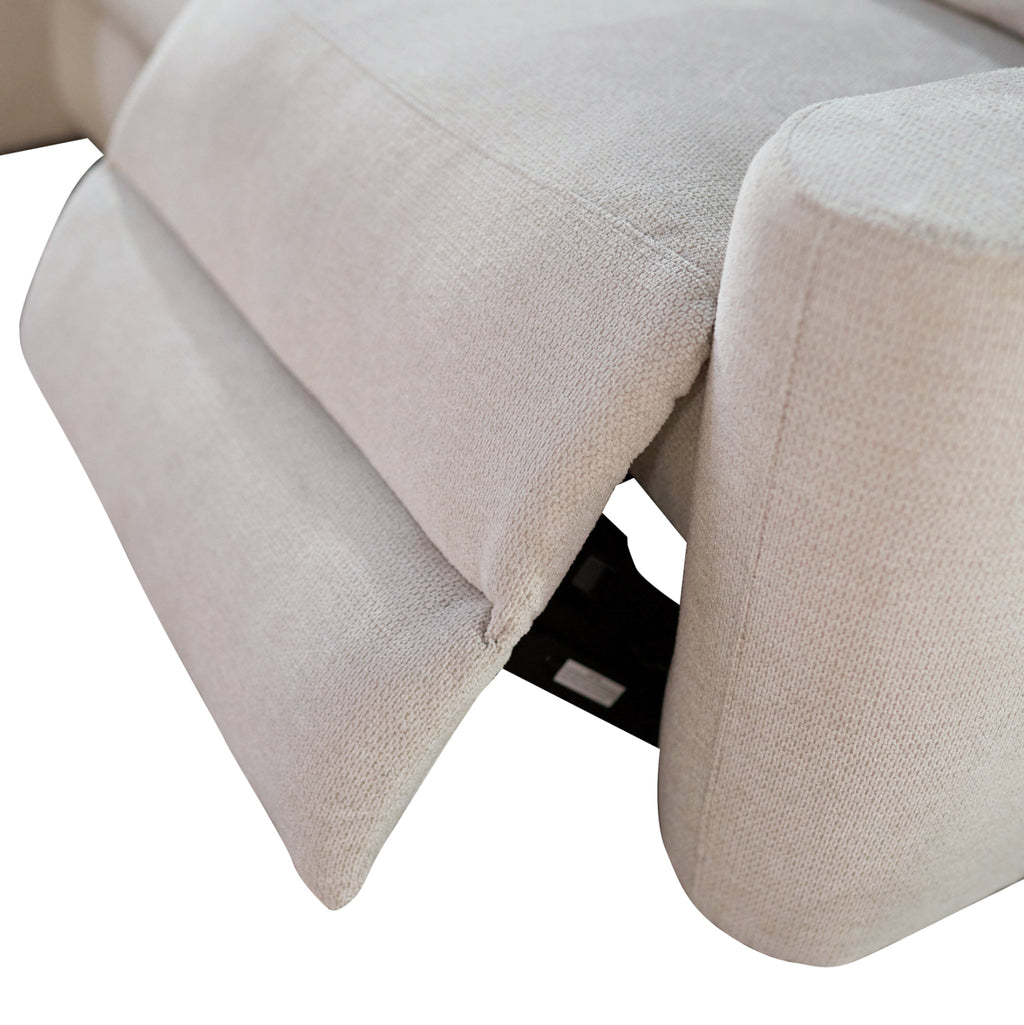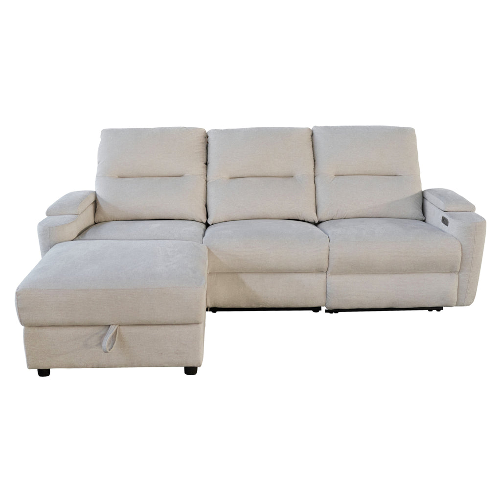 3-местен ляв ъглов диван SYNTHIA, бежов плат, с електрически фотьойл, място за съхранение и падаща масичка
