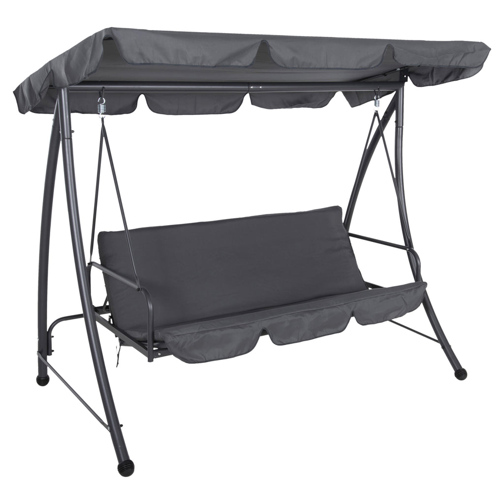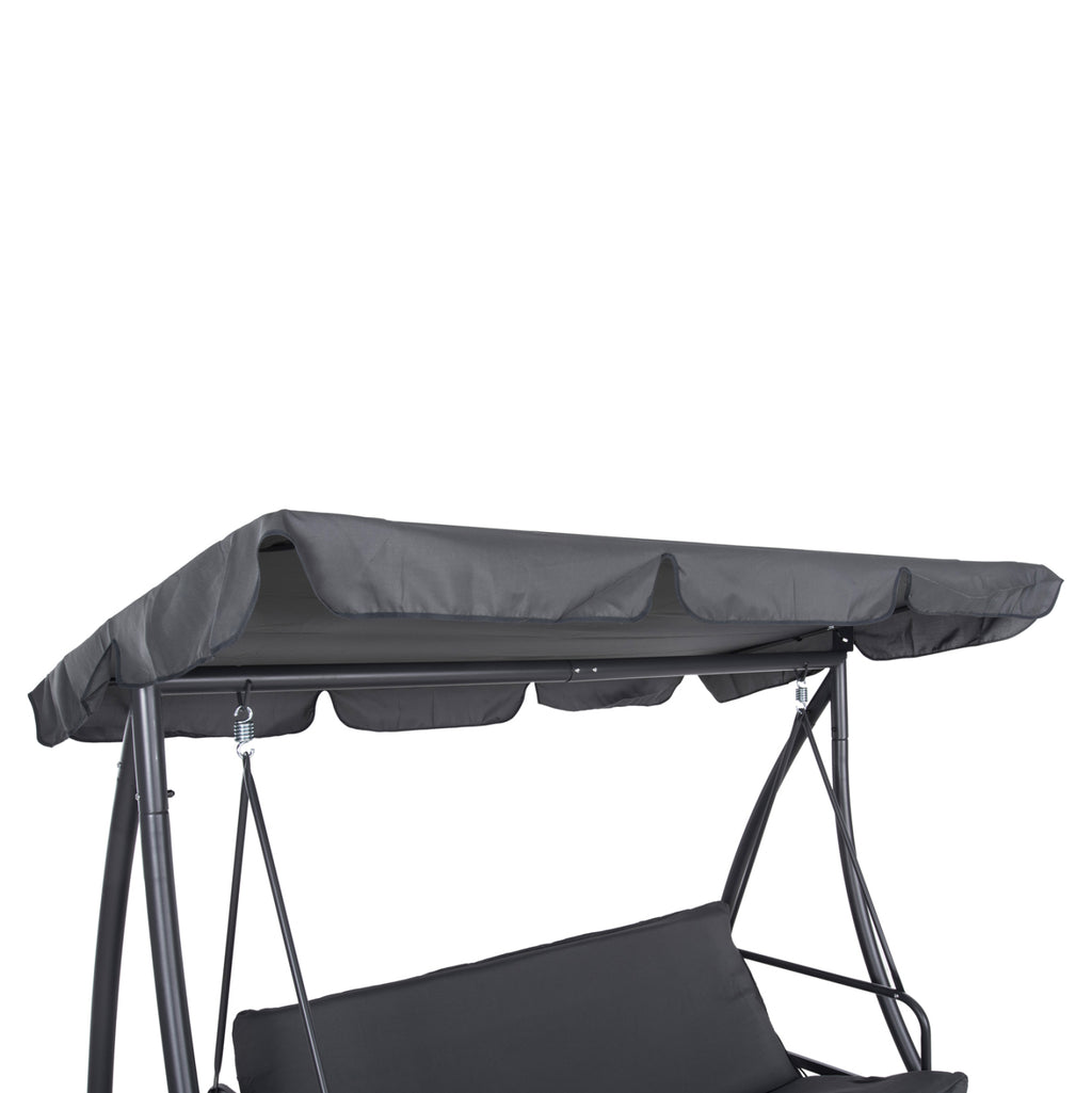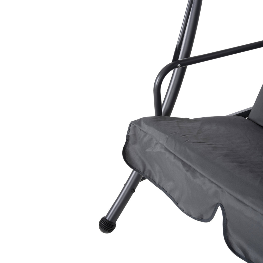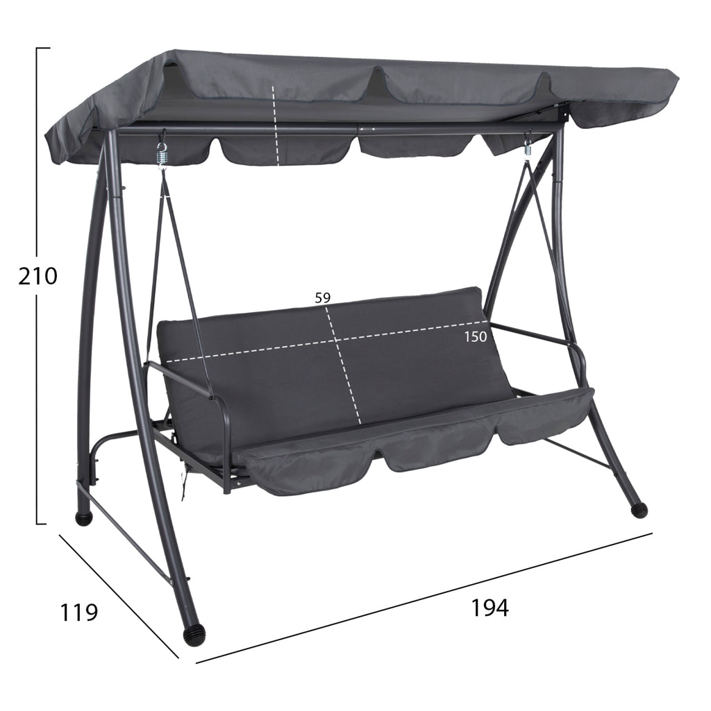 Тази 3-местна градинска люлка LIKID е изработена от подсилен метал, боядисан с електростатична боя, което я прави изключително устойчива на външни условия. Цветът на конструкцията е модерен сив, който се комбинира чудесно с тапицерията на възглавниците и сенника. Седалките са тапицирани с 140 g полиестерна тъкан и пълнеж от пяна с дебелина 6 см, осигурявайки мекота и удобство.
