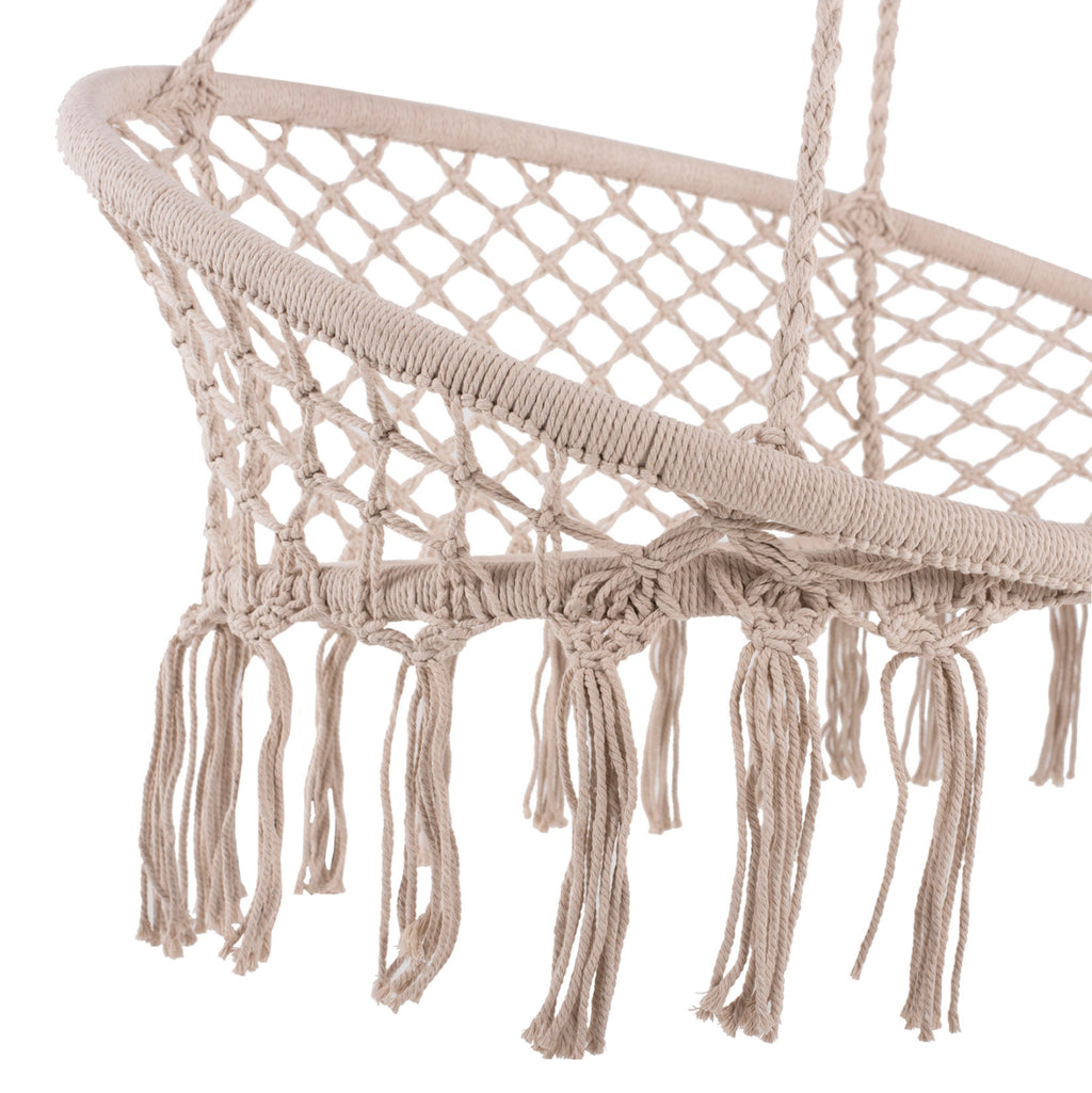 Красивото 2-местно висящо гнездо NEENA е новото попълнение в нашата гама. През цялото време висящите гнезда са олицетворение на безгрижието и спокойствието. Предлагаме ви окачен диван с ресни в стил NEENA, изработен от дебело плетено въже от макраме и цвят БЕЖОВ! Рамката на висящото гнездо е изработена от подсилен метал и можете да го закачите както от една точка, така и от две. РАЗМЕРИ: 130x67x120-140H см. Размери на седалката: 110х66 см. КОНСТРУКТИВНИ МАТЕРИАЛИ: Рамката на гнездото, покрита с въже за макраме, е изработена от подсилен метал. За това специфично гнездо е използвано синтетично въже в стил макраме. Макраме е вид текстил, при който не се тъче на стан или се плете с игли или плетене на една кука, а само се възли с ръце. Това е прекрасното на това изкуство, защото човек може да твори при всякакви условия, без сложни съоръжения, оборудване и подготовка. В повечето текстове се споменава, че изкуството макраме е родено в арабските страни, около 13 век сл. Хр. ПОДДРЪЖКА: Всичко, от което се нуждае висящото гнездо, е почистване от прах и при необходимост почистване с влажна кърпа. Макрамето също може да се мие под течаща вода и да се суши на въздух. ПРЕДИМСТВА: •Здрава конструкция •Качествени строителни материали •Размери за 2 човека •Невероятен дизайн