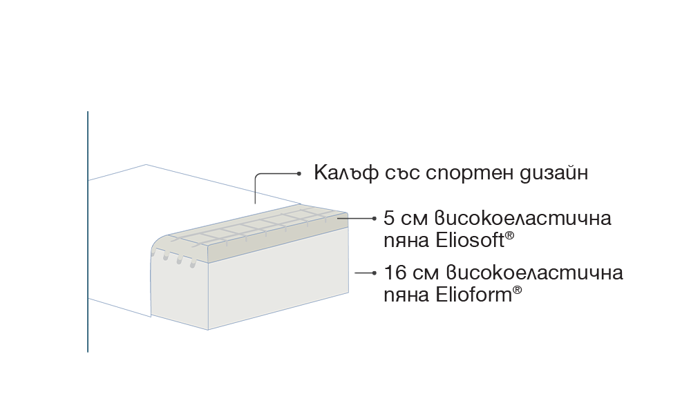 Пяната Eliosoft е умеренотвърда. Тя отнема напрежението от гръбначния стълб и подпомага възстановяването по време на сън.