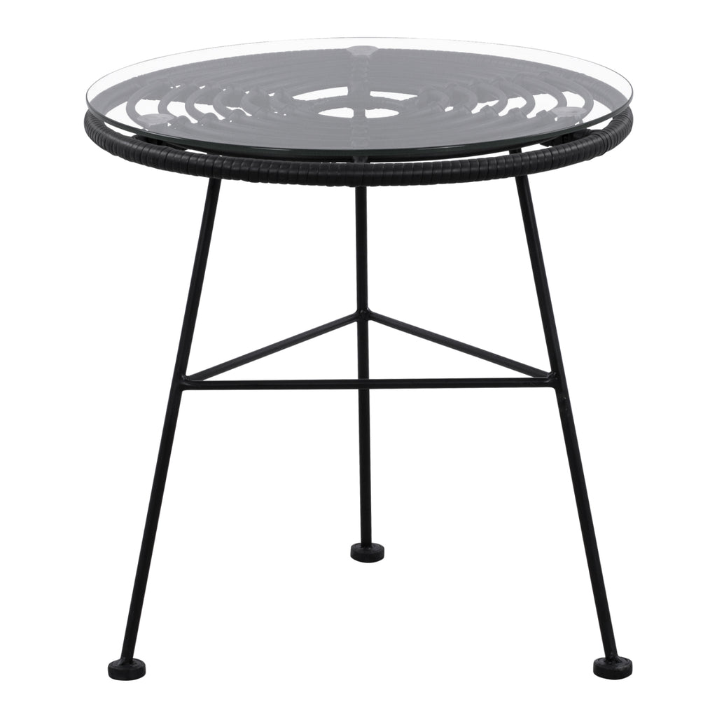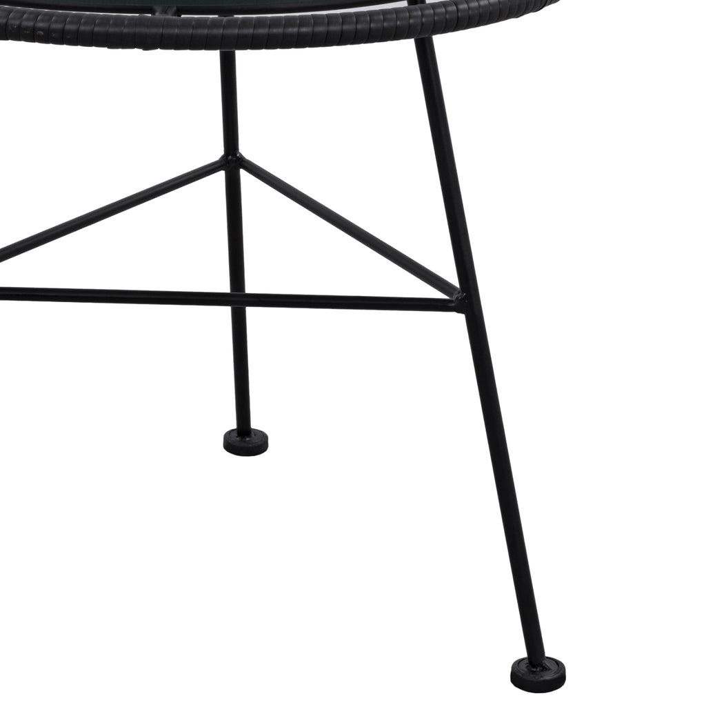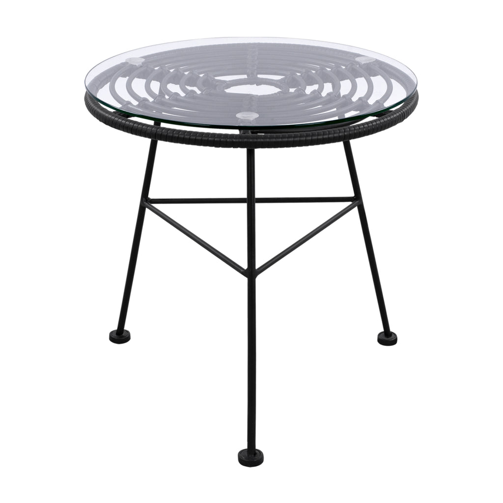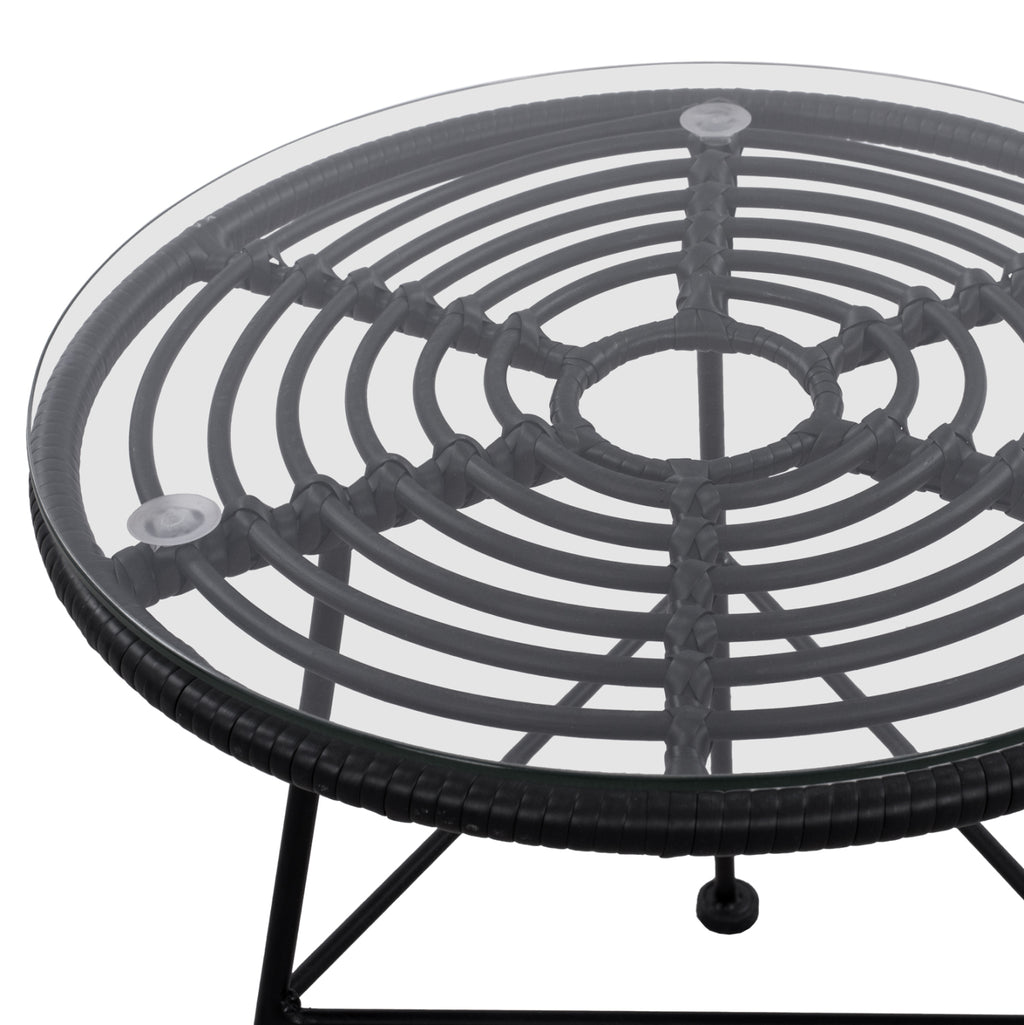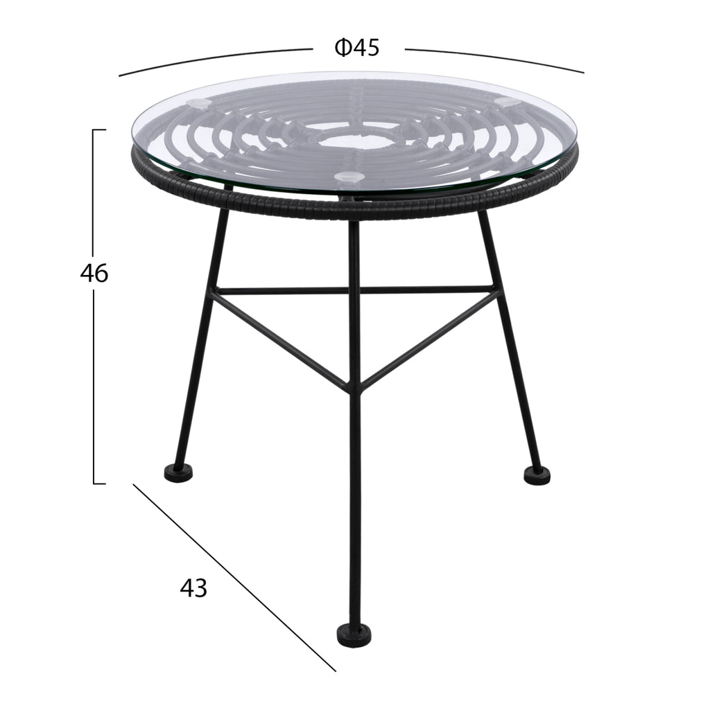 Модерна външна и вътрешна маса, изработена от метална конструкция в черен нюанс и повърхност, покрита с тъкана ракита в черен нюанс. Има и стъклена повърхност. Ракитата има голяма устойчивост на високи и ниски температури от (-85c до +85c.), обогатена е и с UV стабилизатор за слънчевите лъчи. Идеален за заведения и за вашия дом. Размери: Φ45 см. Височина на масата: 46см. Размери на крака: 43х43см.