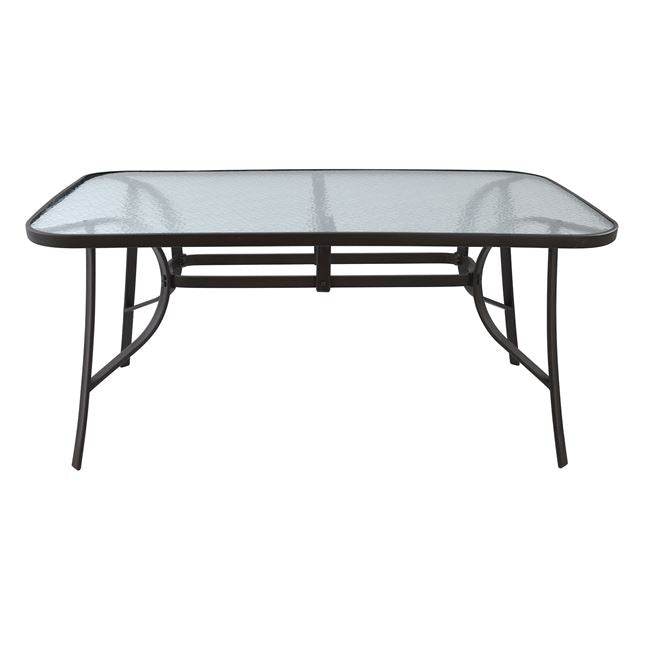 Външна метална маса с вградено безопасно стъкло (обезопасена). Размери: 160х90х72см. Цвят: Кафяв Име: Бруно Продуктът се доставя разглобен (несглобен). Лесен за сглобяване. В комплекта са включени всички необходими компоненти за сглобяването му.