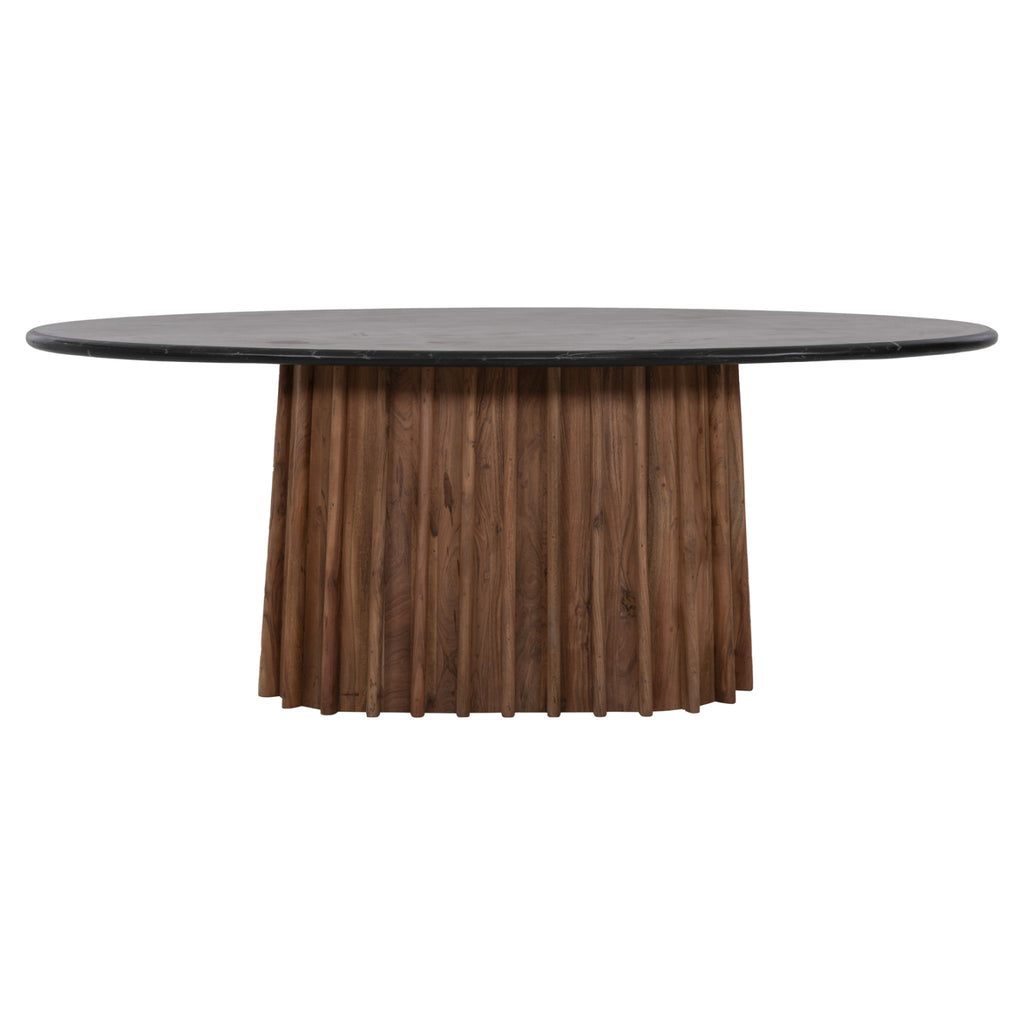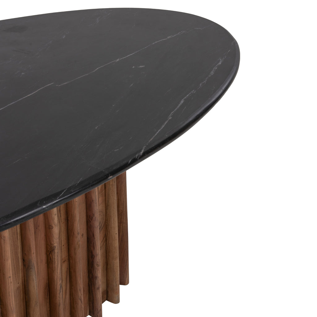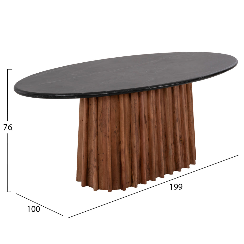 DRAXX е красива голяма овална маса за хранене с повърхност ЧЕРЕН МРАМОР. Тази повърхност лежи върху централен стълб с конична овална форма от качествено масивно дърво, майсторски издялано. Тази впечатляваща маса ще надгради естетически вашата трапезария, като същевременно може да се съчетае с много различни стилове и цветове в околното пространство, както и различни стилове столове. РАЗМЕРИ: 200x100x76Y см. МАТЕРИАЛИ НА КОНСТРУКЦИЯТА: Овалната колона е изработена от пясъкоструйно масивно дърво AKAKIAS. Когато говорим за масивно дърво, имаме предвид дървета, направени изцяло от ствола на дърво. Масивната дървесина е най-скъпият избор по отношение на дървесината, но се откроява със своята вечна естетика. Ефектът, който предлага на притежателя си е наистина уникален. Пясъкоструенето предлага усещането за добре запазена древност на дървото. Акациевото дърво е един от най-добрите видове дървесина на пазара. Неговата механична якост и механични свойства се доближават до тези на други добре познати дървесини като бук, дъб, афцелия, тик и др. Има висока биологична устойчивост, т.е. проявява отлична устойчивост на действието на микроорганизми, които могат да разрушат материала и конструкцията. * Съществуващите пукнатини или тези, които могат да се появят с течение на времето, се дължат на свиването-разширяването на живия организъм, наречен масивно дърво, и не са производствен дефект. Също така, може да има цветови вариации и разлики в размерите на продукта поради размерите на обработената дървесина. Това не са дефект на продукта. ПОДДРЪЖКА: Масата не се нуждае от специална поддръжка. Достатъчно е минаване с влажна кърпа, а ако има петна с нежен спрей от многото на пазара. Като цяло, дори и при петна, тайната е бързото почистване, преди дървото да има време да се "напои". Същото важи и за мрамора. *Доставя се несглобен във фабрична опаковка ** Цветопредаването на продукта може леко да се различава от фотографското представяне на вашия екран.