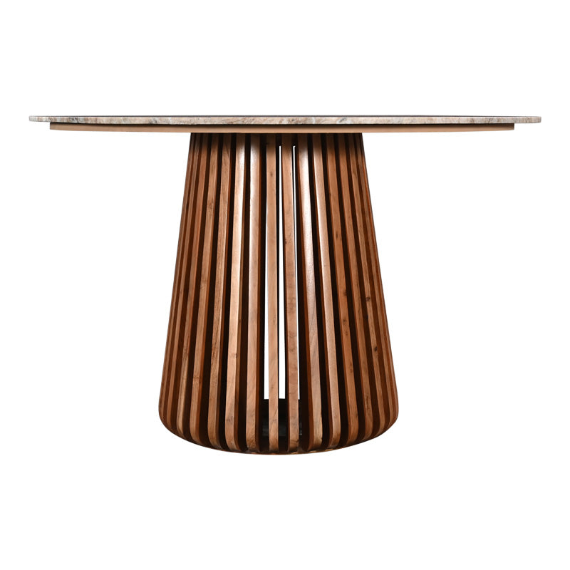 Търсите стилна, модерна и функционална маса за хранене? Трапезната маса Mable е точно това, което търсите. Маса, която не само ще украси вашето пространство, но и ще внесе освежаващ нов дъх в стаята ви. Технически характеристики: Основа: Изработена от масивно акациево дърво с изключително висока издръжливост и устойчивост в естествен цвят. Повърхност: Изработена от висококачествен мрамор. Мраморният ефект със своите зашеметяващи жилки ще привлече всяко око. Размери на продукта: Дължина: 120 см Ширина: 120 см Височина: 76 см Информация за материала: Акациево дърво: Акациевото дърво е твърдо и устойчиво на износване, което го прави идеално за мебели и употреба на открито. Известен е със своята издръжливост, красотата на естествения си цвят и устойчивостта си. Той се използва широко в изграждането на мебели, подови настилки, работни повърхности и външни структури като градини и балкони. Мрамор: Мраморът е метаморфна седиментна скала, получена от варовик. Състои се основно от калциев карбонат (CaCO3) или комбинация от калциев карбонат и доломит. Освен използването му в сгради и скулптури, той намери уникално място в света на мебелите. Неговата естествена красота, издръжливост и луксозно усещане го правят идеален материал за създаване на уникални и вечни мебели. Инструкции за поддръжка: Акациево дърво: За поддръжка се препоръчва почистване със сапун и вода и редовно нанасяне на продукти за защита на дървото, за да се запази естественият му вид и издръжливост. Мрамор: Редовно почиствайте вашите мраморни мебели с мека, влажна кърпа и мек почистващ препарат, специално предназначен за мрамор. Избягвайте киселинни почистващи препарати, тъй като те могат да повредят повърхността. Избягвайте триенето и използването на агресивни препарати, тъй като те могат да надраскат мраморната повърхност. Освен това избягвайте да поставяте горещи предмети директно върху мрамора, тъй като внезапните температурни промени могат да причинят пукнатини. Забележки: Продуктът се доставя несглобен във фабрична опаковка с подробно ръководство за монтаж. Цветовият нюанс на продукта може леко да се различава от това, което се показва на вашия екран.